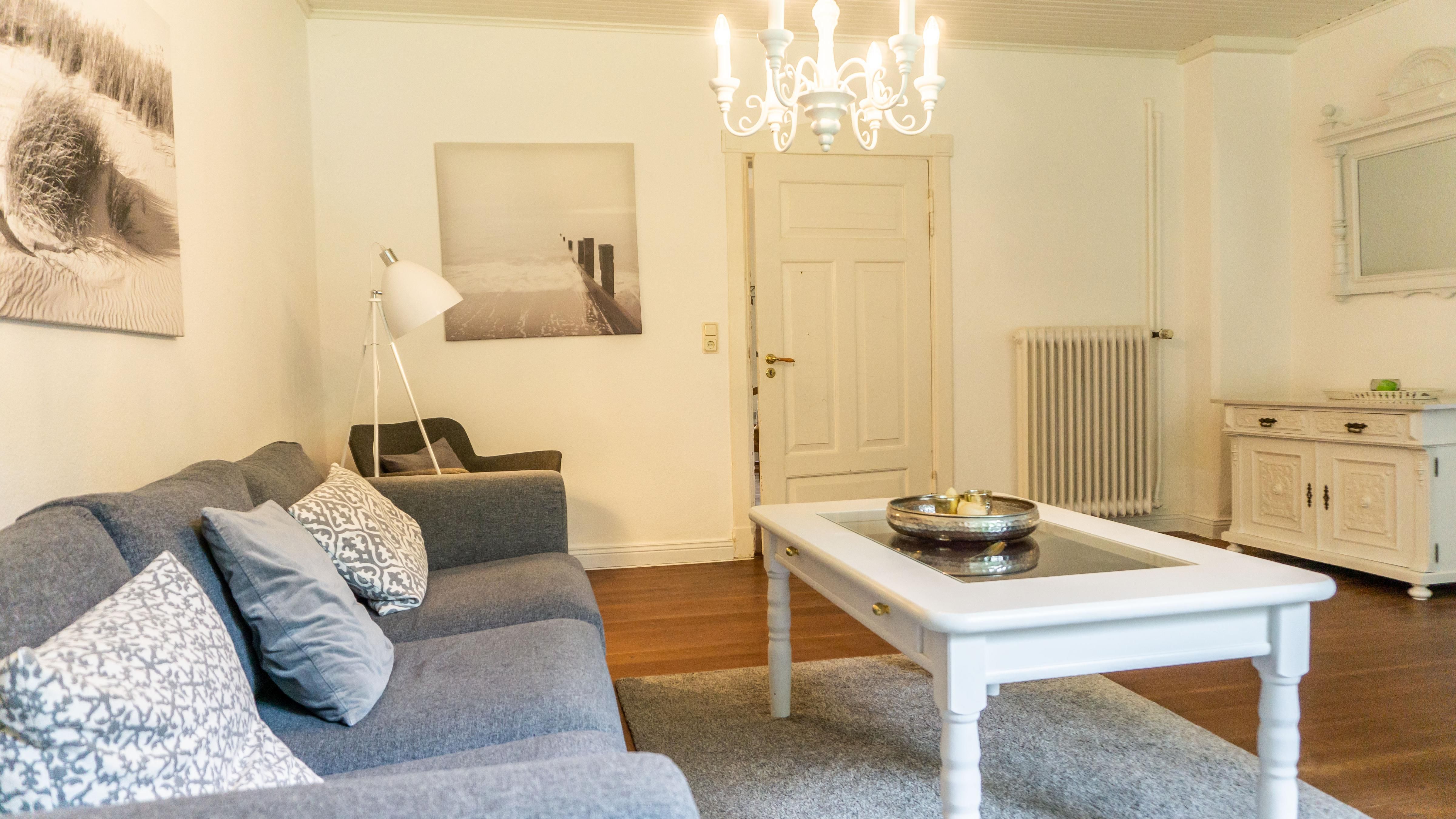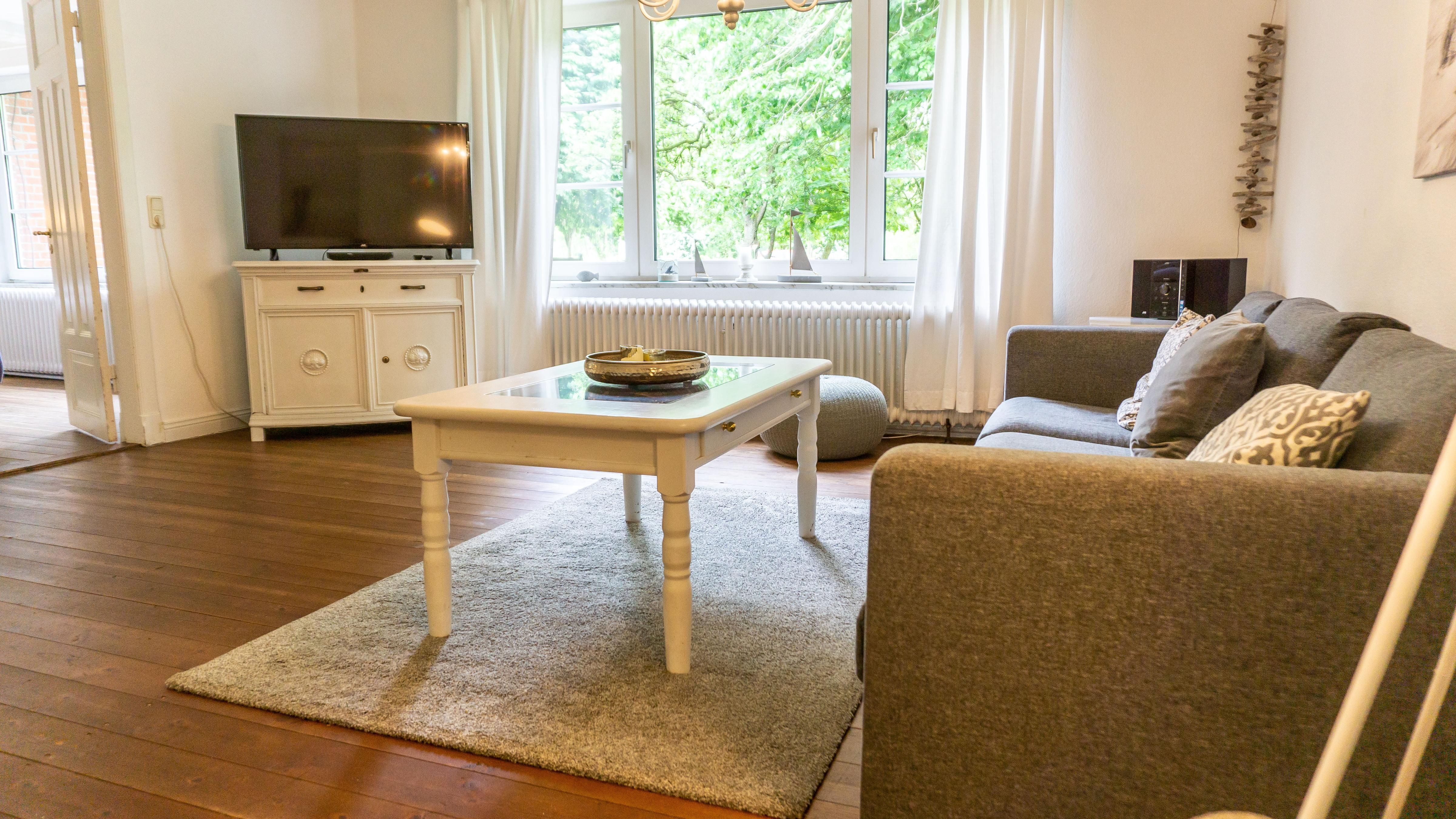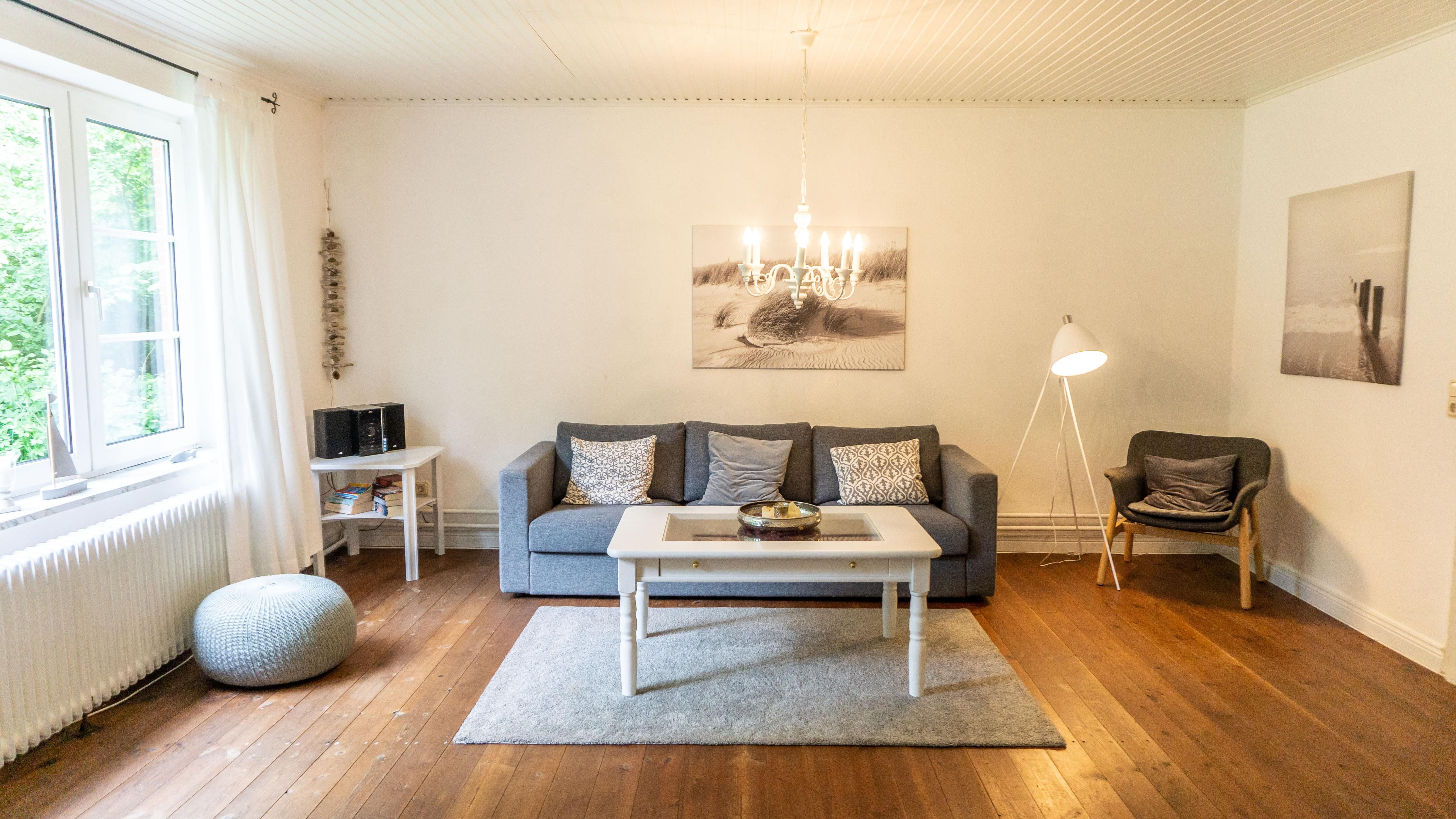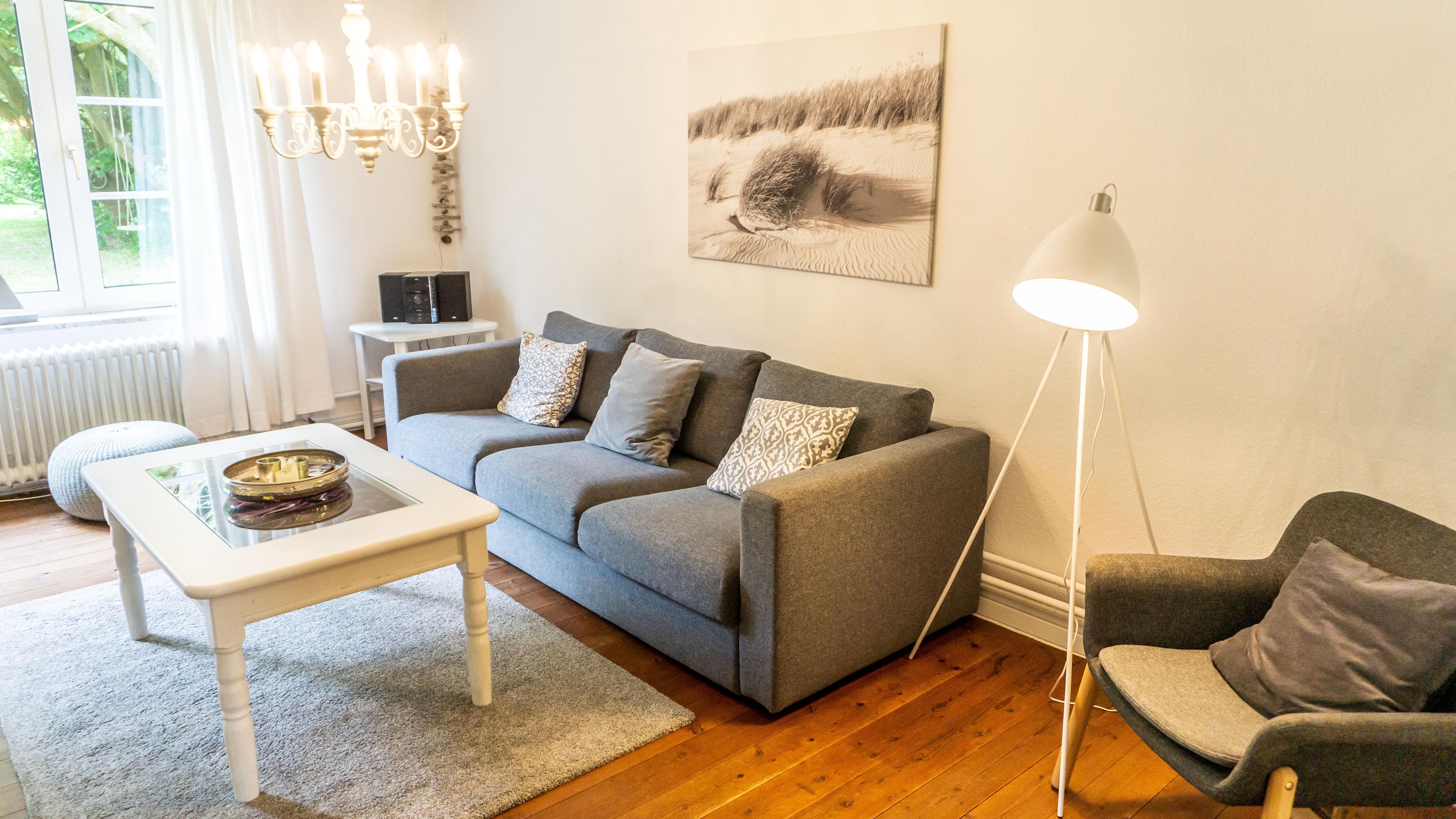 Das helle Wohnzimmer lädt mit einem bequemen Sofa und einem Sessel zum Verweilen ein. Hier können Sie gemütliche Abende verbringen, vielleicht bei einem Film auf dem TV oder beim Surfen im Internet über das WLAN.