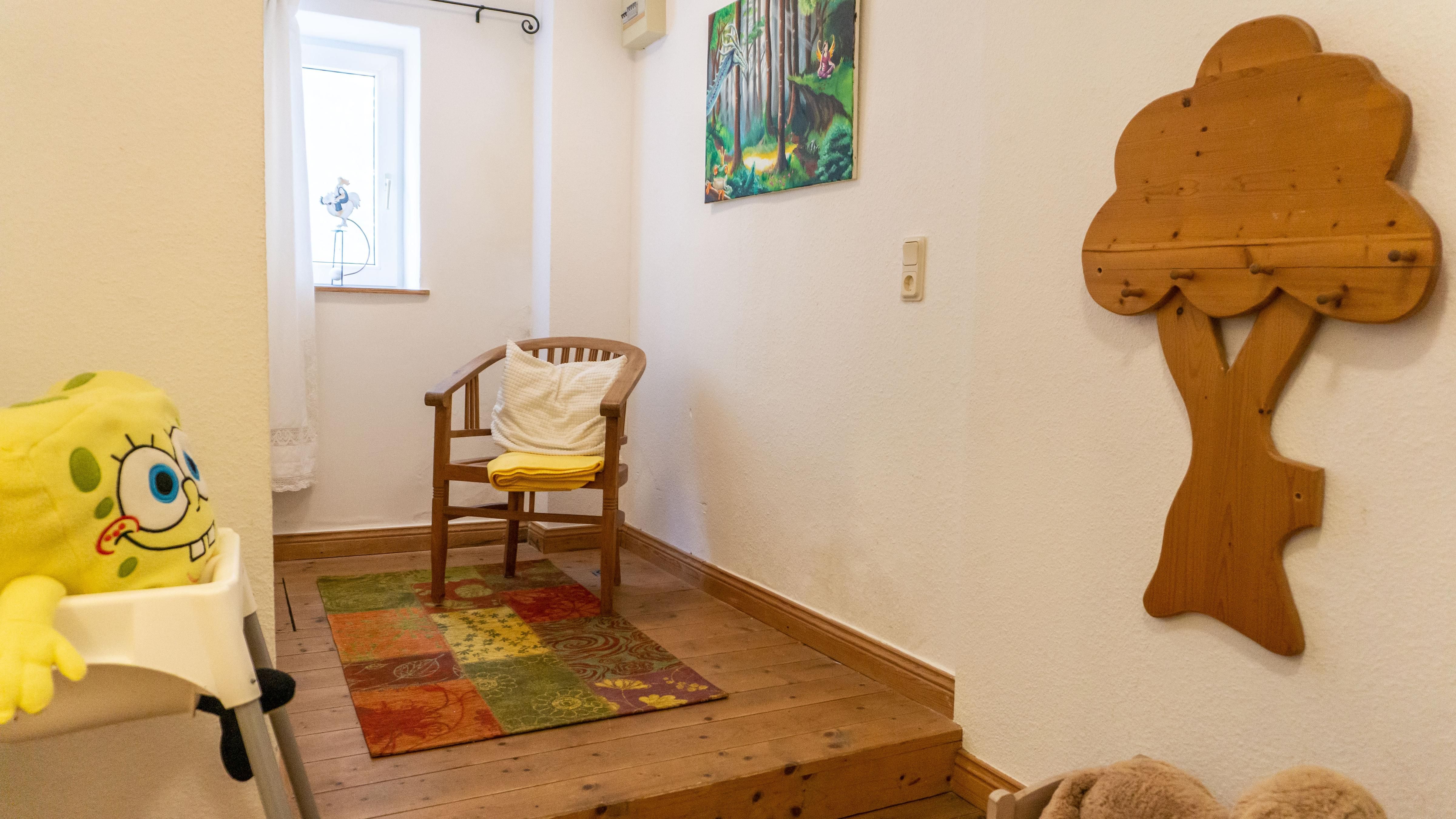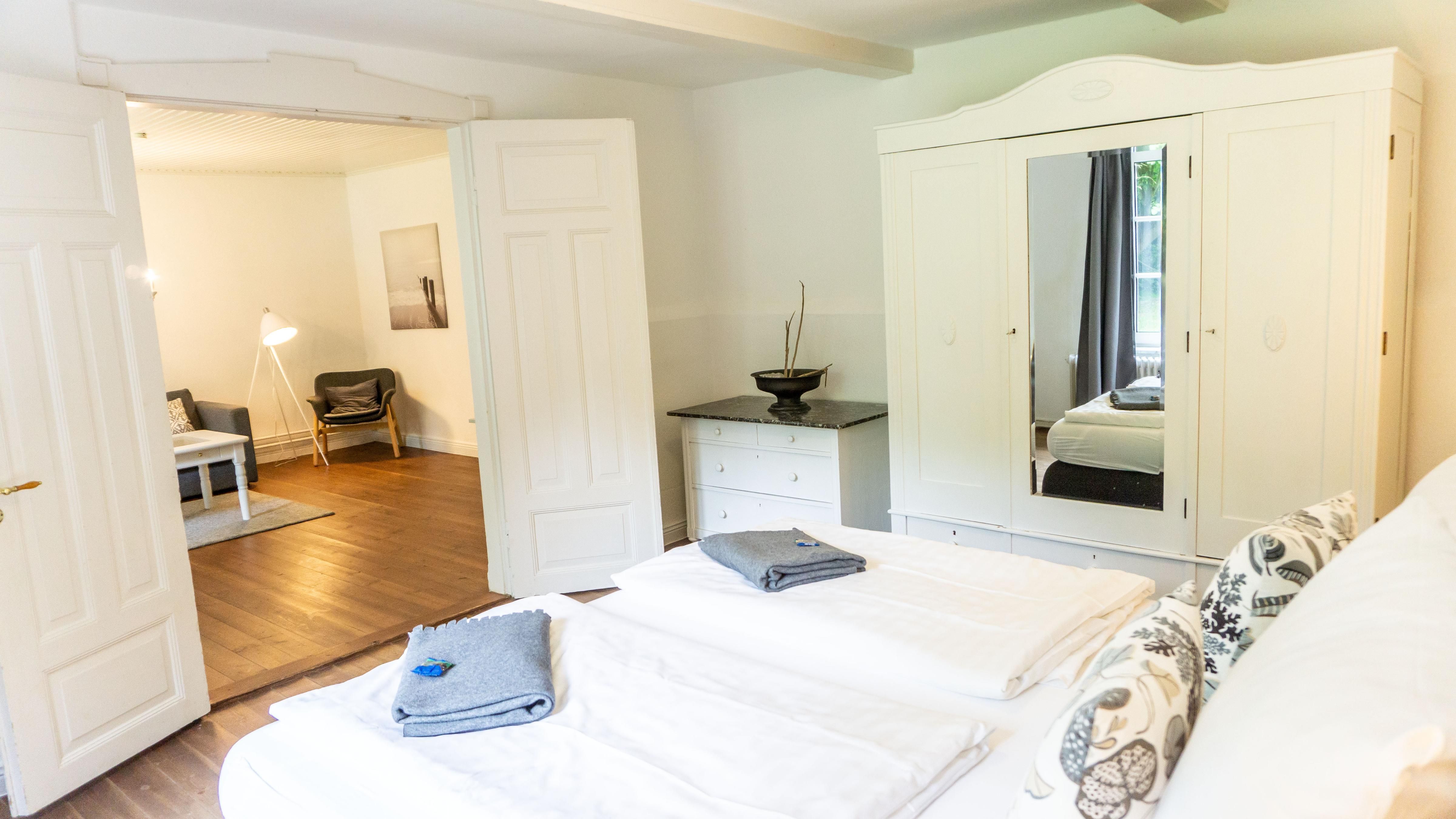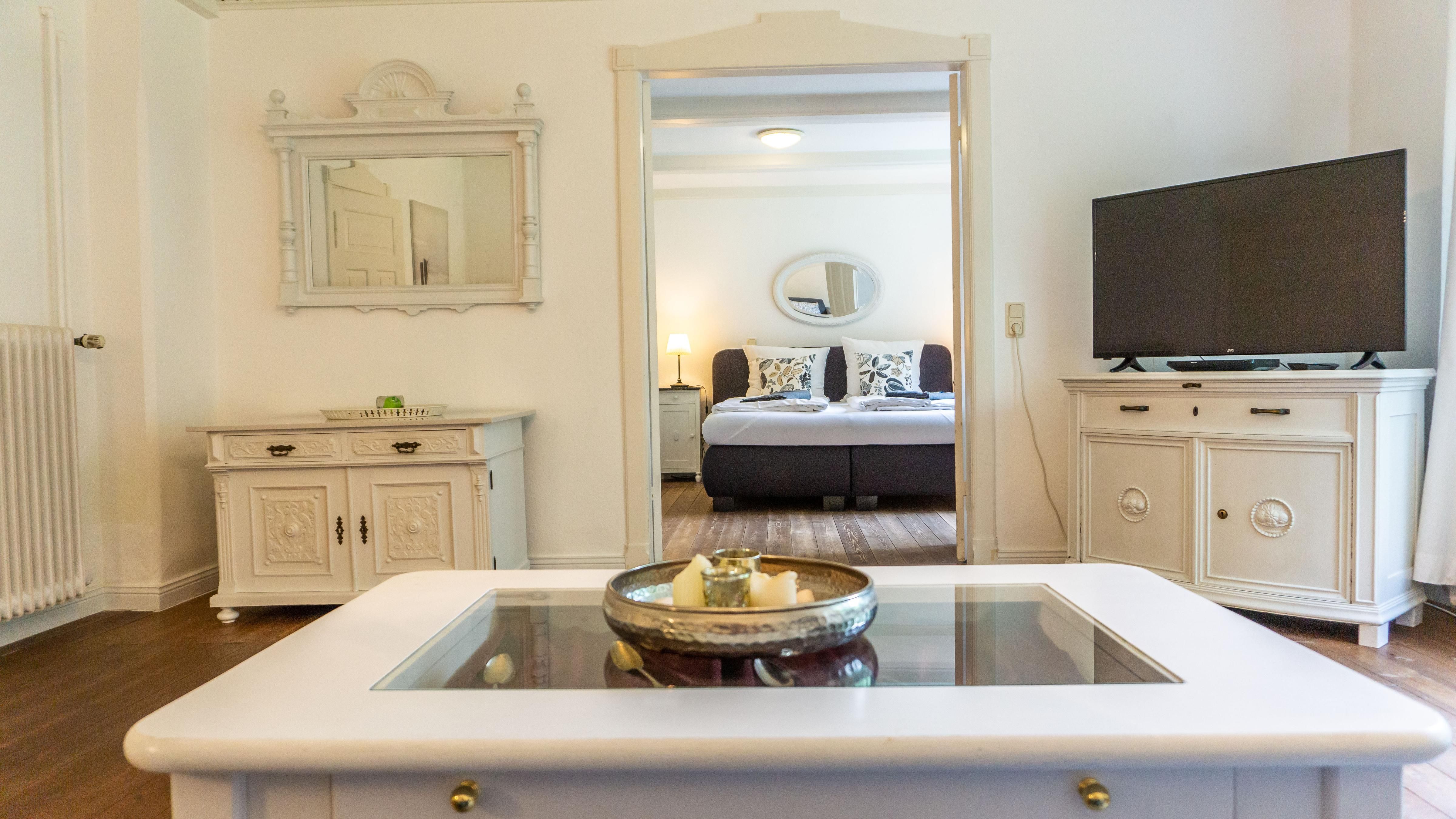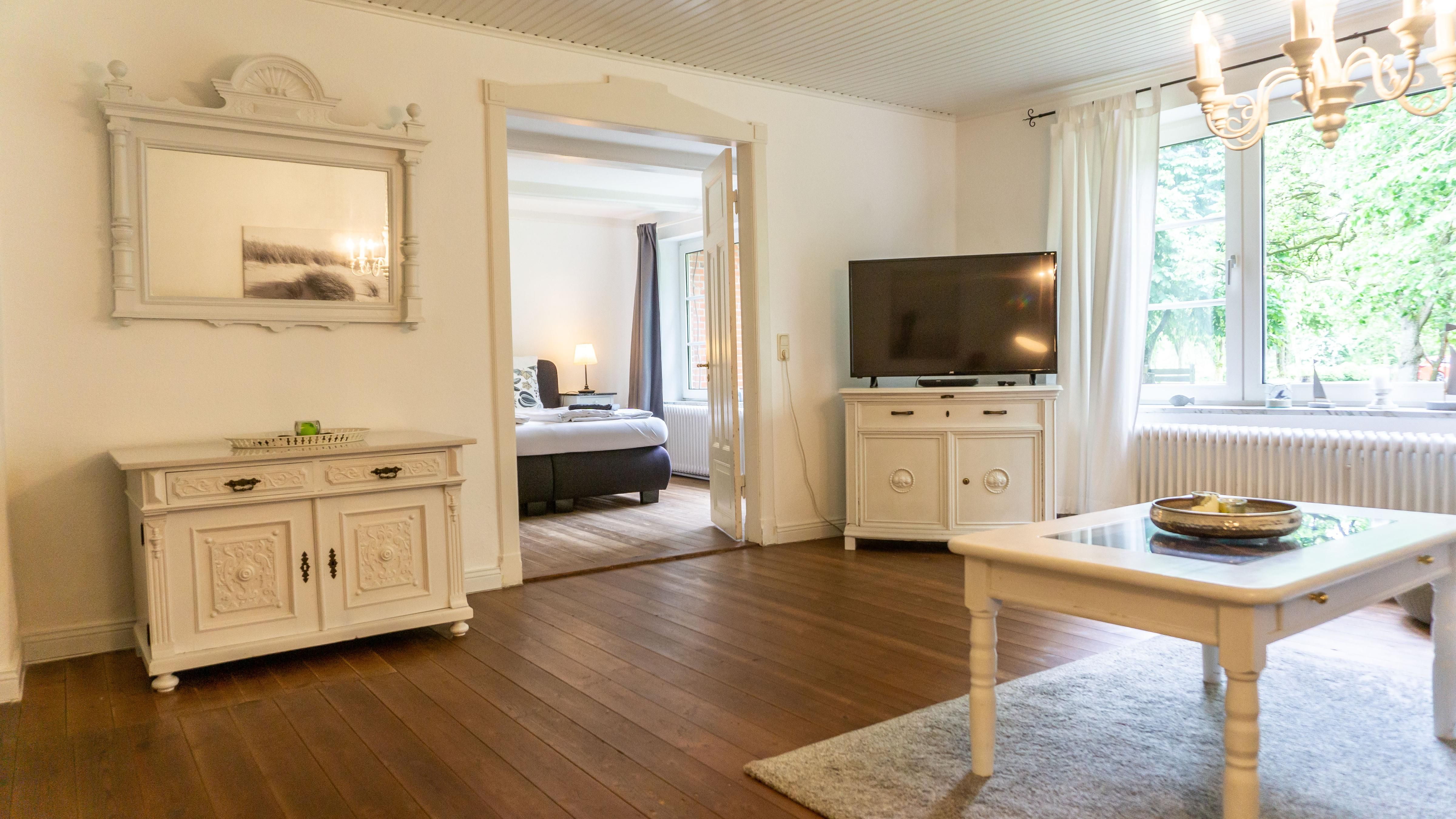 Das helle Wohnzimmer lädt mit einem bequemen Sofa und einem Sessel zum Verweilen ein. Hier können Sie gemütliche Abende verbringen, vielleicht bei einem Film auf dem TV oder beim Surfen im Internet über das WLAN.