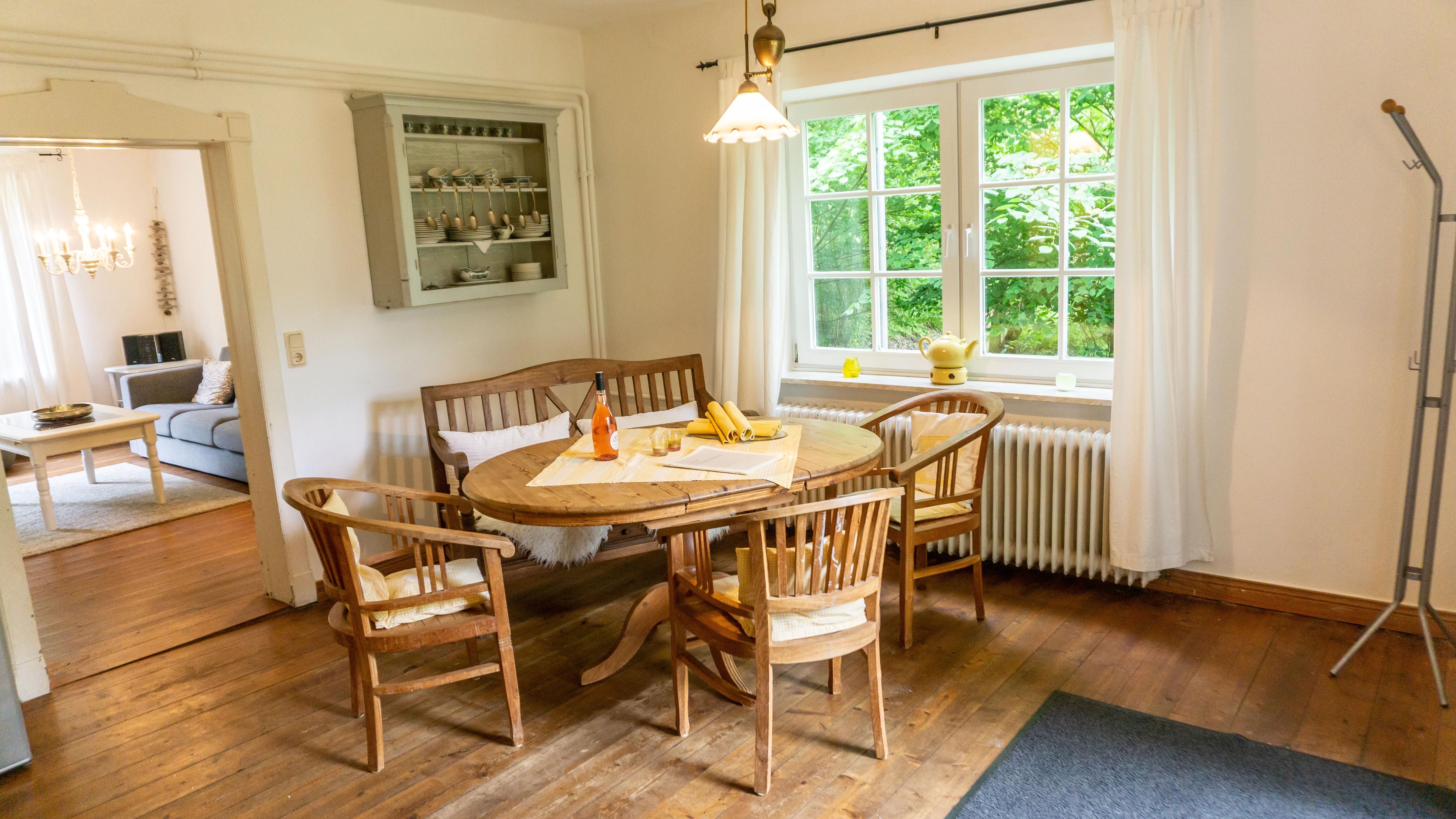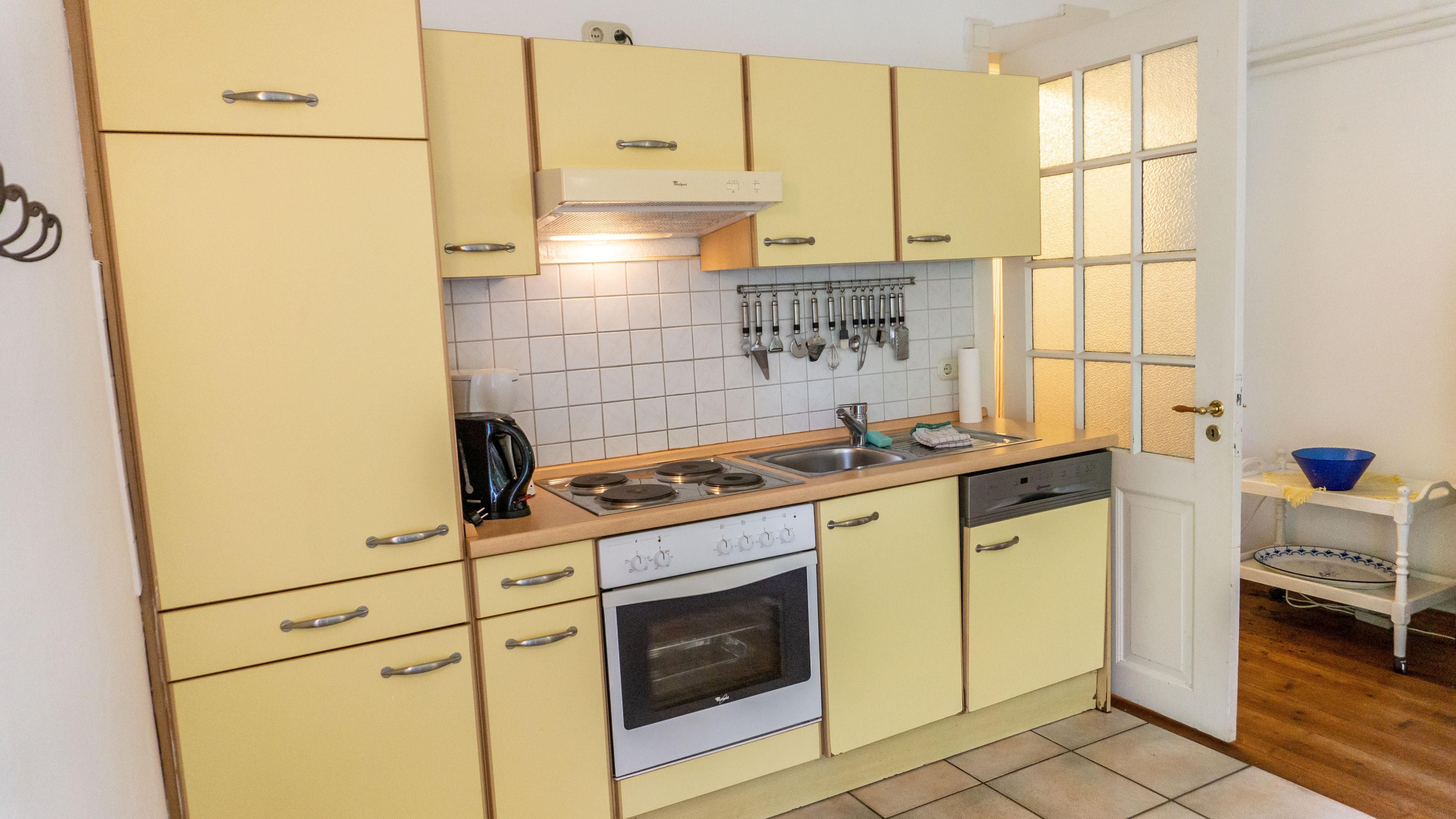 Die Küche ist geschlossen und mit einem Esstisch ausgestattet, ideal für gesellige Familienstunden. Zur Ausstattung der Küche gehört alles wichtige , darunter ein Kühlschrank mit Gefrierfach, ein Backofen, ein 4-Platten-Herd sowie eine Spülmaschine.
