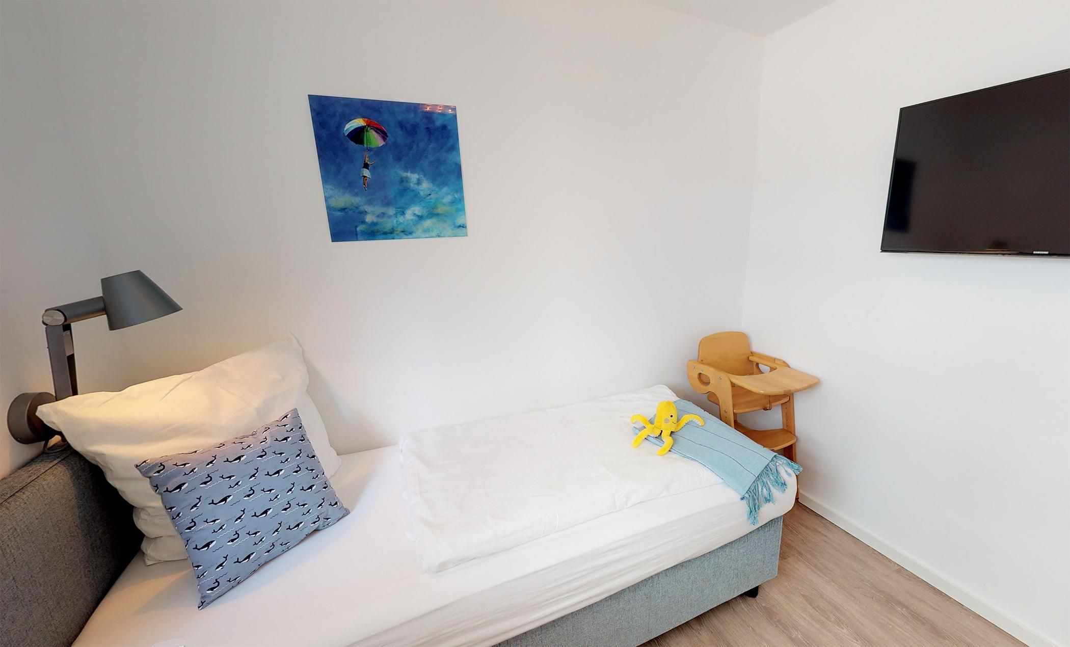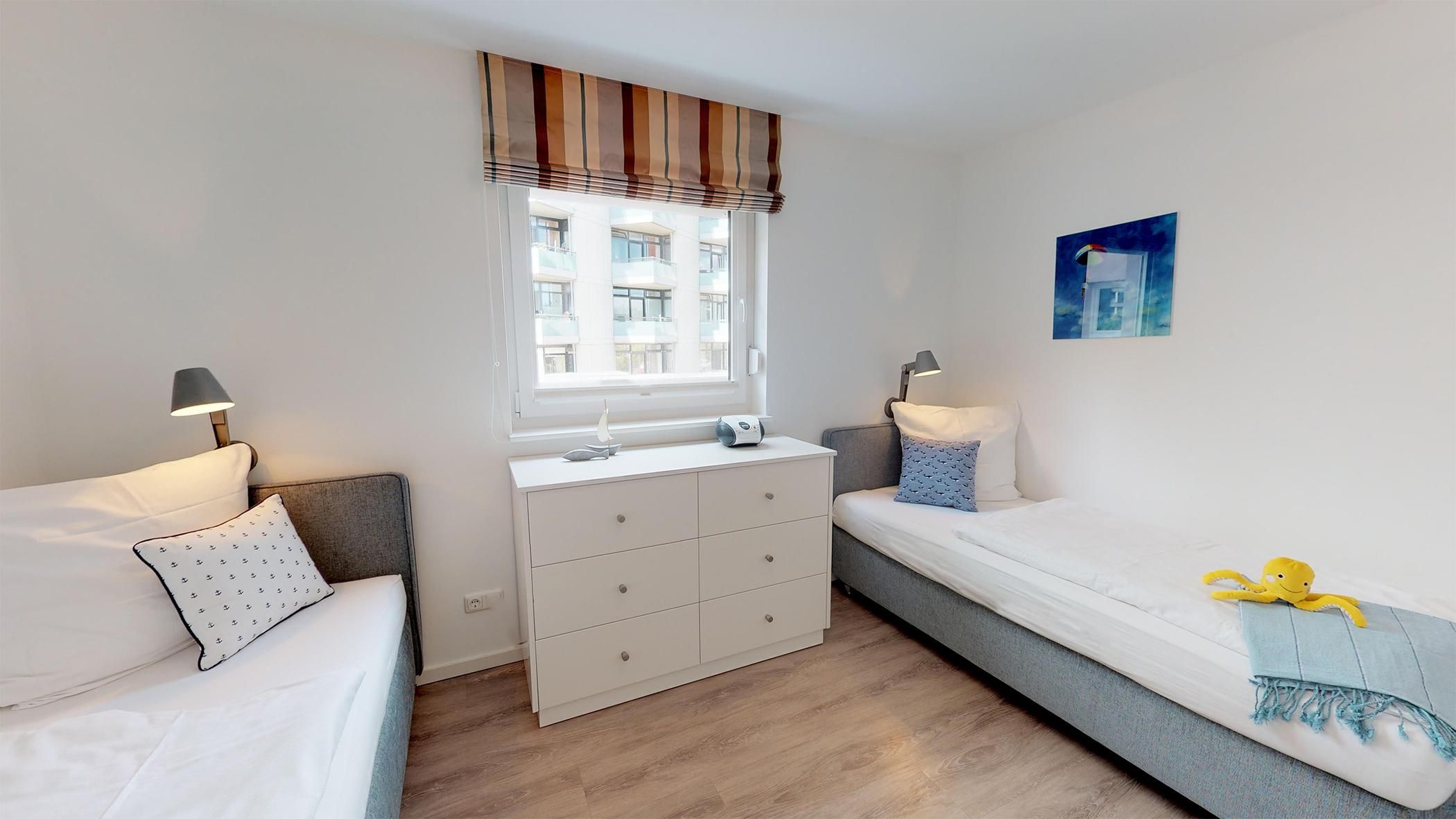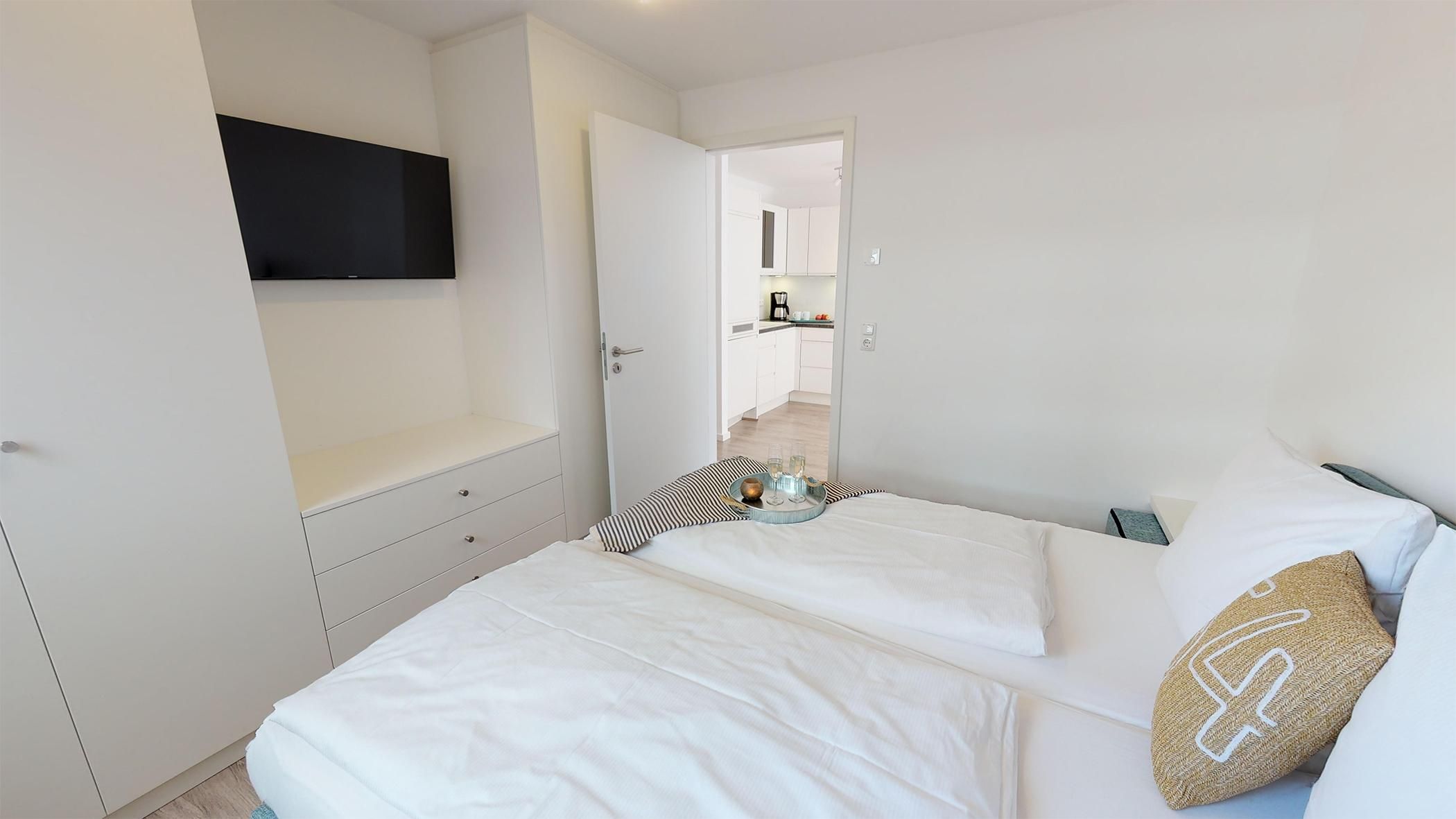 Beim Eintreten empfängt Sie ein einladender Flur, der linkerhand direkt in das moderne Duschbad mit WC führt. Auf der rechten Seite des Flurs befinden sich zwei gemütliche Schlafzimmer, die jeweils mit hochwertigen Boxspring-Einzelbetten, einem geräumigen Kleiderschrank und einem Flachbild-TV ausgestattet sind – ideal für erholsame Nächte und ruhige Stunden.