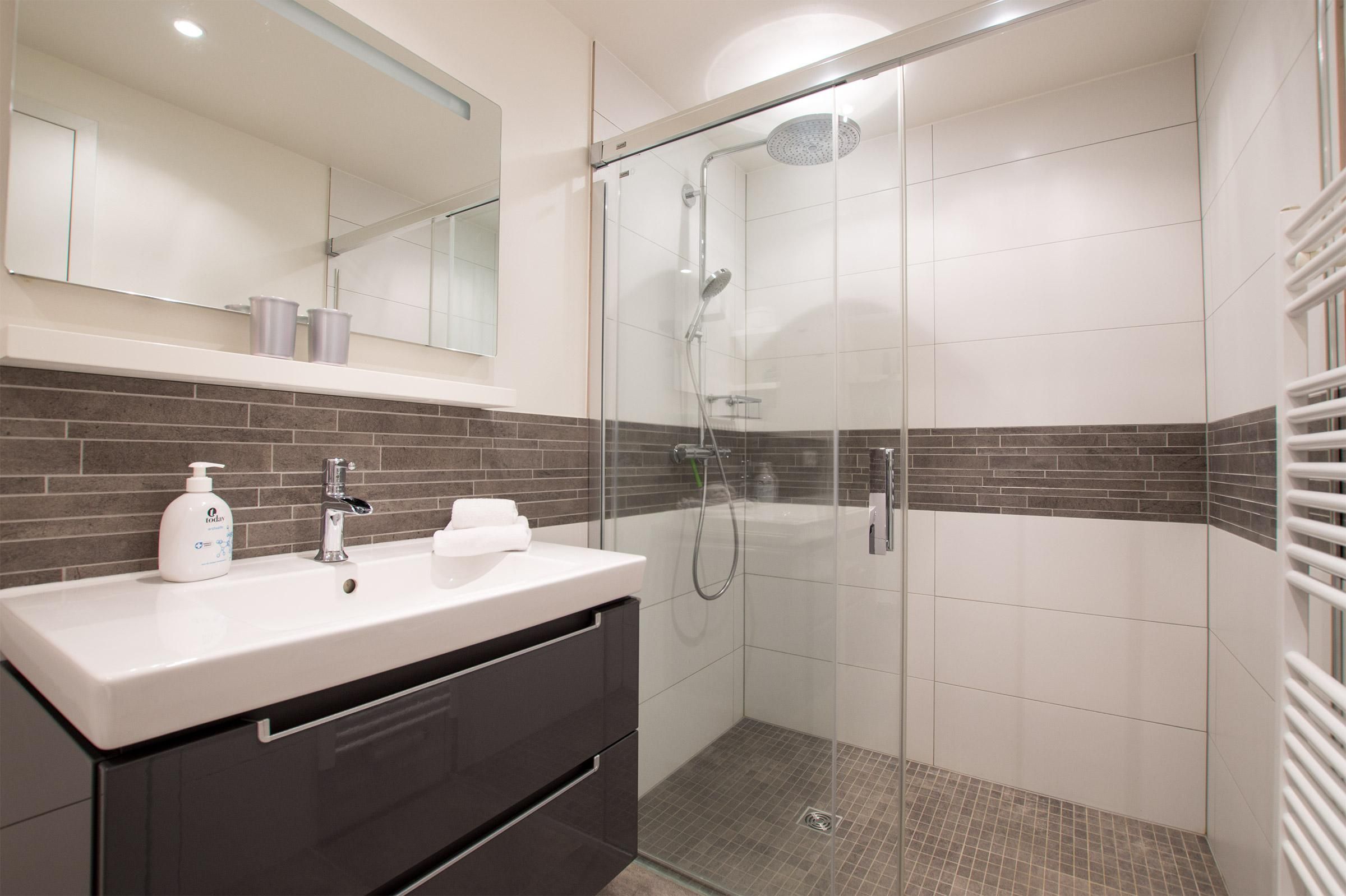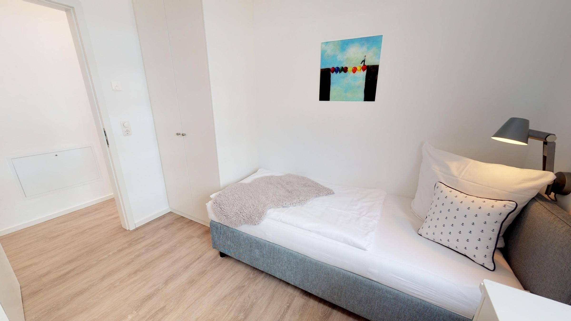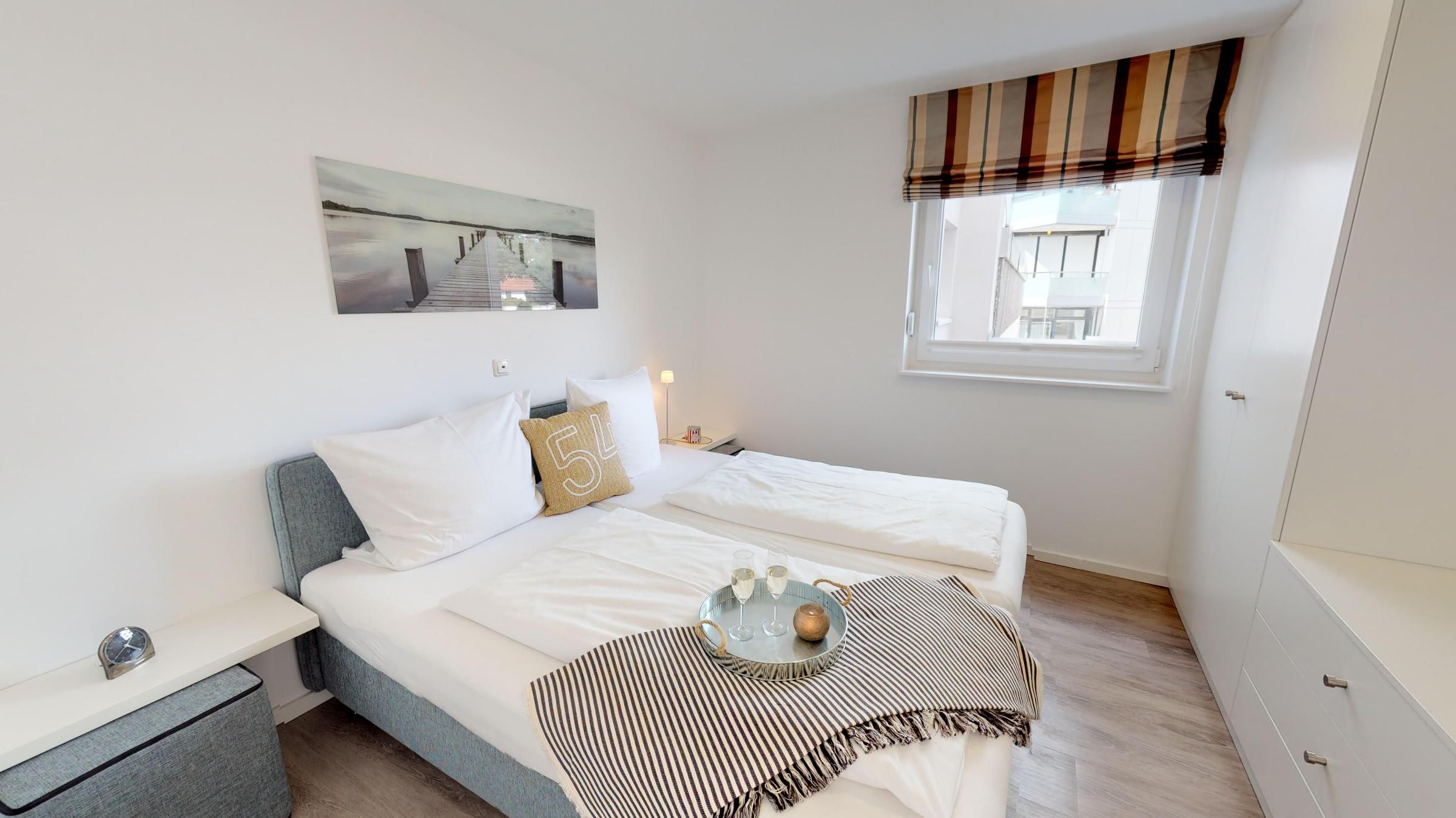 Beim Eintreten empfängt Sie ein einladender Flur, der linkerhand direkt in das moderne Duschbad mit WC führt. Auf der rechten Seite des Flurs befinden sich zwei gemütliche Schlafzimmer, die jeweils mit hochwertigen Boxspring-Einzelbetten, einem geräumigen Kleiderschrank und einem Flachbild-TV ausgestattet sind – ideal für erholsame Nächte und ruhige Stunden.