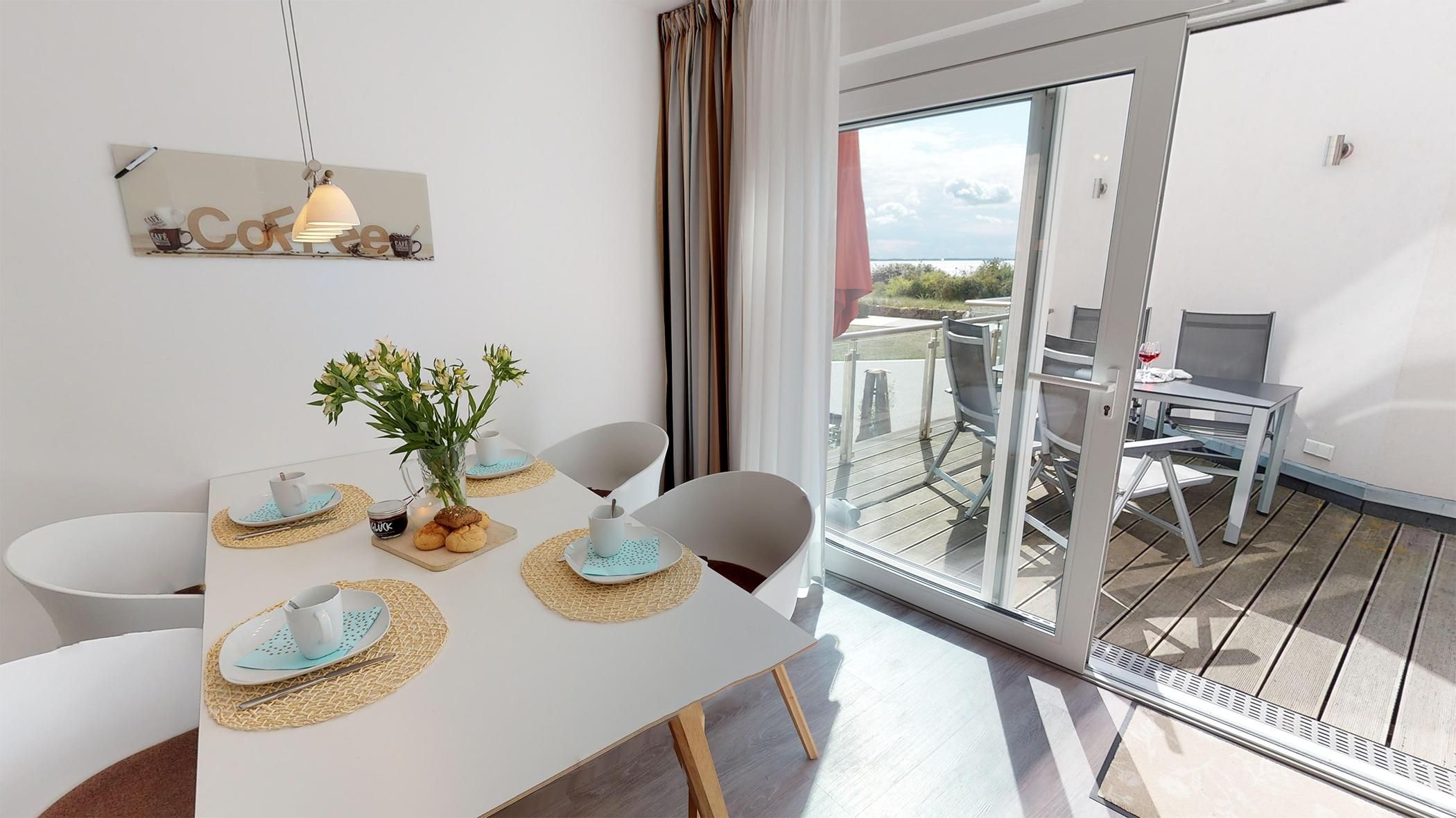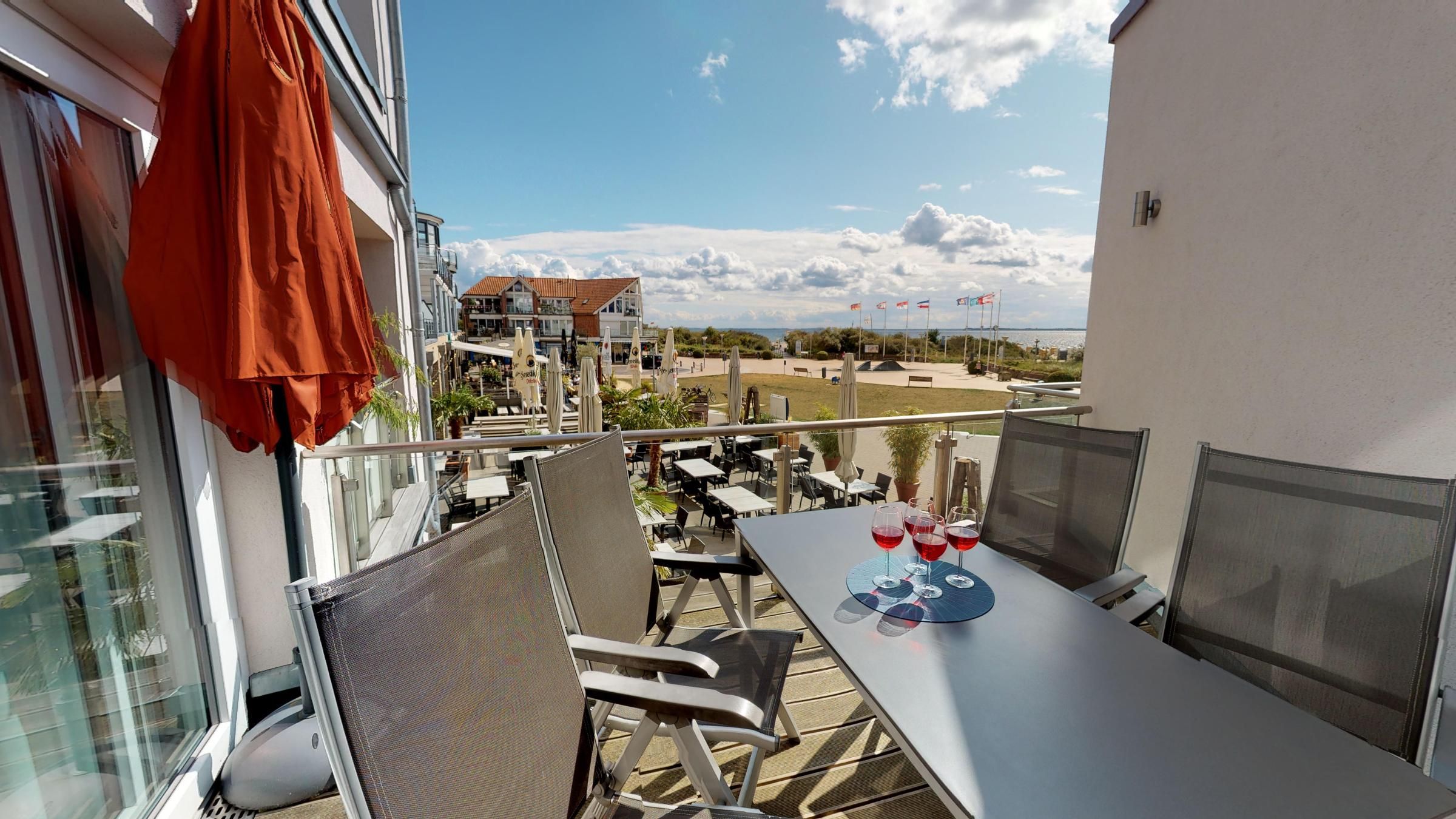 Der möblierte Balkon, mit einem atemberaubenden Blick auf das Meer, lädt dazu ein, die frische Ostseeluft in vollen Zügen zu genießen und den Tag entspannt ausklingen zu lassen.