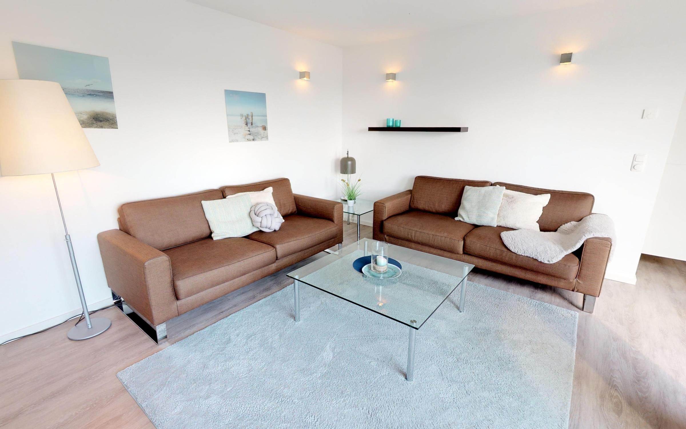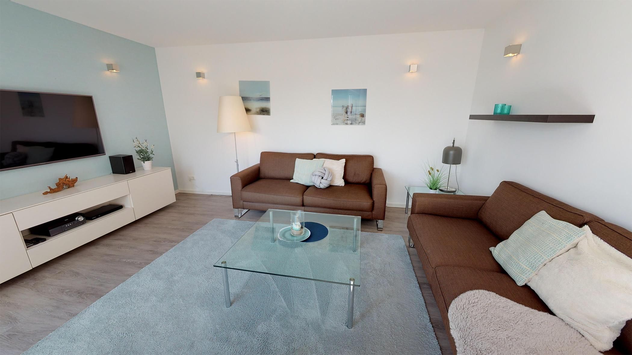 Das Herzstück des Apartments ist der lichtdurchflutete Wohnbereich. Hier erwartet Sie eine offene, voll ausgestattete Einbauküche mit einem stilvollen Essbereich. Um die Ecke gelangen Sie in die behagliche Sofaecke, die mit einem weiteren Flachbild-TV zum Entspannen und Genießen einlädt.