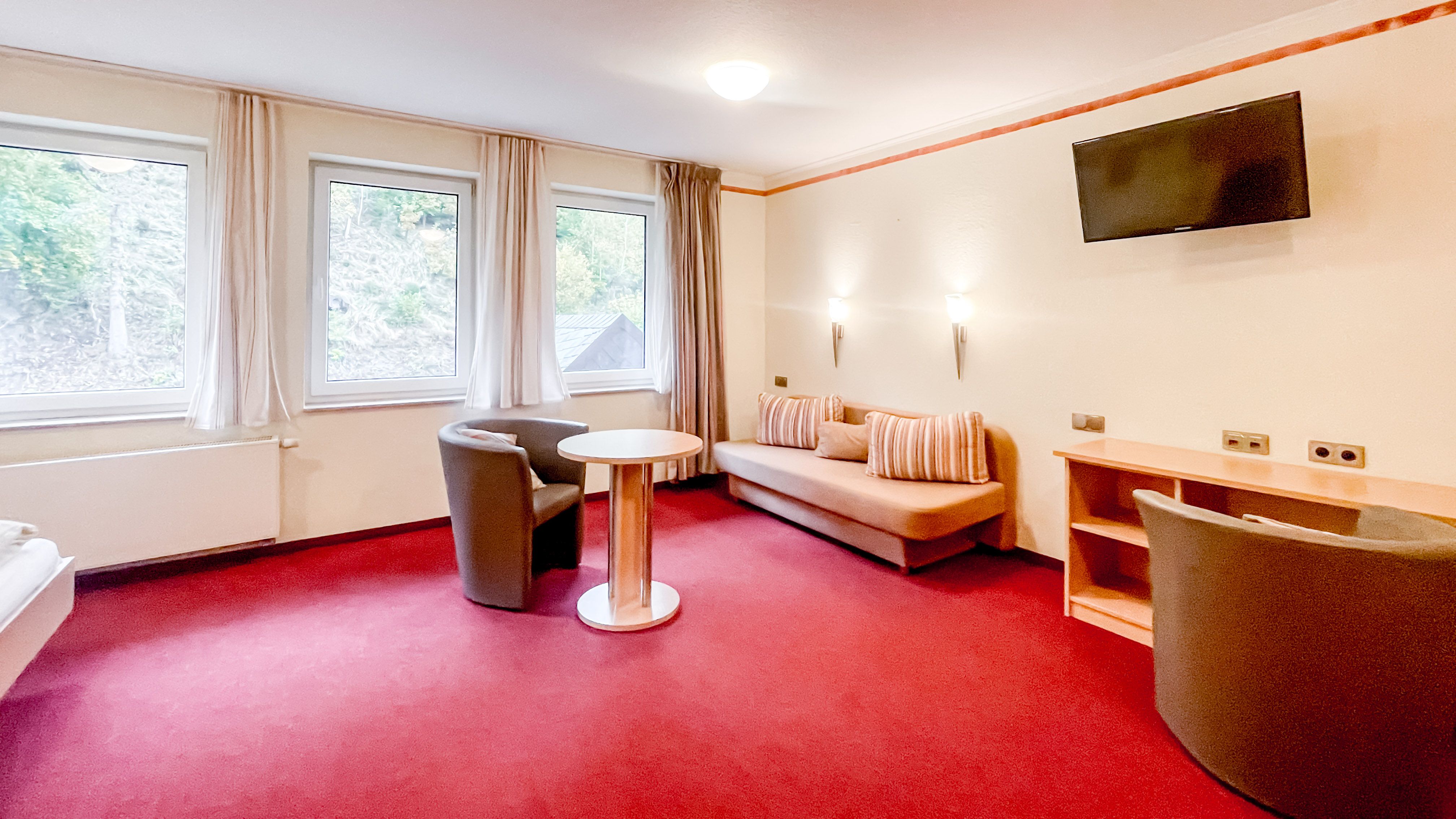 Herzlich willkommen in unserem charmanten Zimmer, das perfekt für drei Personen geeignet ist. Mit einer großzügigen Fläche von 28 qm bietet es viel Raum zum Entspannen und Wohlfühlen. Ausgestattet mit einem bequemen Doppelbett sorgt es für eine erholsame Nachtruhe. Zudem gibt es ein komfortables Einzelbett/Sofa. Ein moderner Fernseher steht Ihnen zur Verfügung, um Ihre Lieblingssendungen zu genießen.