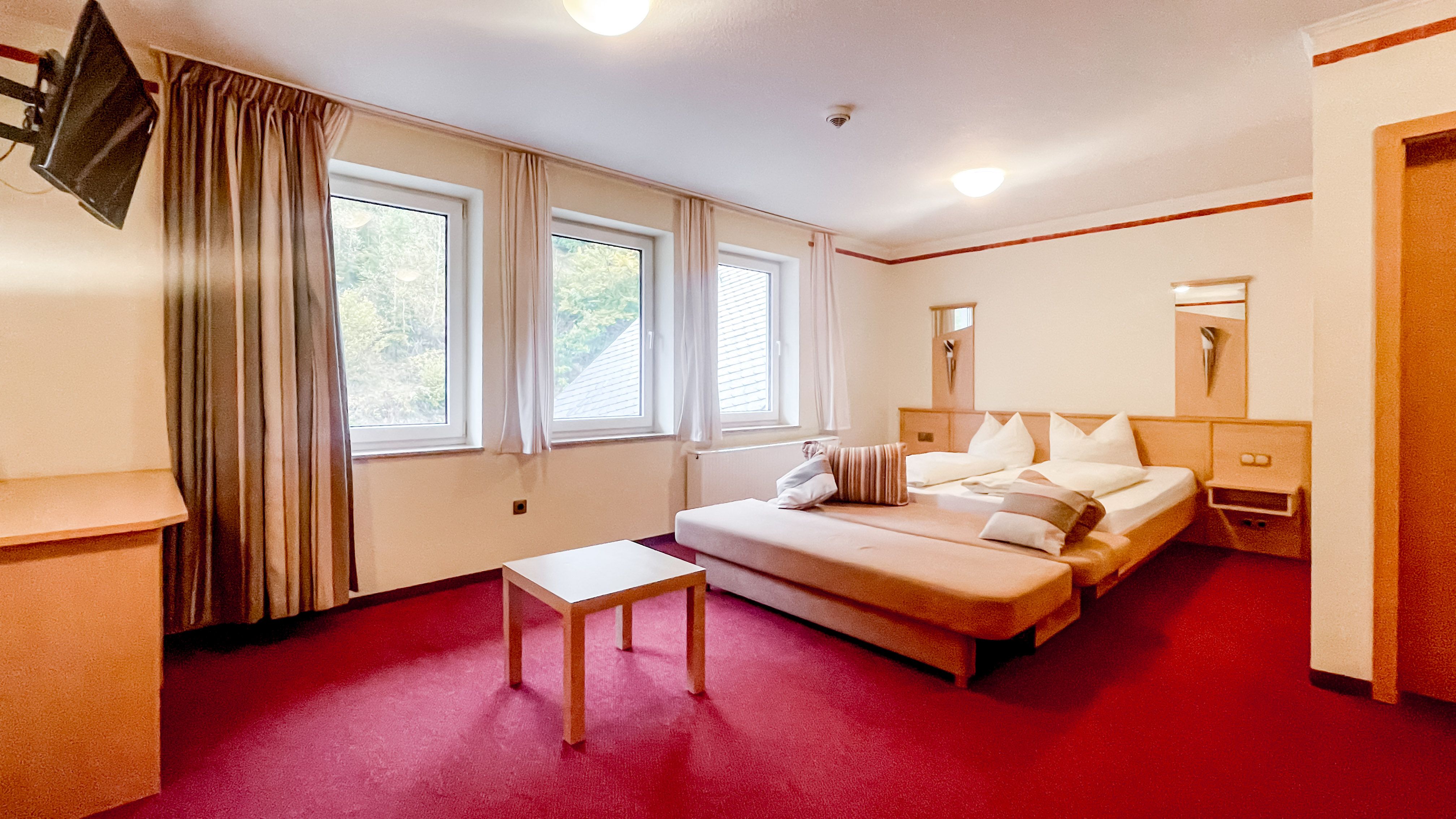 Herzlich willkommen in unserem charmanten Zimmer, das perfekt für drei Personen geeignet ist. Mit einer großzügigen Fläche von 28 qm bietet es viel Raum zum Entspannen und Wohlfühlen. Ausgestattet mit einem bequemen Doppelbett sorgt es für eine erholsame Nachtruhe. Zudem gibt es ein komfortables Einzelbett/Sofa. Ein moderner Fernseher steht Ihnen zur Verfügung, um Ihre Lieblingssendungen zu genießen.