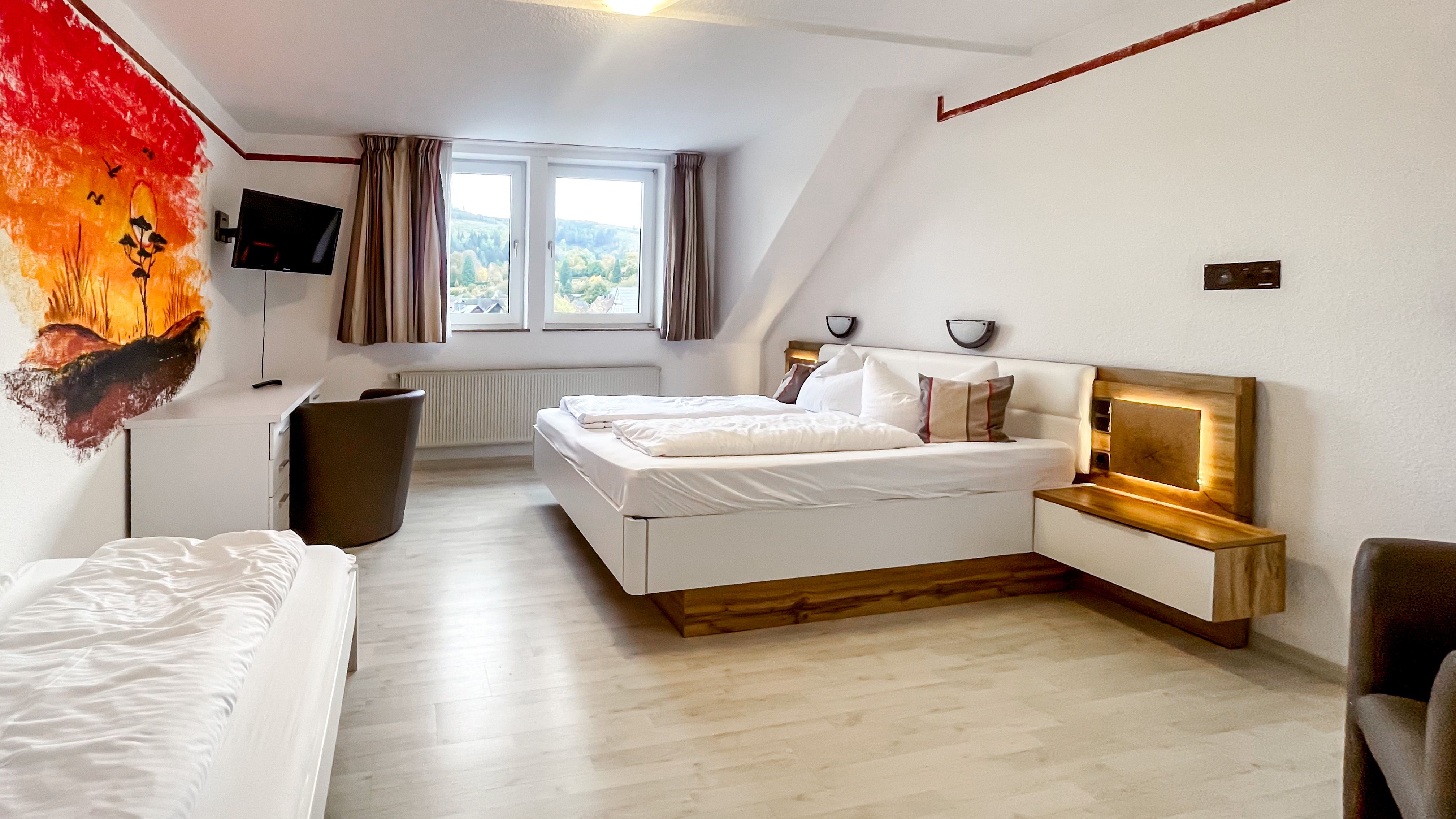 Herzlich willkommen in unserem charmanten Zimmer, das perfekt für drei Personen geeignet ist. Mit einer großzügigen Fläche von 26 qm bietet es viel Raum zum Entspannen und Wohlfühlen. Ausgestattet mit einem bequemen Doppelbett, einem Einzelbett, sorgt es für eine erholsame Nachtruhe. Ein moderner Fernseher steht Ihnen zur Verfügung, um Ihre Lieblingssendungen zu genießen. Ein Balkon ist vorhanden.
