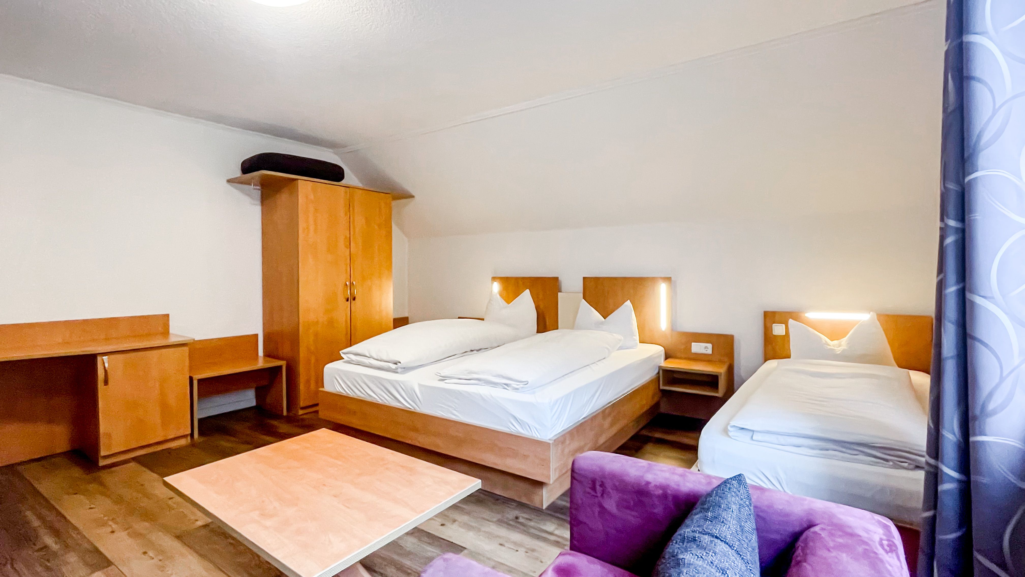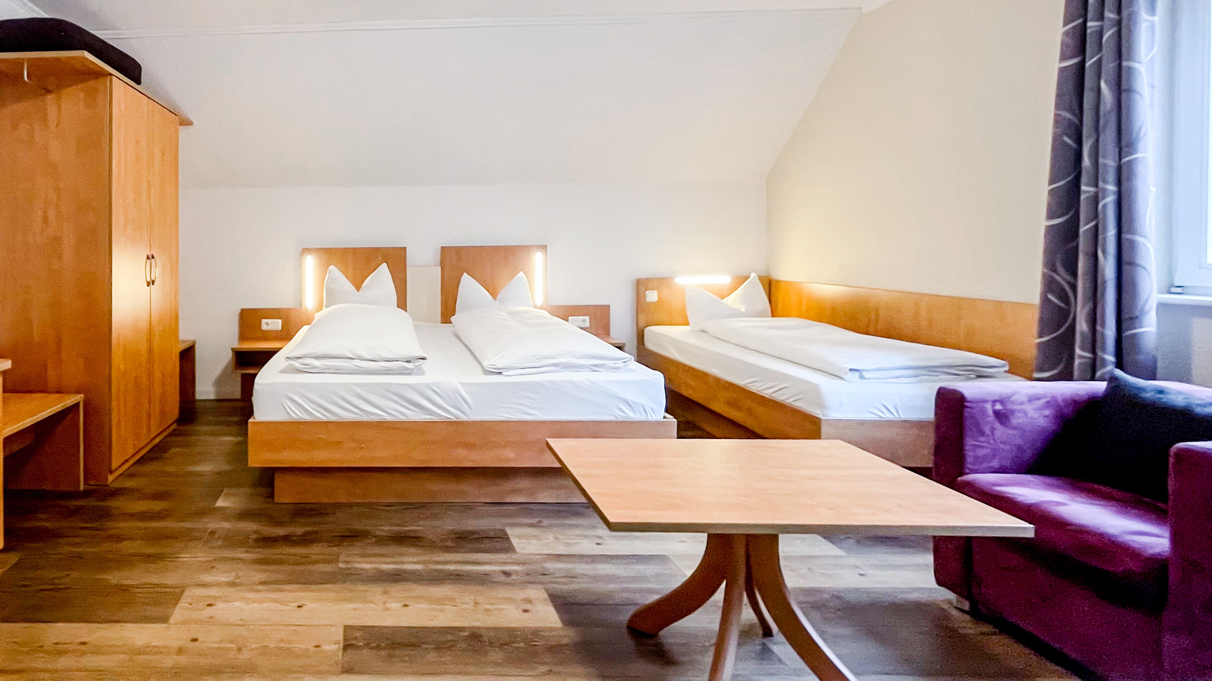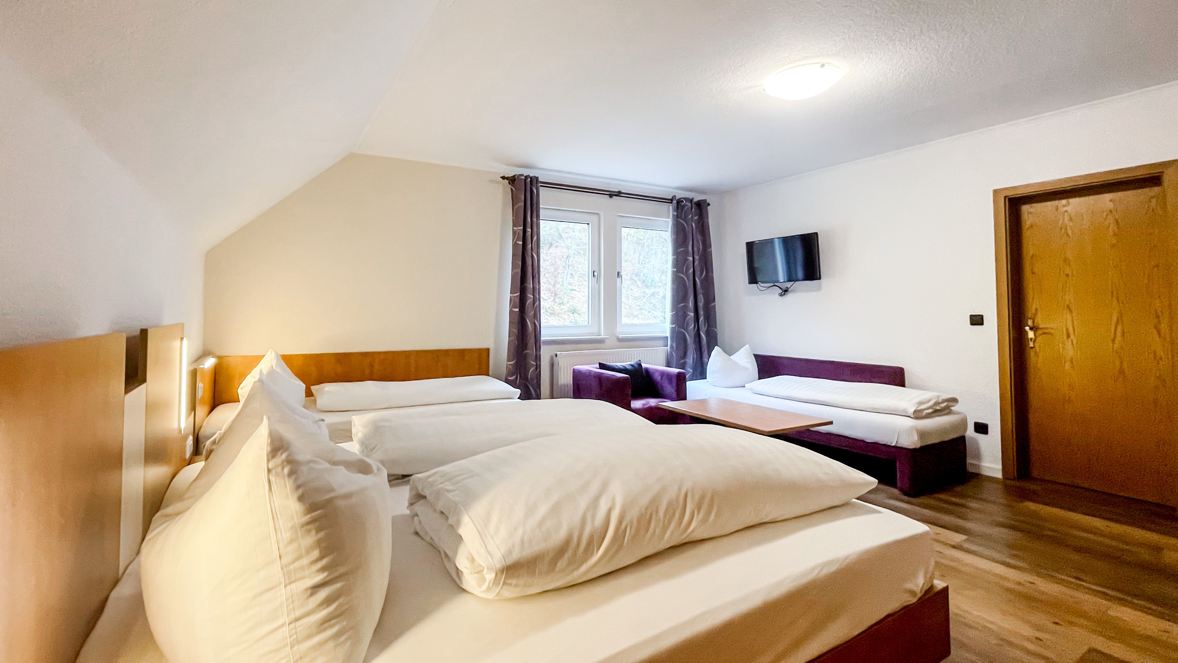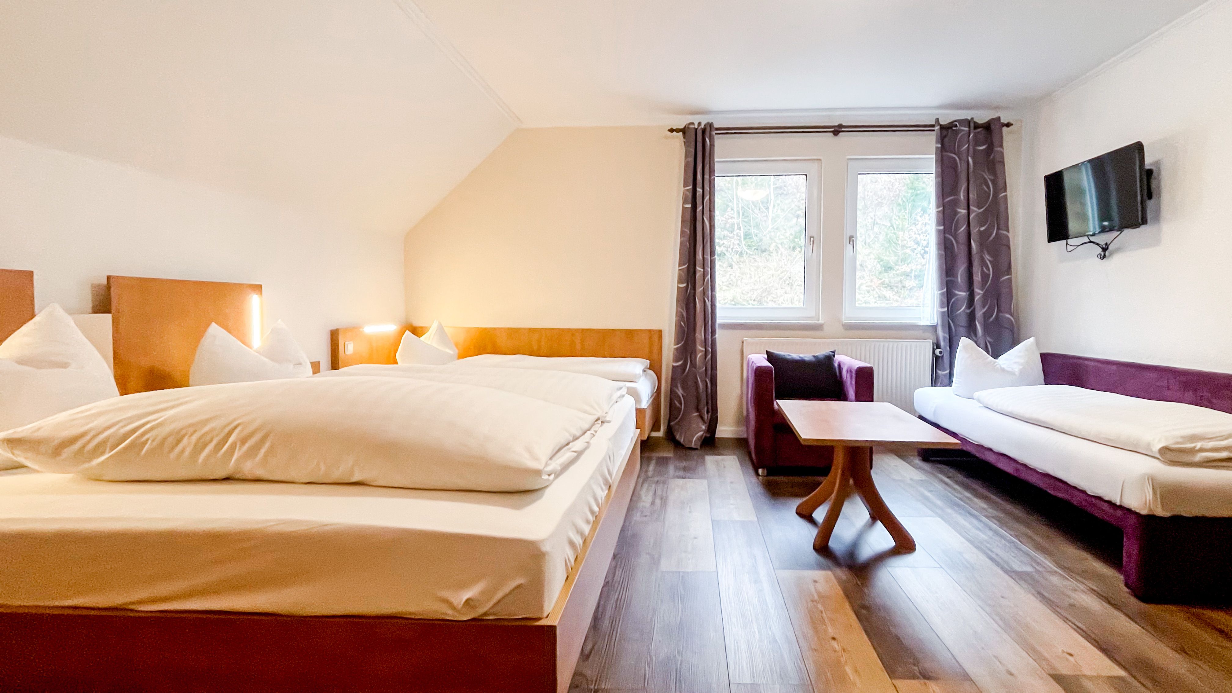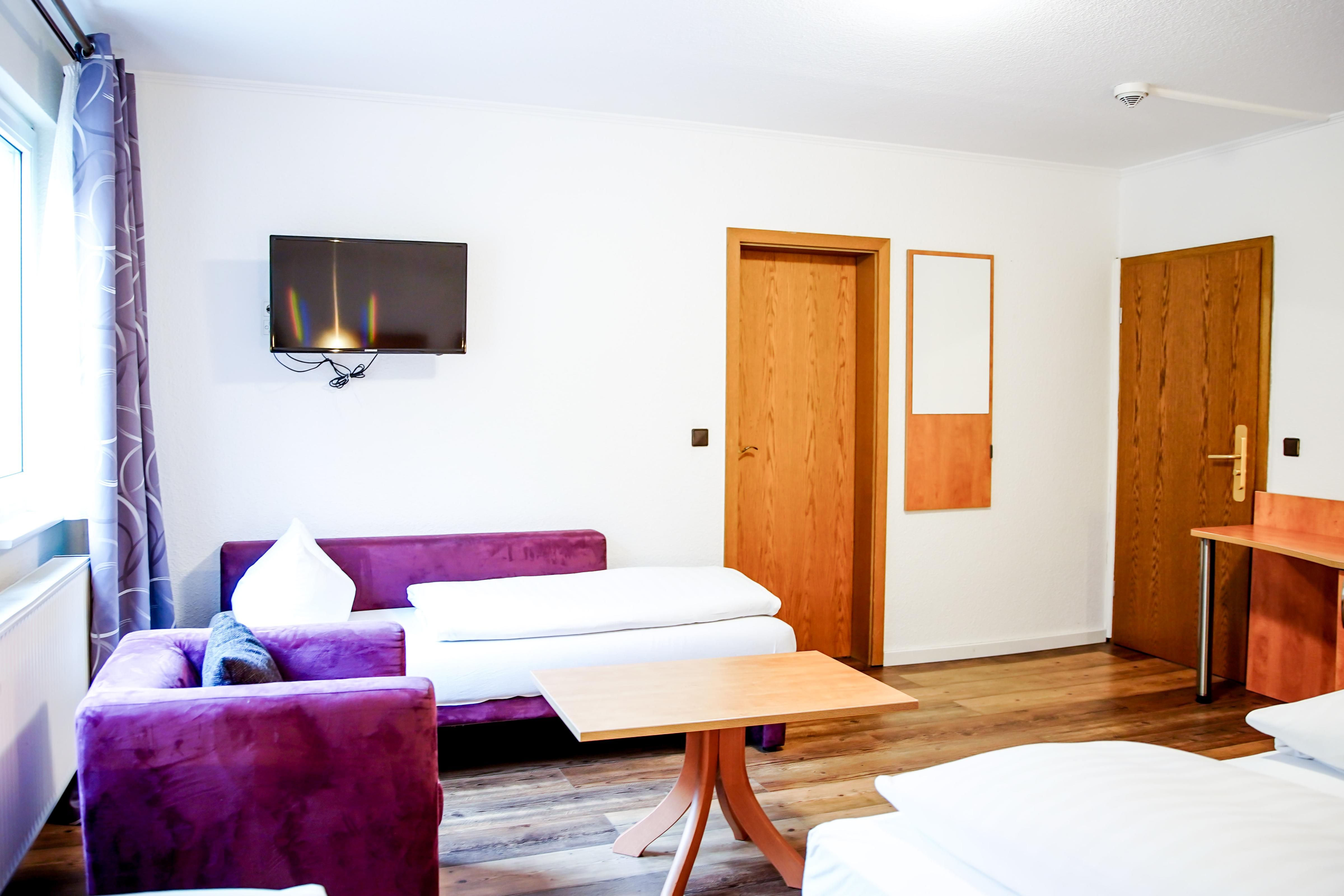 Herzlich willkommen in unserem charmanten Zimmer, das perfekt für vier Personen geeignet ist. Mit einer großzügigen Fläche von 27 qm bietet es viel Raum zum Entspannen und Wohlfühlen. Ausgestattet mit einem bequemen Doppelbett, einem Einzelbett, einem Schlafsofa, sorgt es für eine erholsame Nachtruhe. Ein moderner Fernseher steht Ihnen zur Verfügung, um Ihre Lieblingssendungen zu genießen.