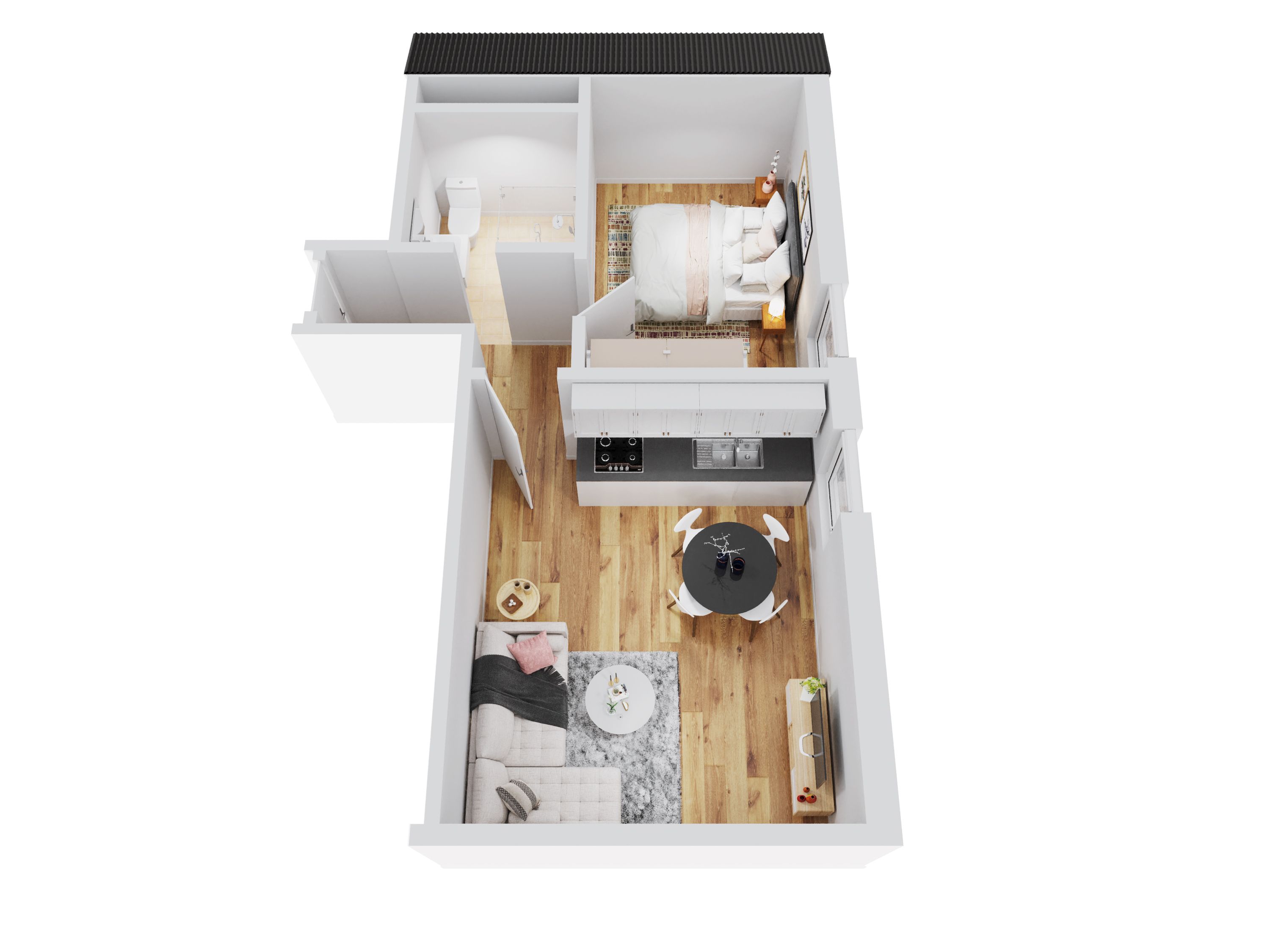 Das vollständig renovierte und hochwertig ausgestattete 2-Zimmer-Apartment im ersten Stock erstreckt sich über eine Fläche von 42m² und bietet: