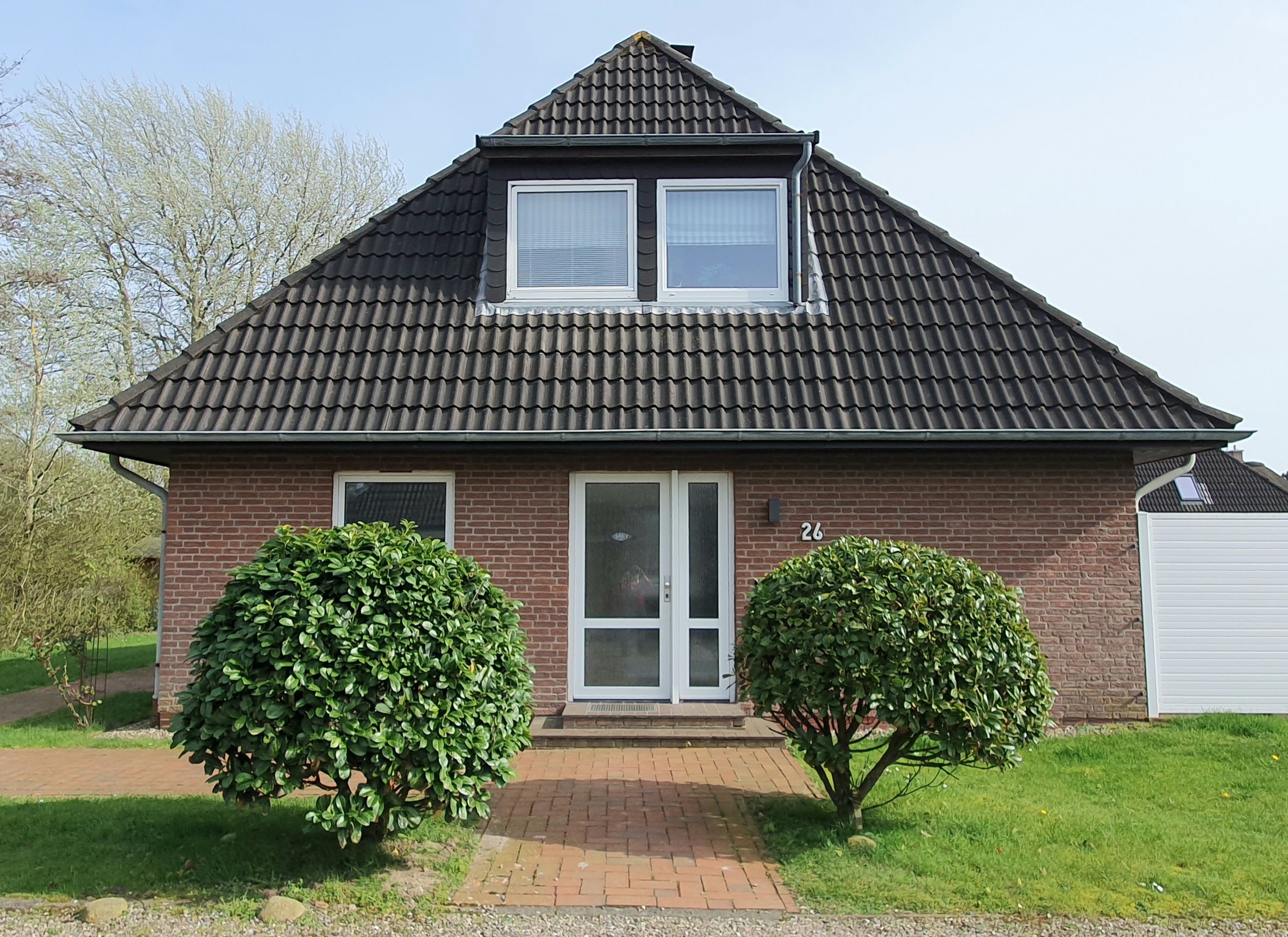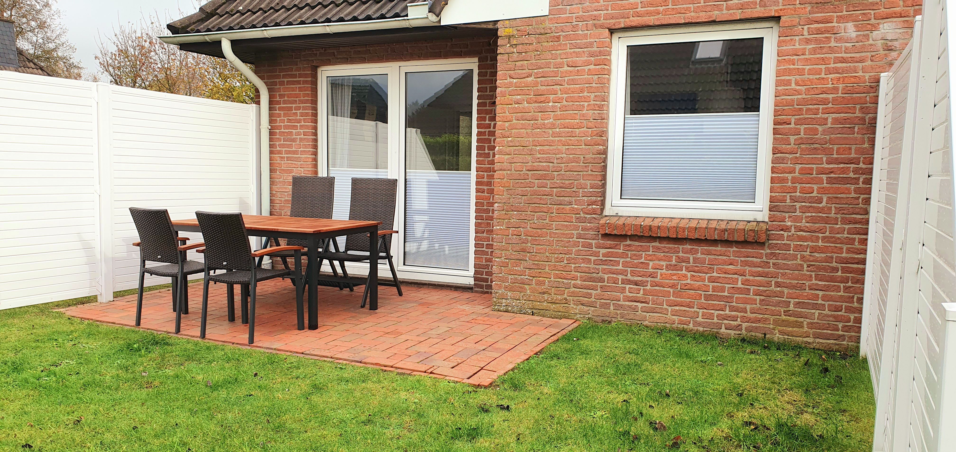 Terrasse mit Sichtschutz, Gartenmöbeln und Sonnenschirm
