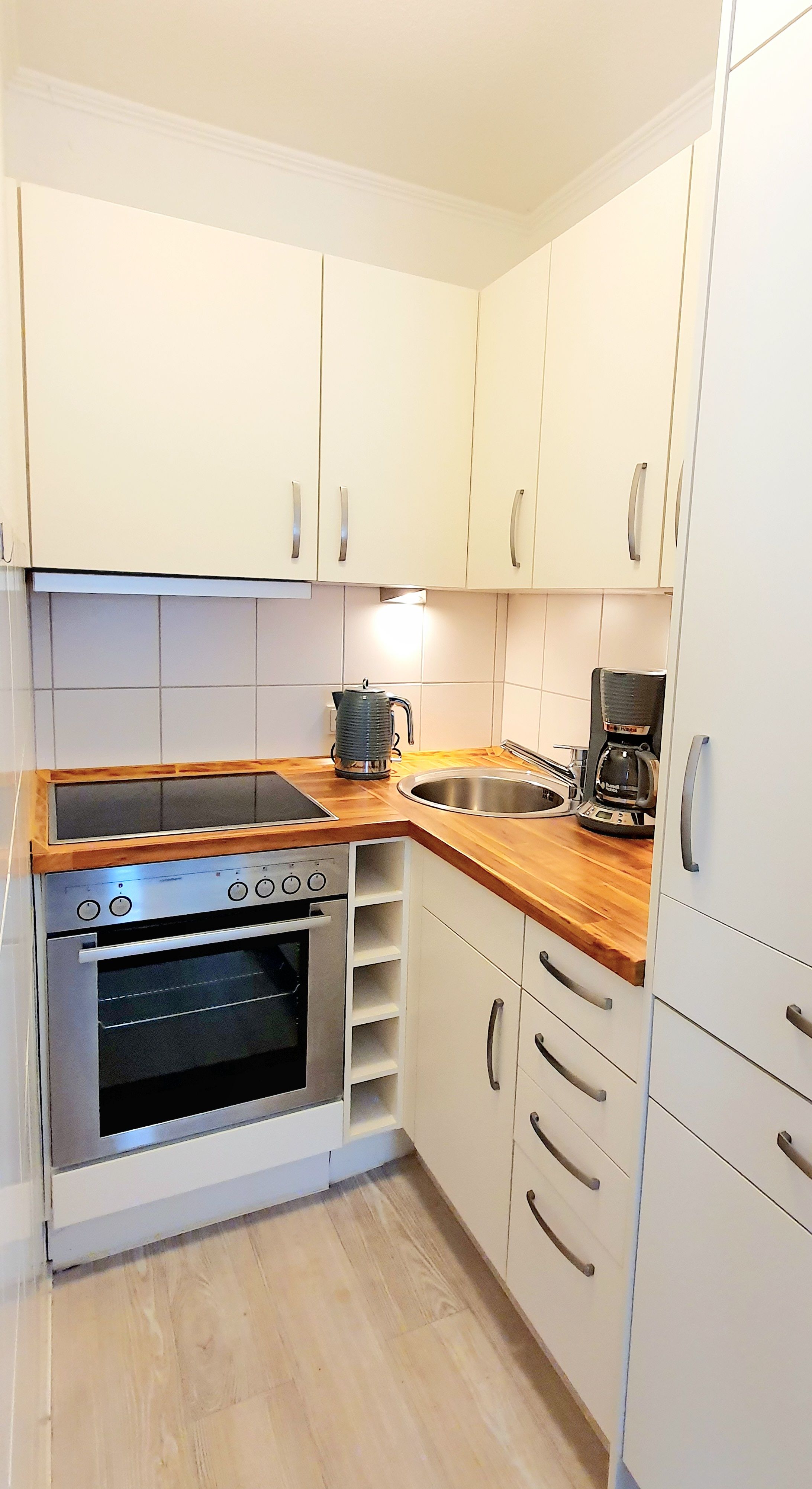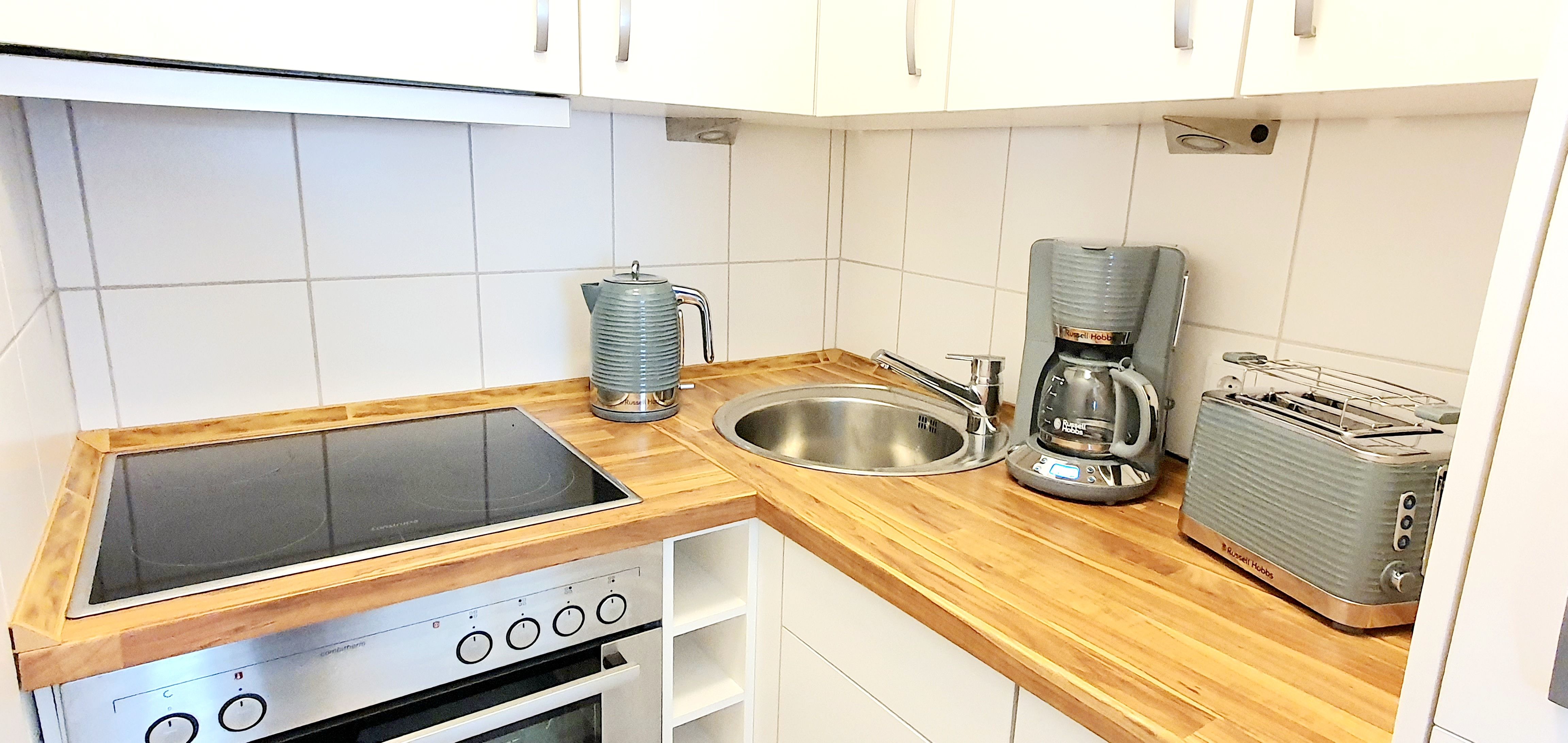 Kleine offene Küche mit Geschirrspüler, Ceranfeld, Backofen, Kühlschrank mit Gefrierfach, Senseo- und Filterkaffeemaschine