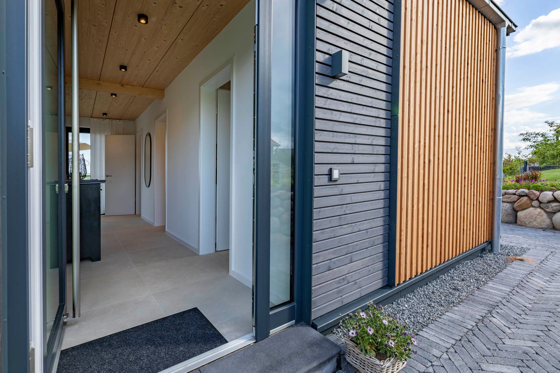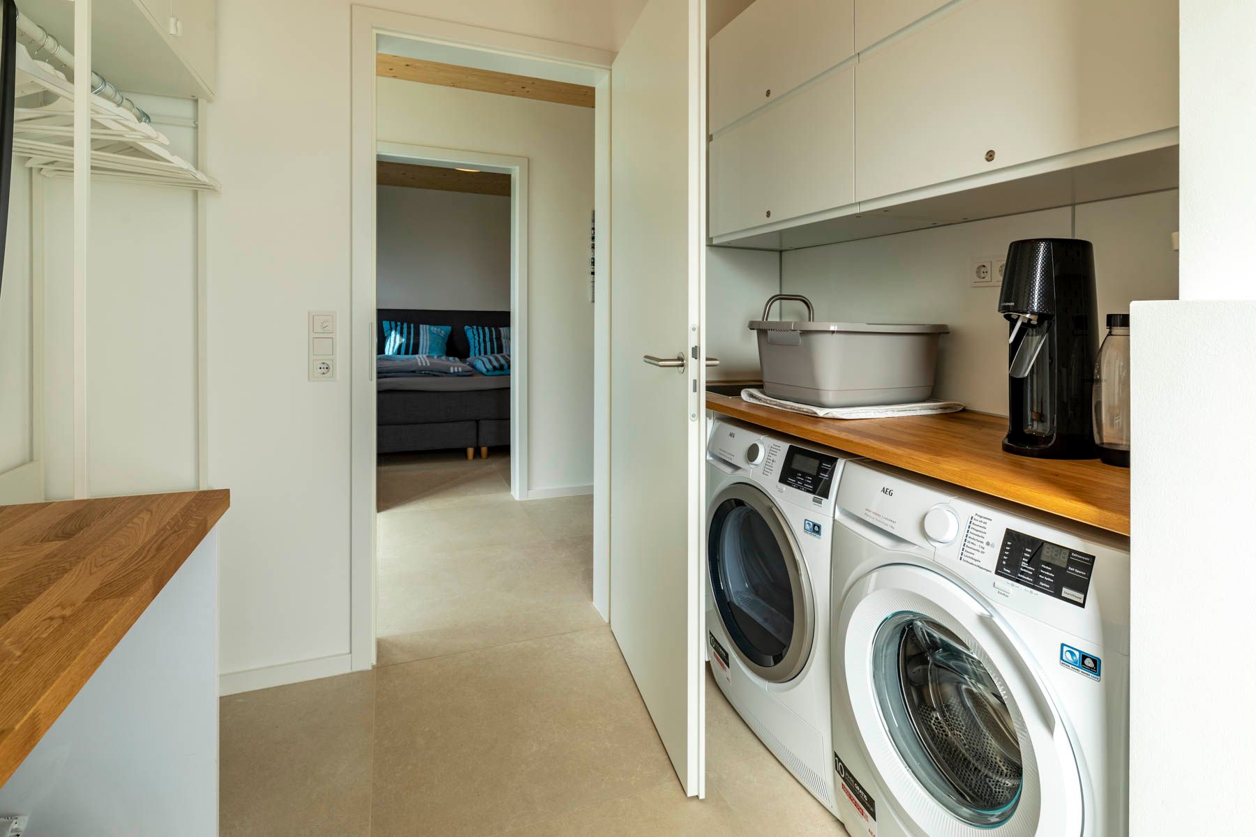 Über 2 separate Eingänge findet ihr den Zugang zum Flur bzw. dem Hauswirtschaftsraum, in dem eine Garderobe, Waschmaschine und Trockner zu finden sind.