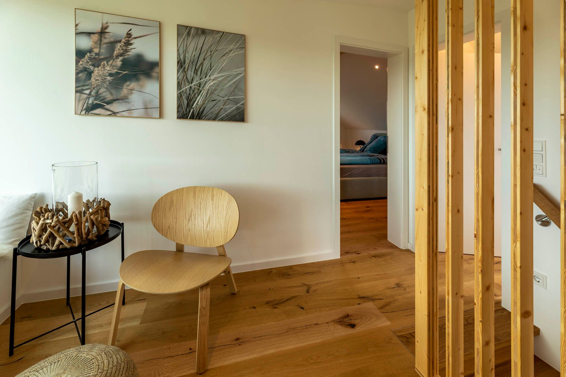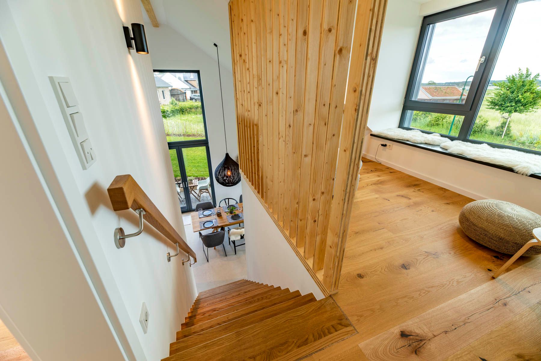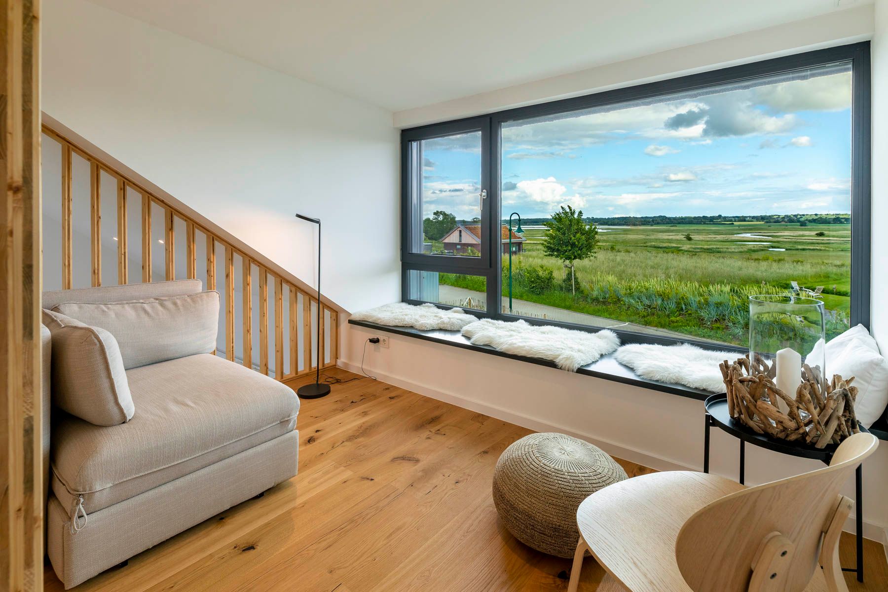Die Treppe (etwas steiler als regulär / kein Treppenschutzgitter vorhanden) führt zu einem gemütlichem Sitzbereich, der offen gestaltet ist und einen Panoramablich aus einem großen Gaubenfenster bietet. Von einer integrierten Sitzbank aus kann der Blick weit in das Naturschutzgebiet des Sehlendorfer Binnensees wandern. Ein Traum für jeden Natur- und Vogelliebhaber.