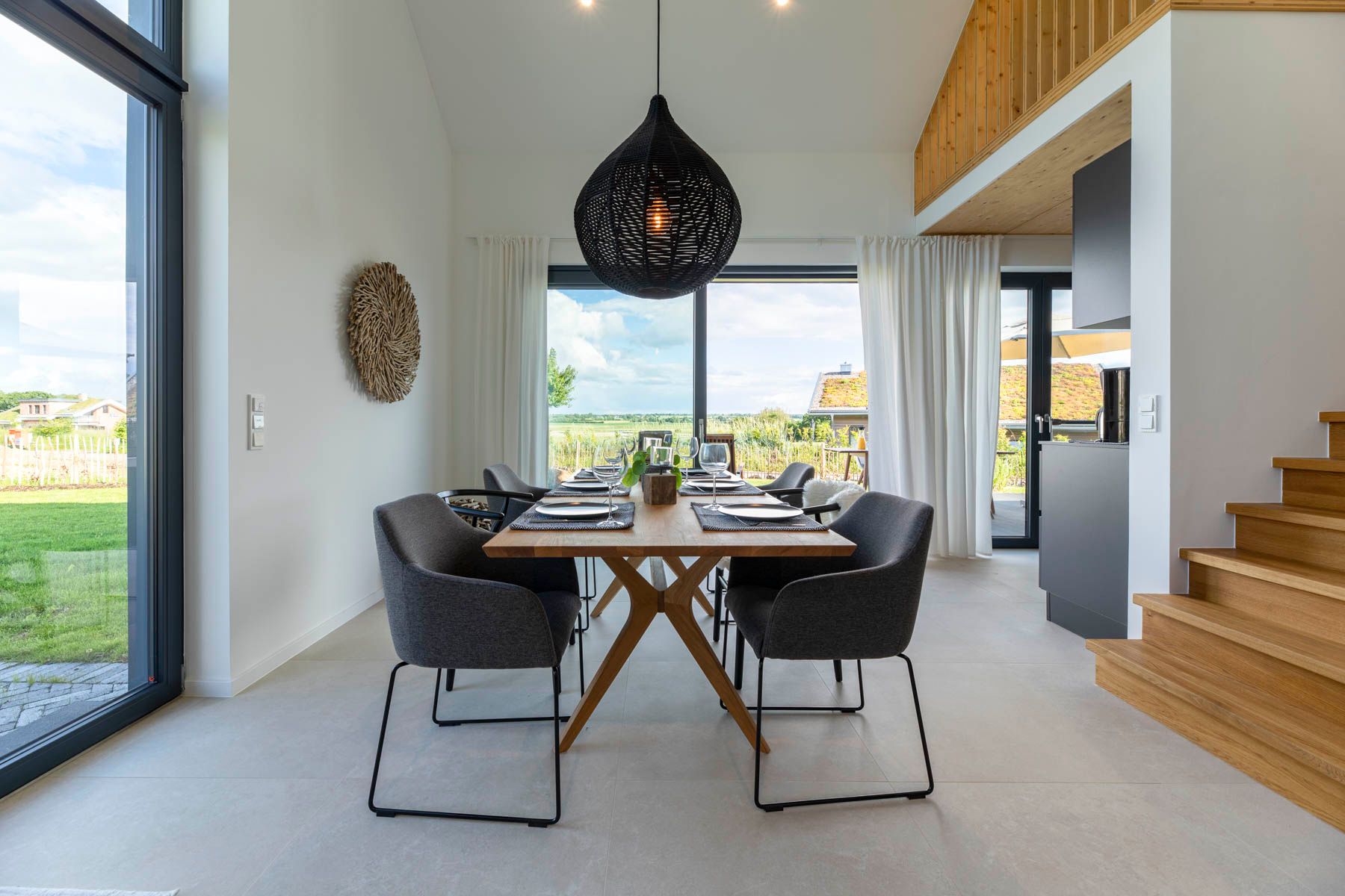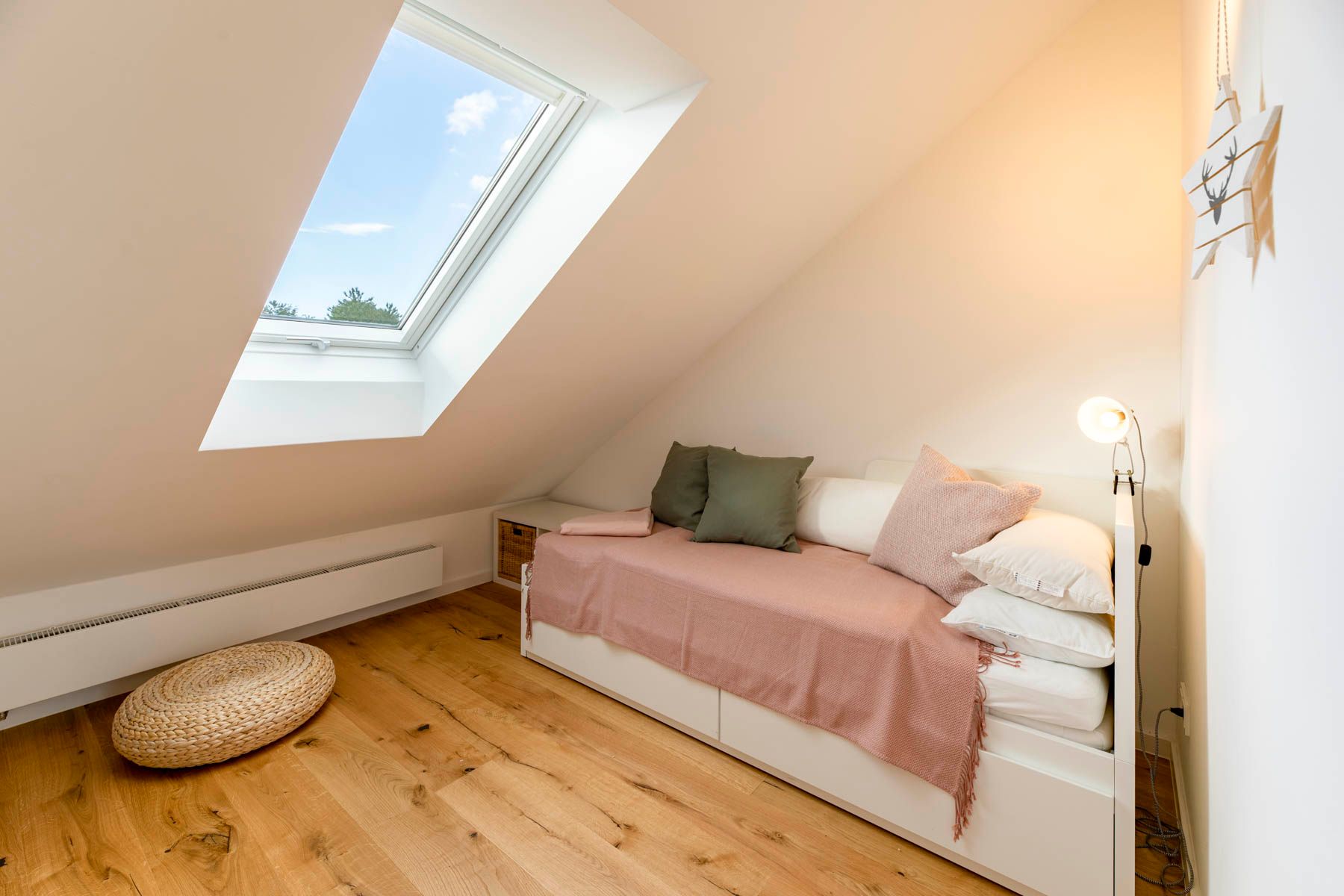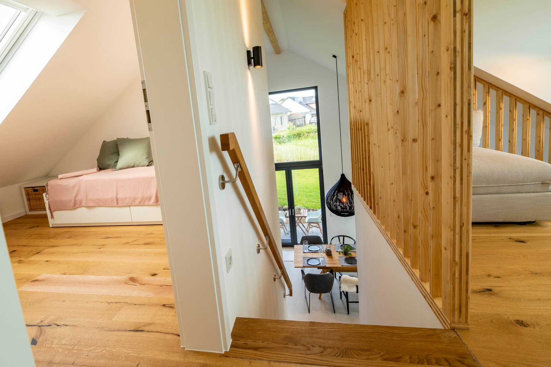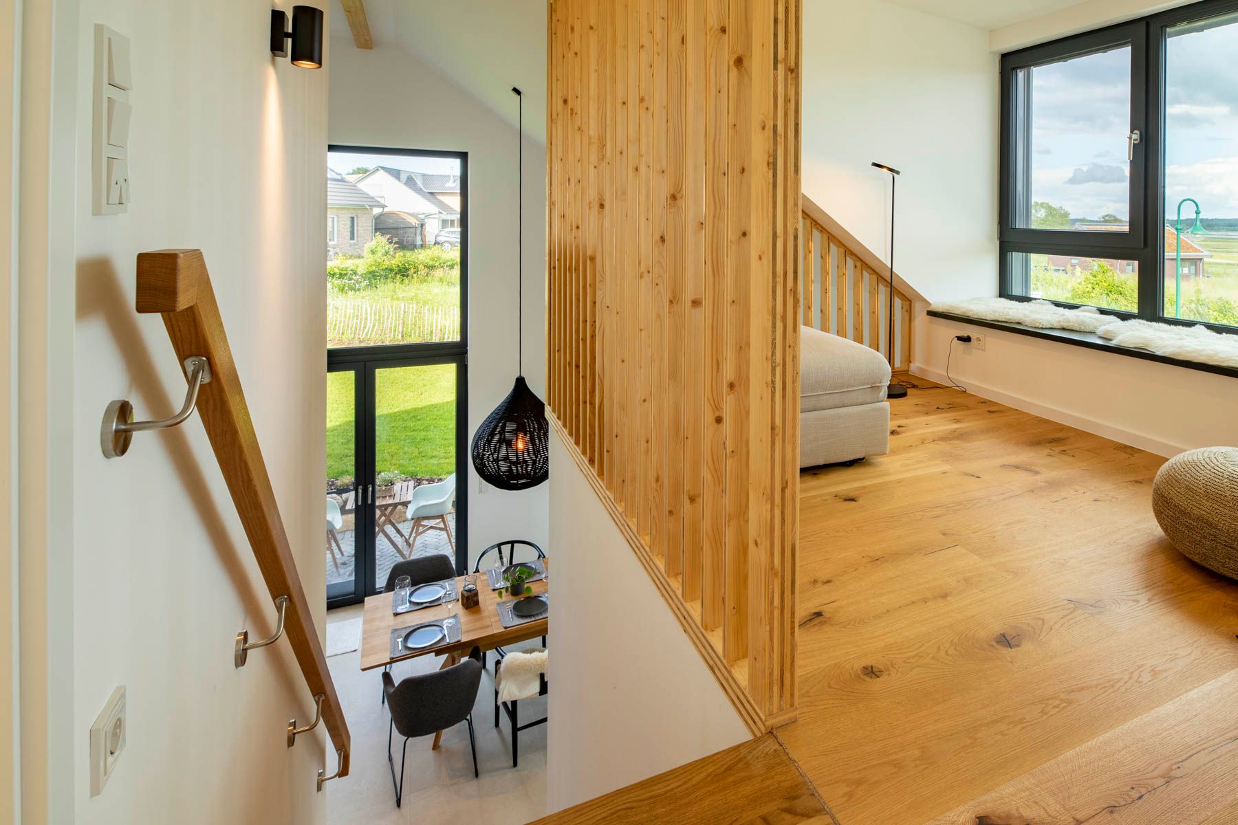 Die Treppe (etwas steiler als regulär / kein Treppenschutzgitter vorhanden) führt zu einem gemütlichem Sitzbereich, der offen gestaltet ist und einen Panoramablich aus einem großen Gaubenfenster bietet. Von einer integrierten Sitzbank aus kann der Blick weit in das Naturschutzgebiet des Sehlendorfer Binnensees wandern. Ein Traum für jeden Natur- und Vogelliebhaber.