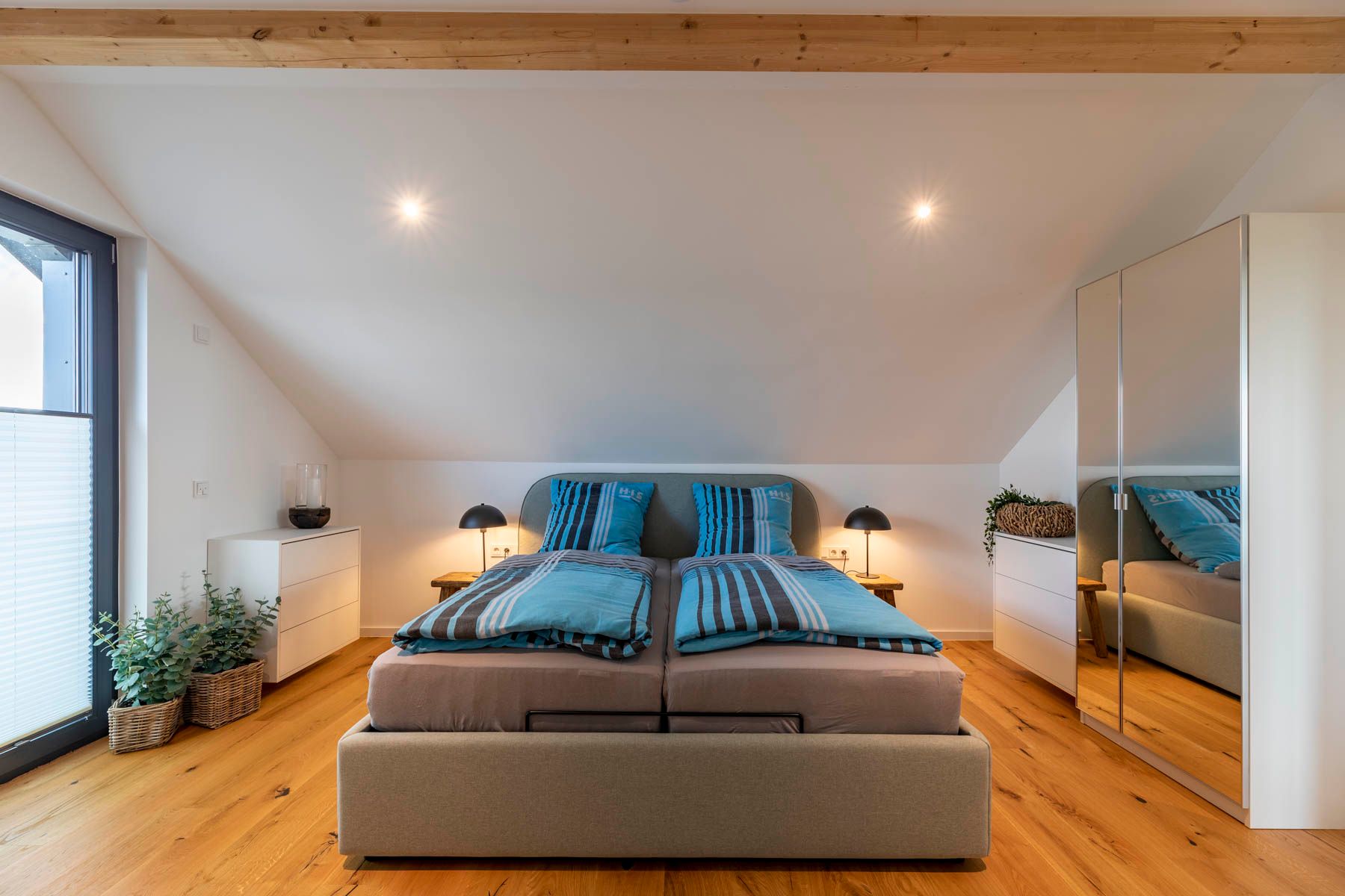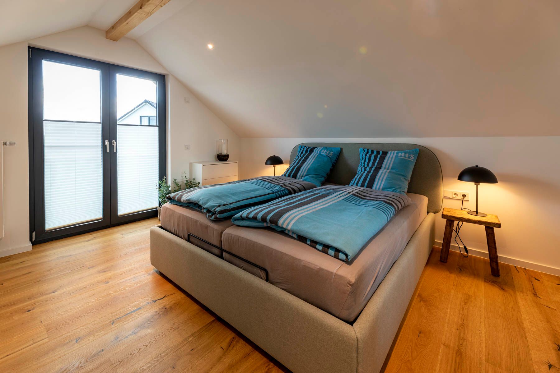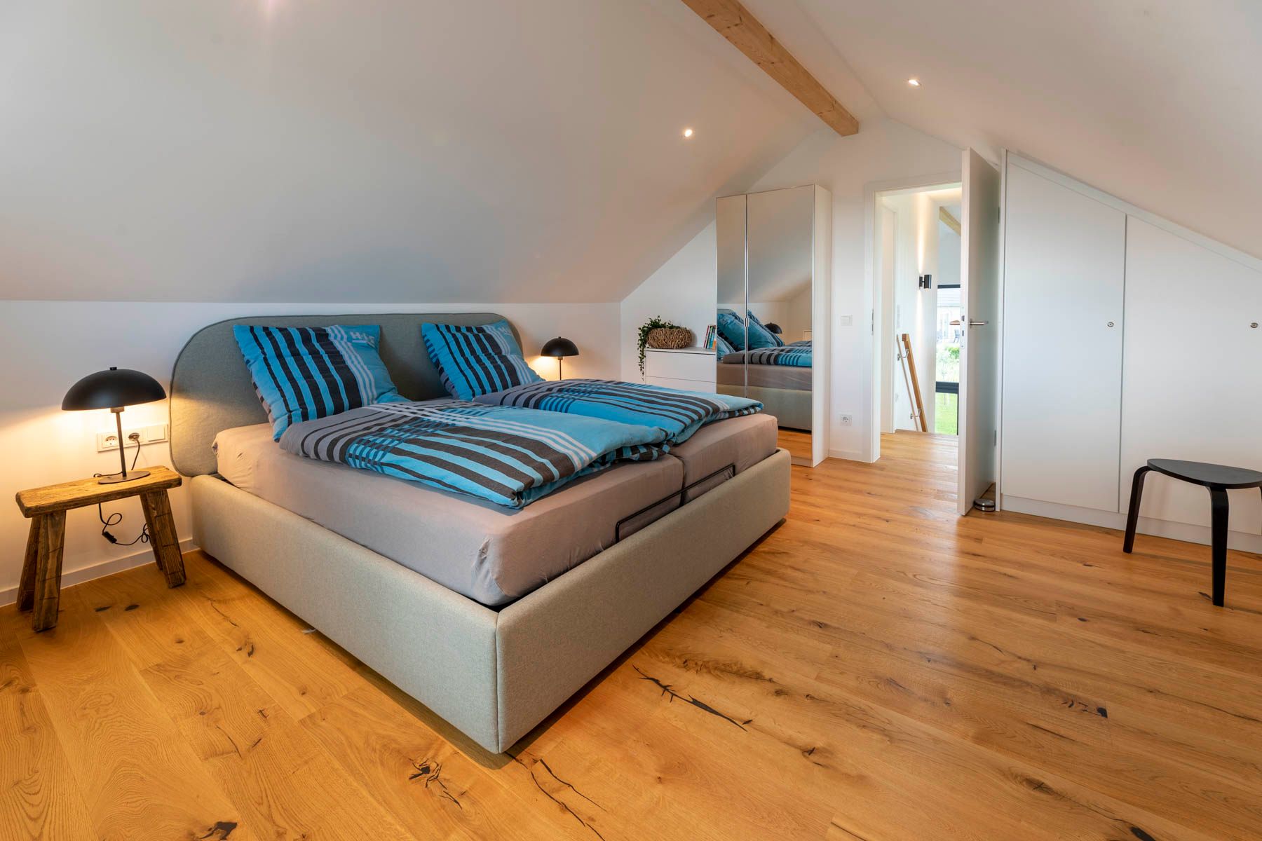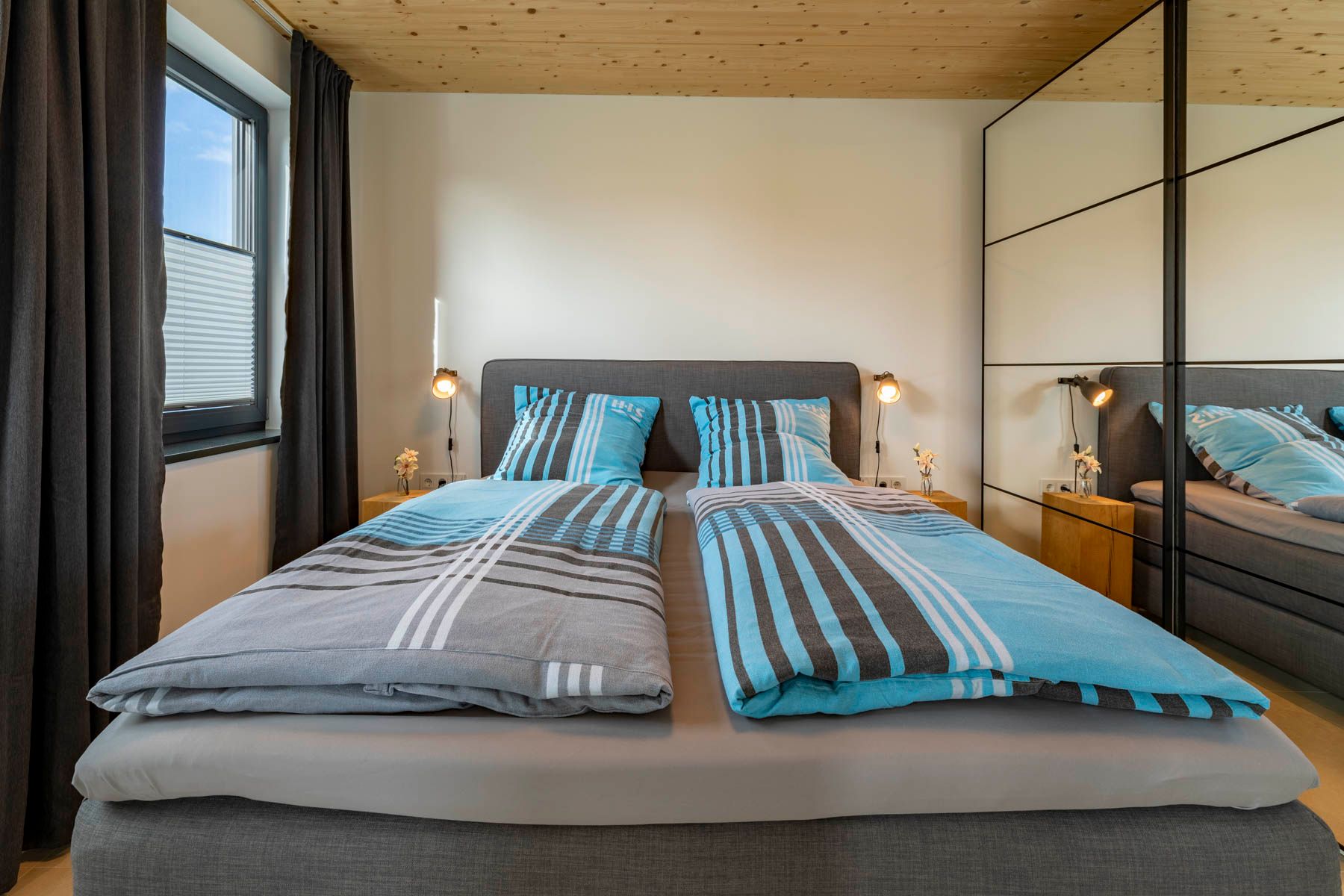 Im 1. OG befinden sich außerdem die beiden weiteren Schlafzimmer. Eines verfügt über ein vollwertiges Doppelbett, ein weiteres über ein Einzelbett, welches mit einer Schubladenfunktion zum Doppelbett umfunktioniert werden kann.