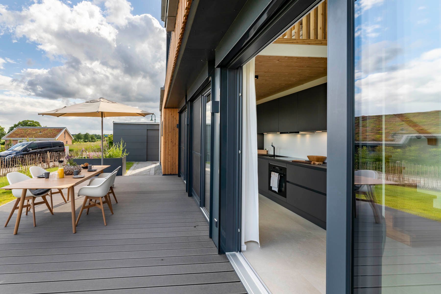 Die offene Küche liegt direkt an der Fensterfront und stellt eine Verbindung zwischen Wohn-, Eingangs- und Außenanlage dar.
