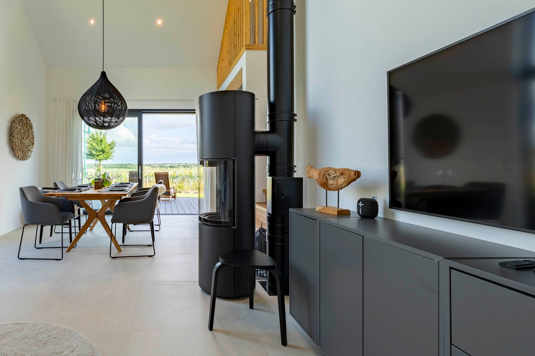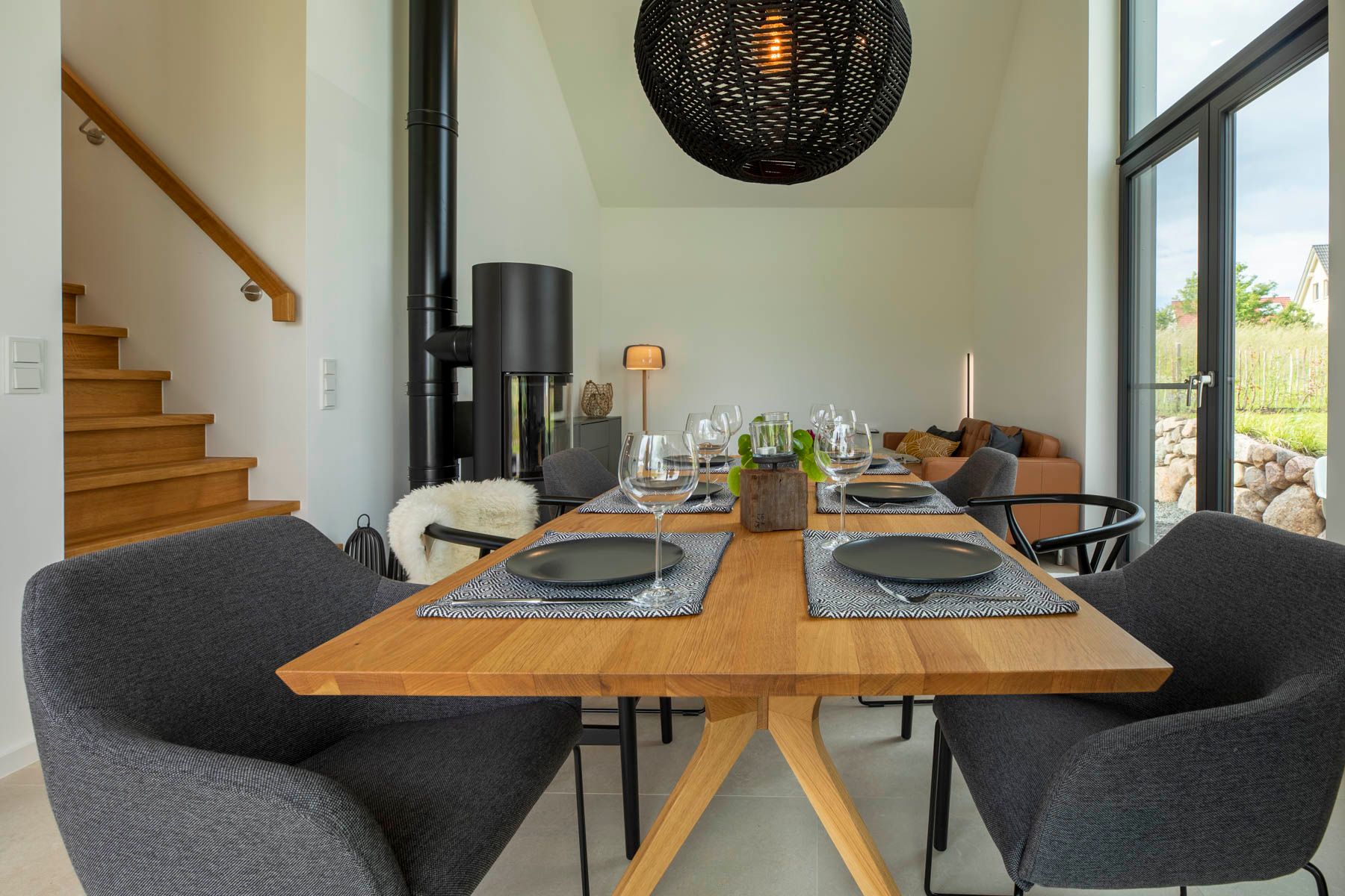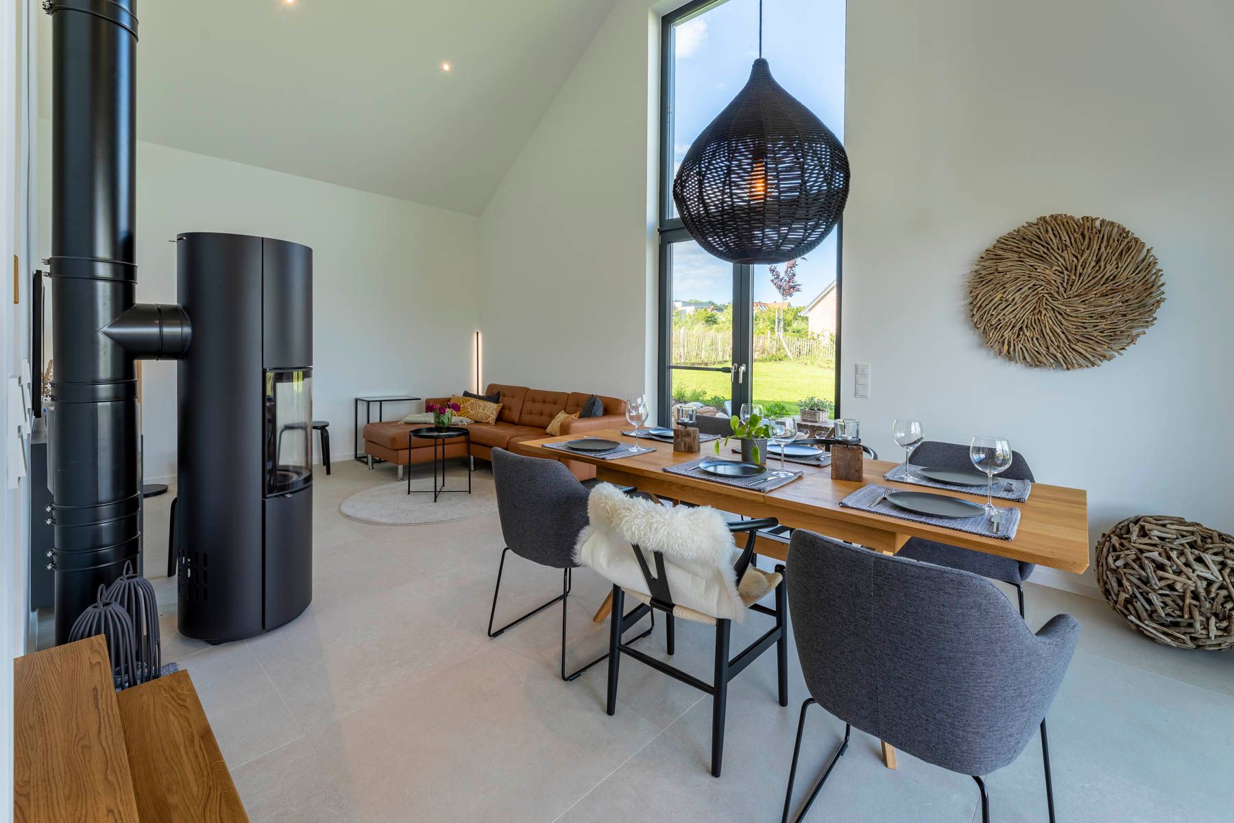 Zentral liegt der Kamin, so dass man im Winter sowohl vom Essplatz als auch vom Sofa einen Blick auf das Feuer haben kann.