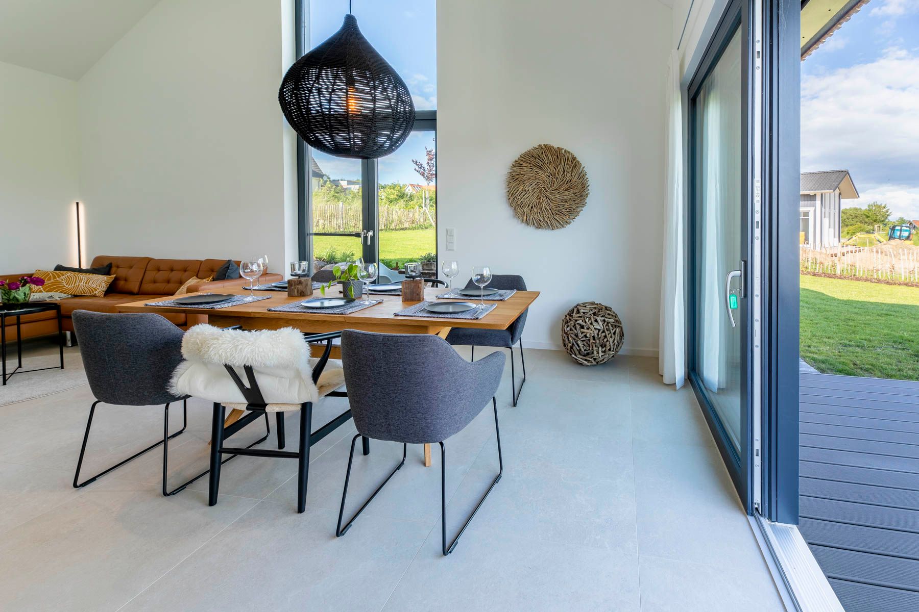 Der angrenzende Wohnbereich ist aufgrund der großen Fensterflächen sehr hell und mit viel Tageslicht erfüllt. Sowohl der Wohnbereich mit Sitzgarnitur und großem Flachbildfernseher als auch der Essbereich sind offen gestaltet.