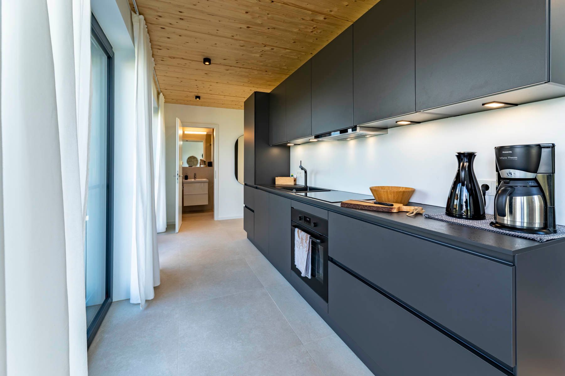 Die Küche ist durch ihre gerade Form besonders geräumig. Neben dem großen Kühlschrank mit Gefriermöglichkeit finden sich hier auch Spülmaschine, Induktionskochfeld mit Backofen, Kaffeemaschine, Toaster, ein Wasserkocher sowie Geschirr, Gläser und Besteck.