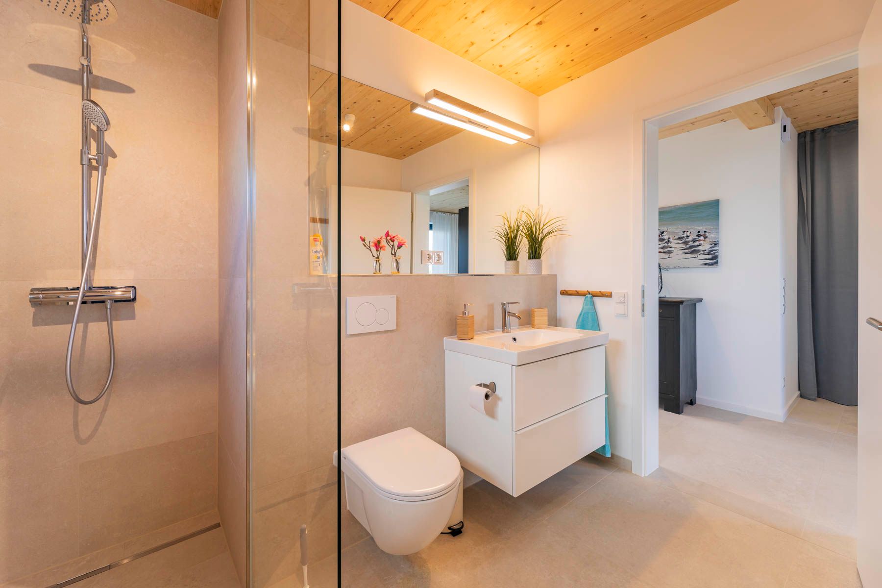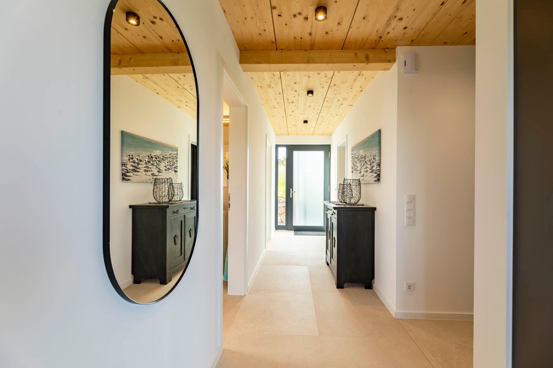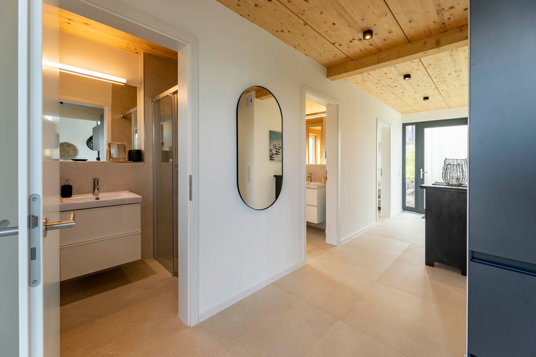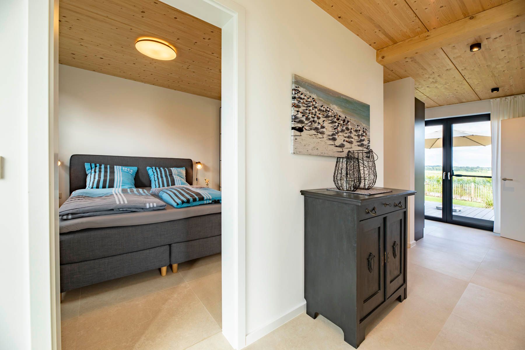 Vom großzügigen Flur kann das ebenerdige Schlafzimmer mit einem Doppelbett und die beiden Badezimmer, sowie die Sauna erreicht werden.