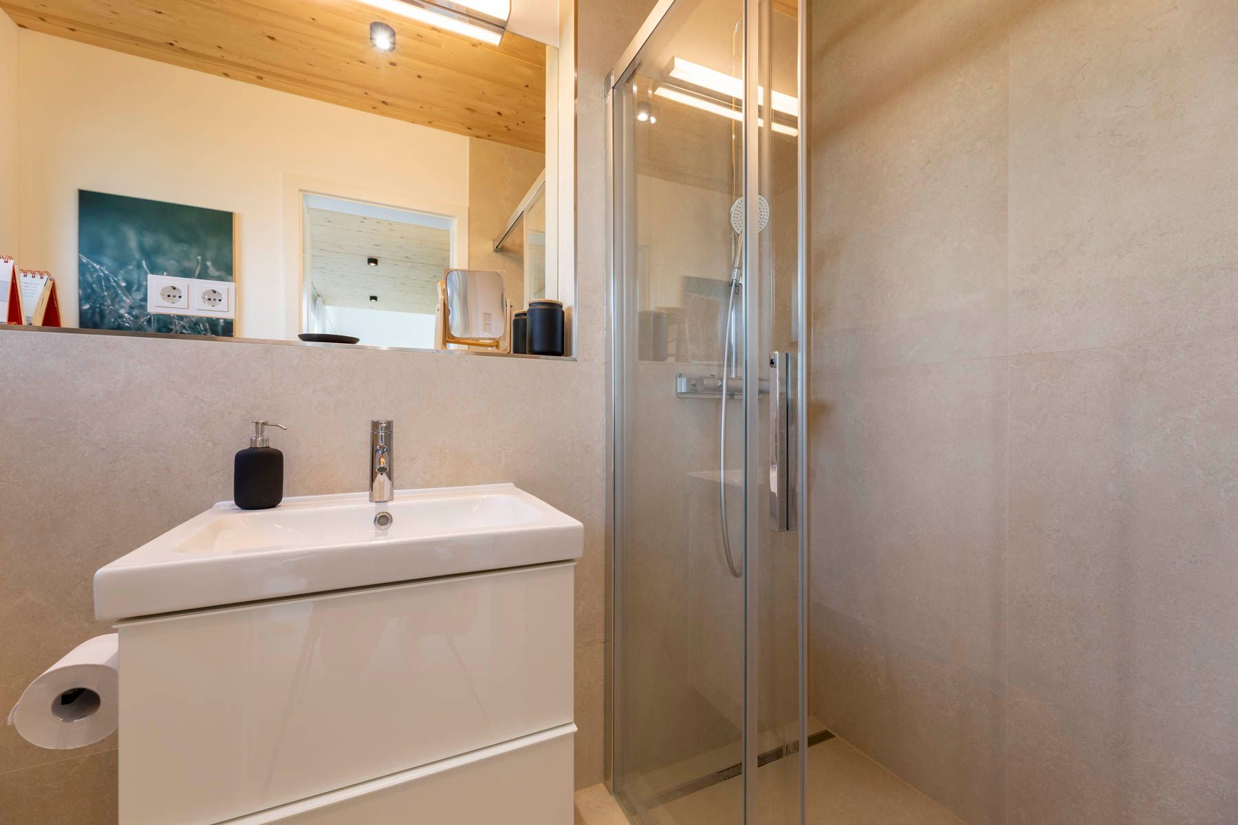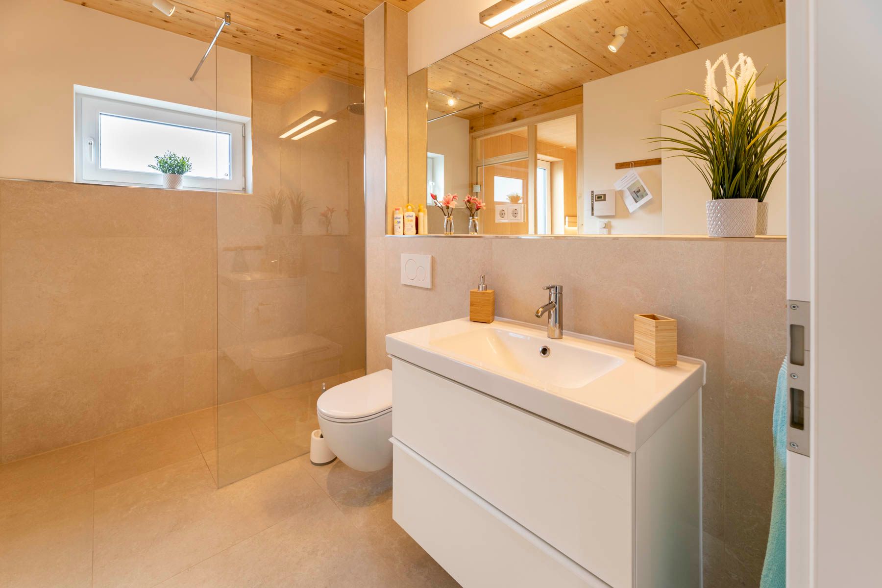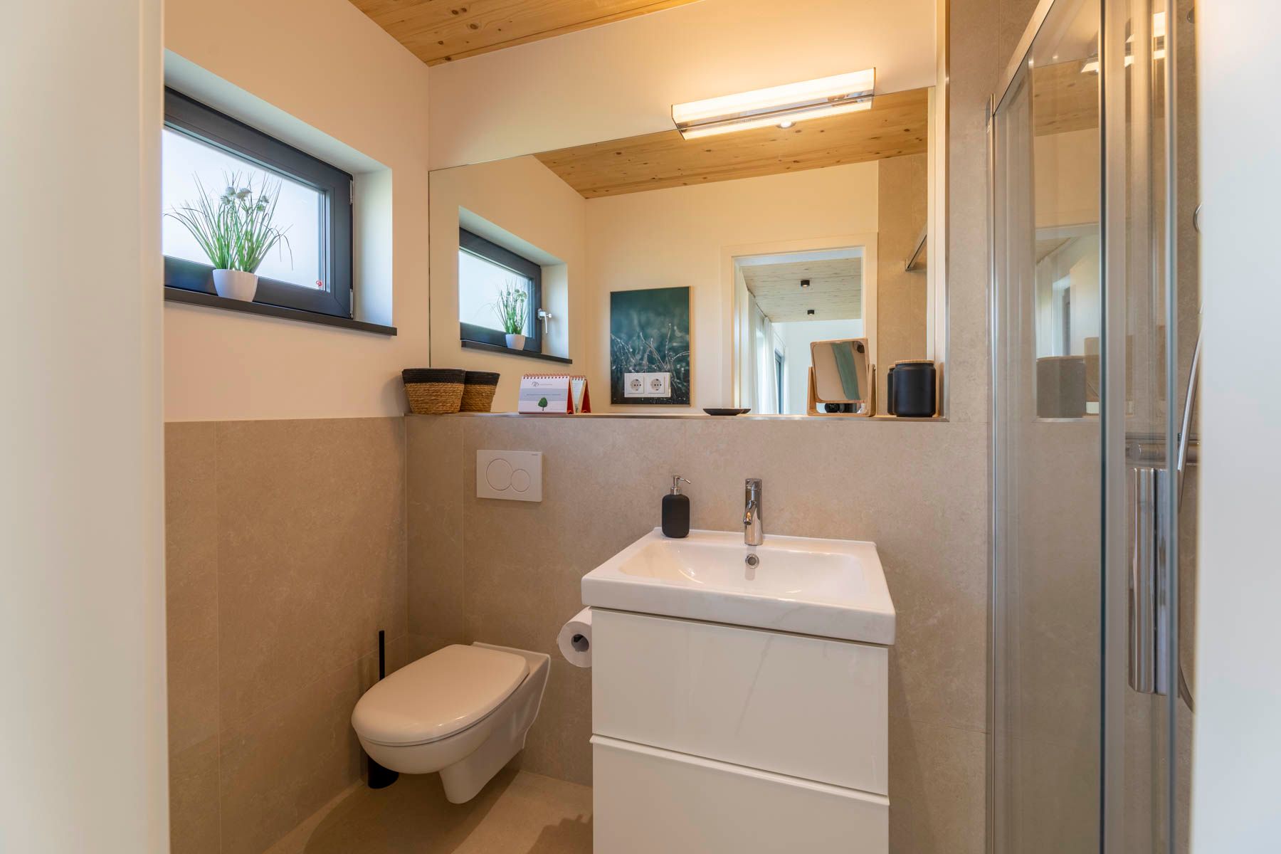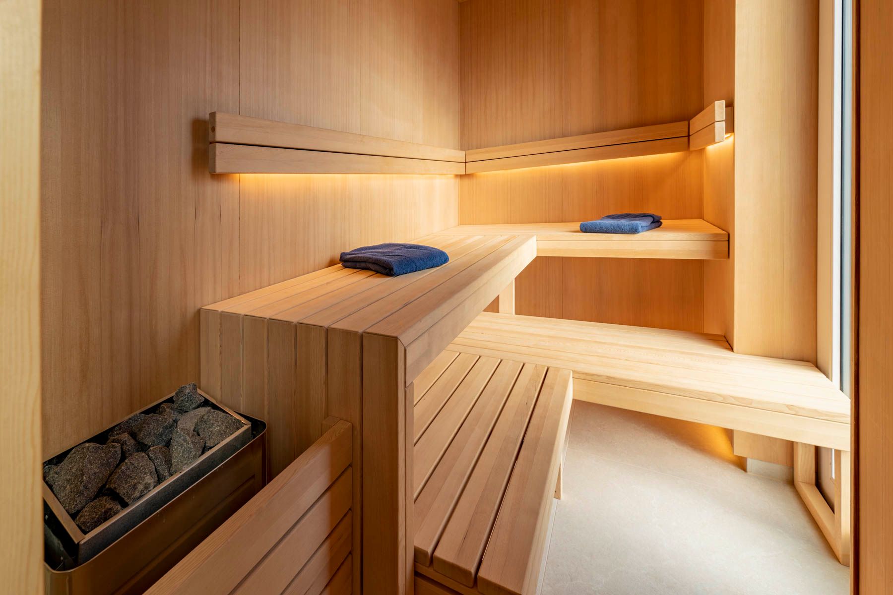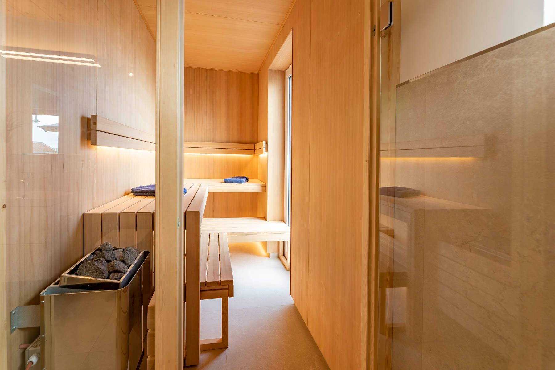 Die zwei Badezimmer mit modernen Wand- und Bodenfliesen sind mit einem Fenster, einer bodentiefen Dusche, Handtuchhaltern, Waschbecken mit Spiegel, Kosmetikspiegel sowie WC ausgestattet. Die modern eingerichtete Sauna schließt sich direkt an das größere Bad an.