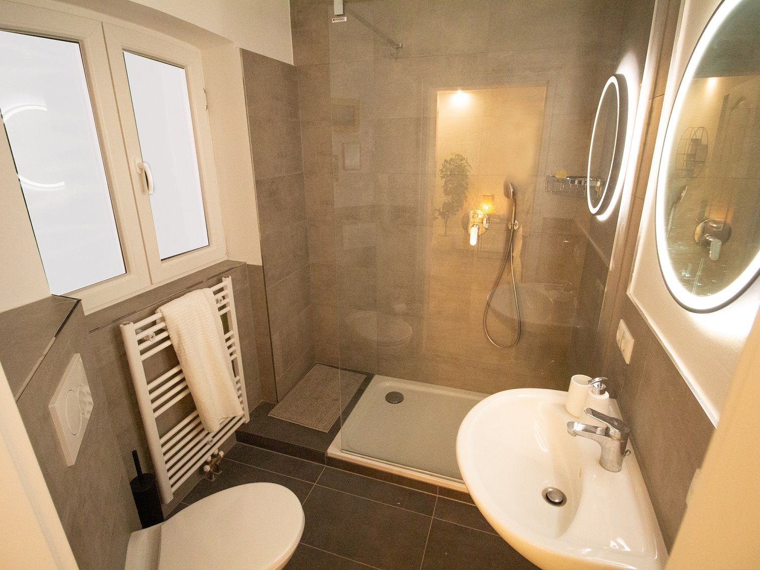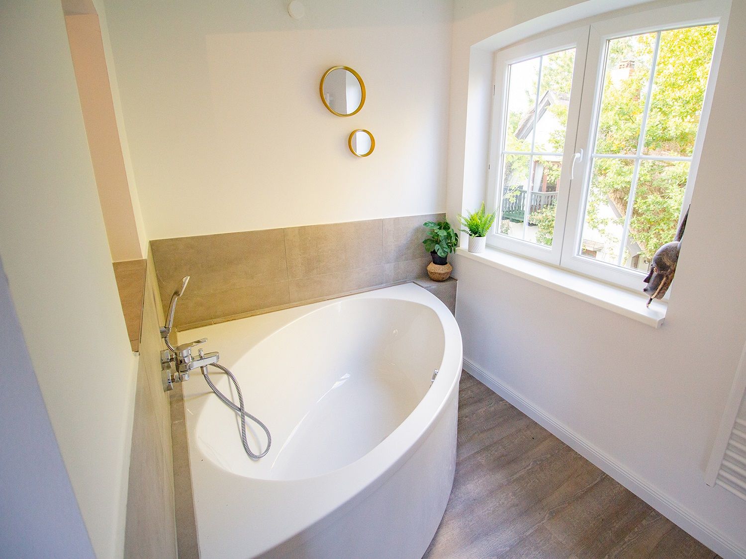 Neben einem kleineren Duschbad gibt es ein großes Bad mit Badewanne für romantische Stunden bei Kerzenschein und Musik.