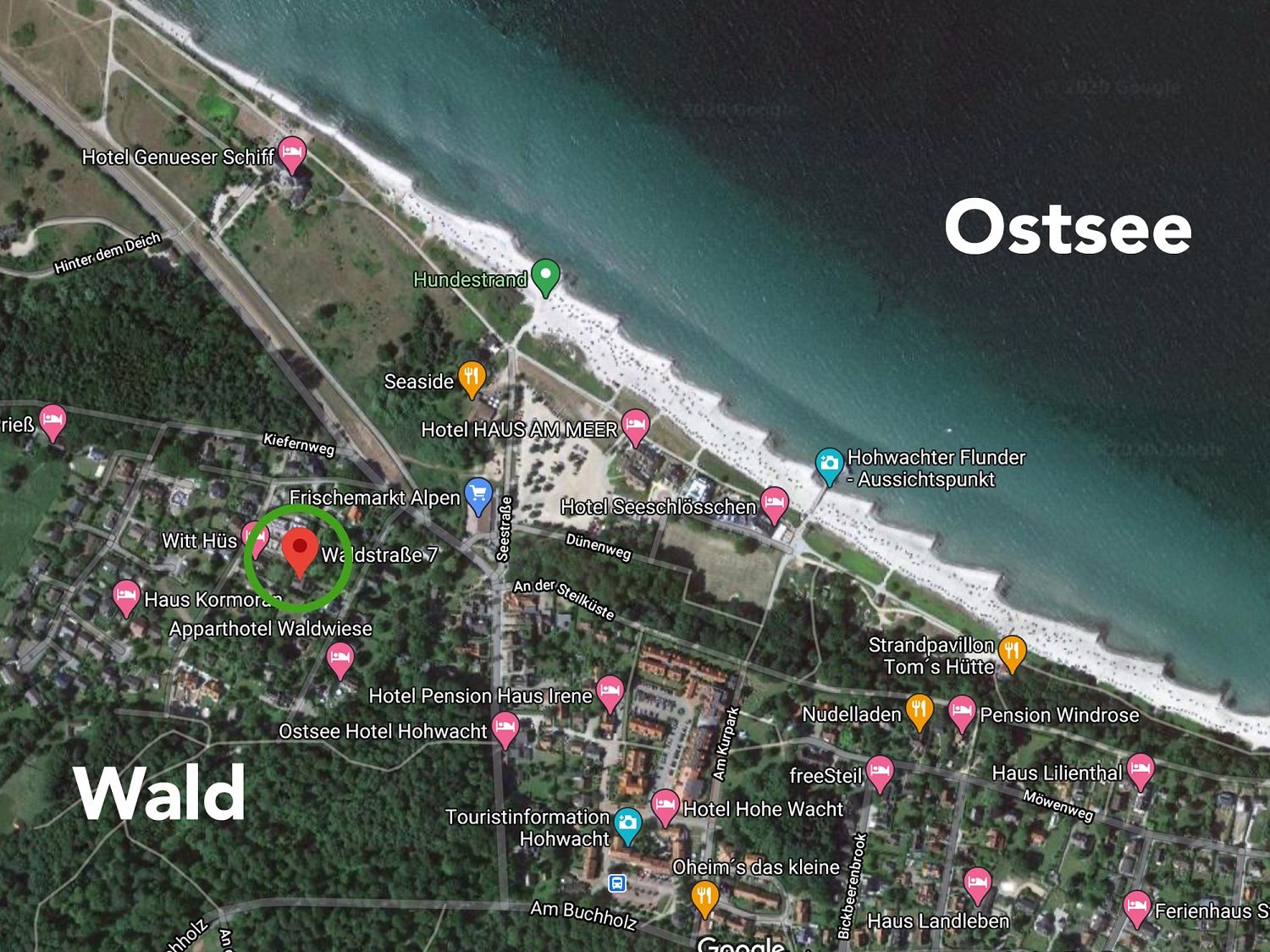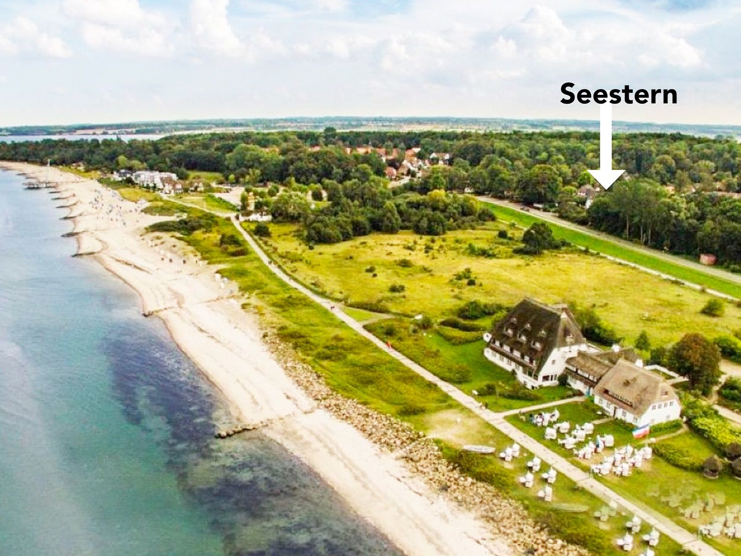 Das Strandhaus Seestern liegt in illustrer Nachbarschaft zwischen romantischen Reetdachhäusern und Villen in der „Bellevue“ von Hohwacht – der Waldstraße. Den Besucher erwartet am Eingang ein wunderschön angelegter Garten von fast 1000m2, welcher zum Strandhaus führt, das wohl behütet und auf angenehme Weise fernab von der Welt im hinteren Teil - eingebettet von Bäumen - liegt.