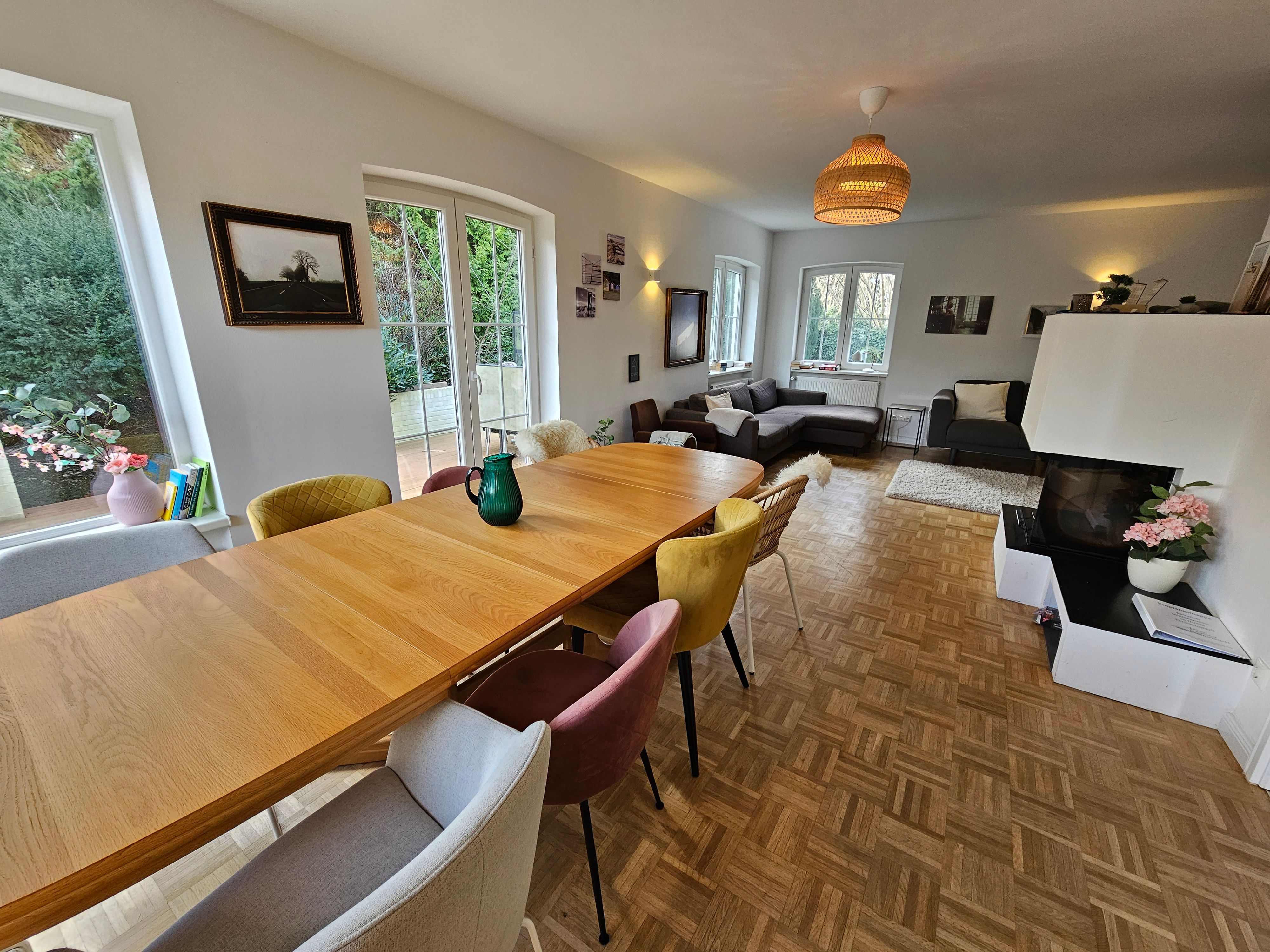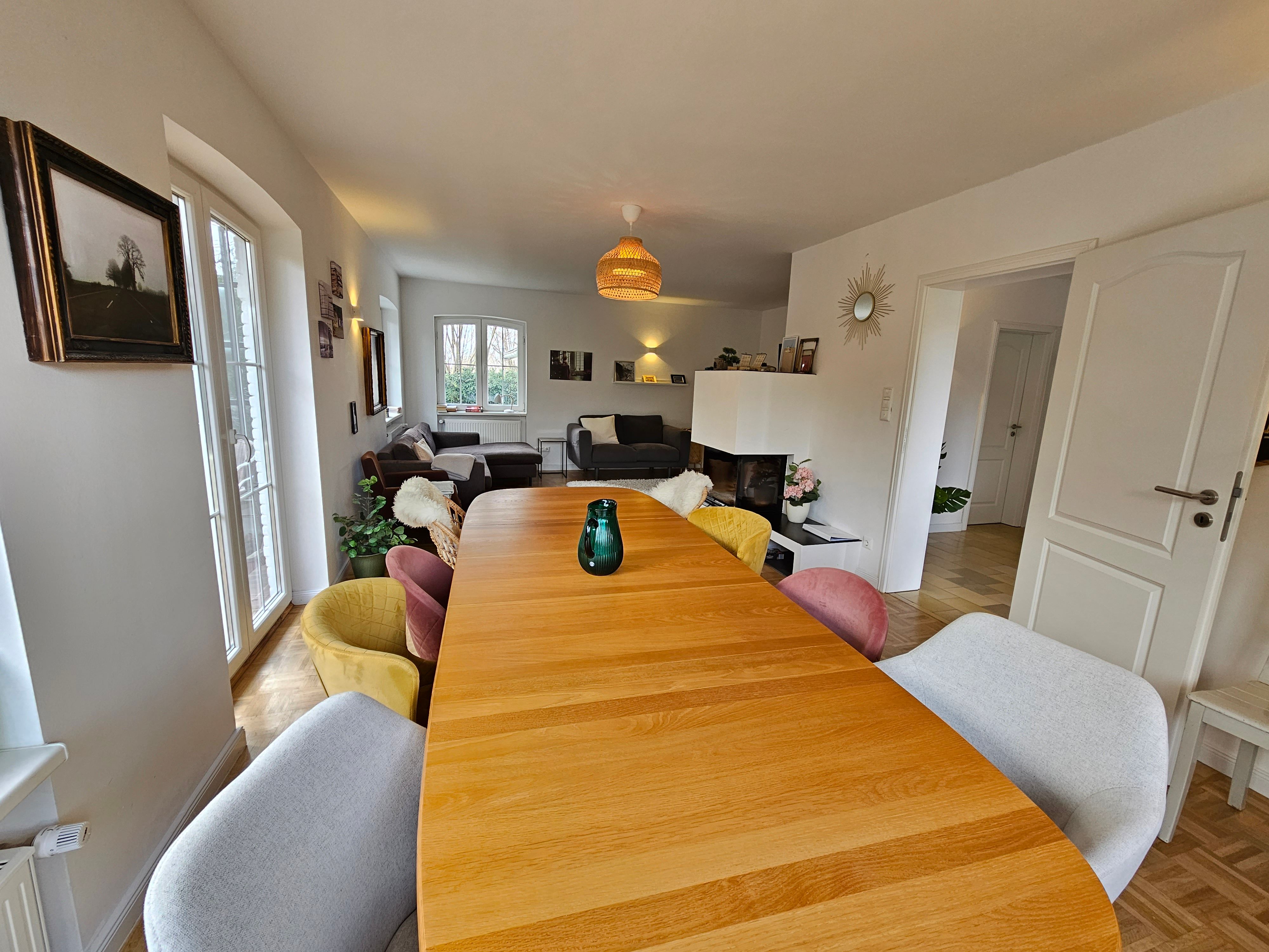 Das Untergeschoss hat ein sehr großzügiges Wohnzimmer mit maßgefertigtem Kamin, einem 75“ Samsung Fernseher und einer Essecke mit großen Fenstern. Von hier aus kommt man auch direkt auf die große Terrasse und in den Garten. Hier können Sie morgens frühstücken oder nachmittags in der Strandliege die Seele baumeln lassen!