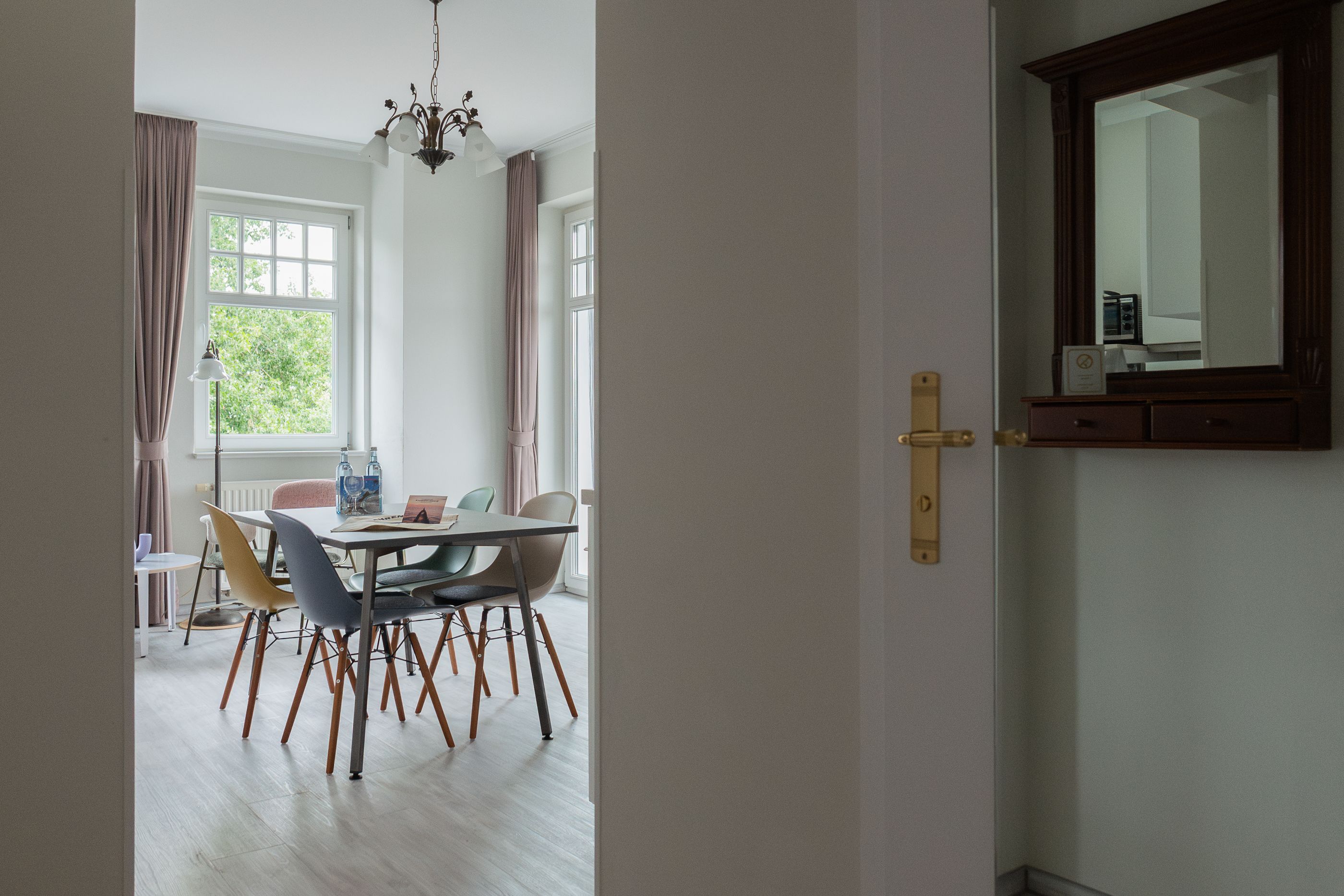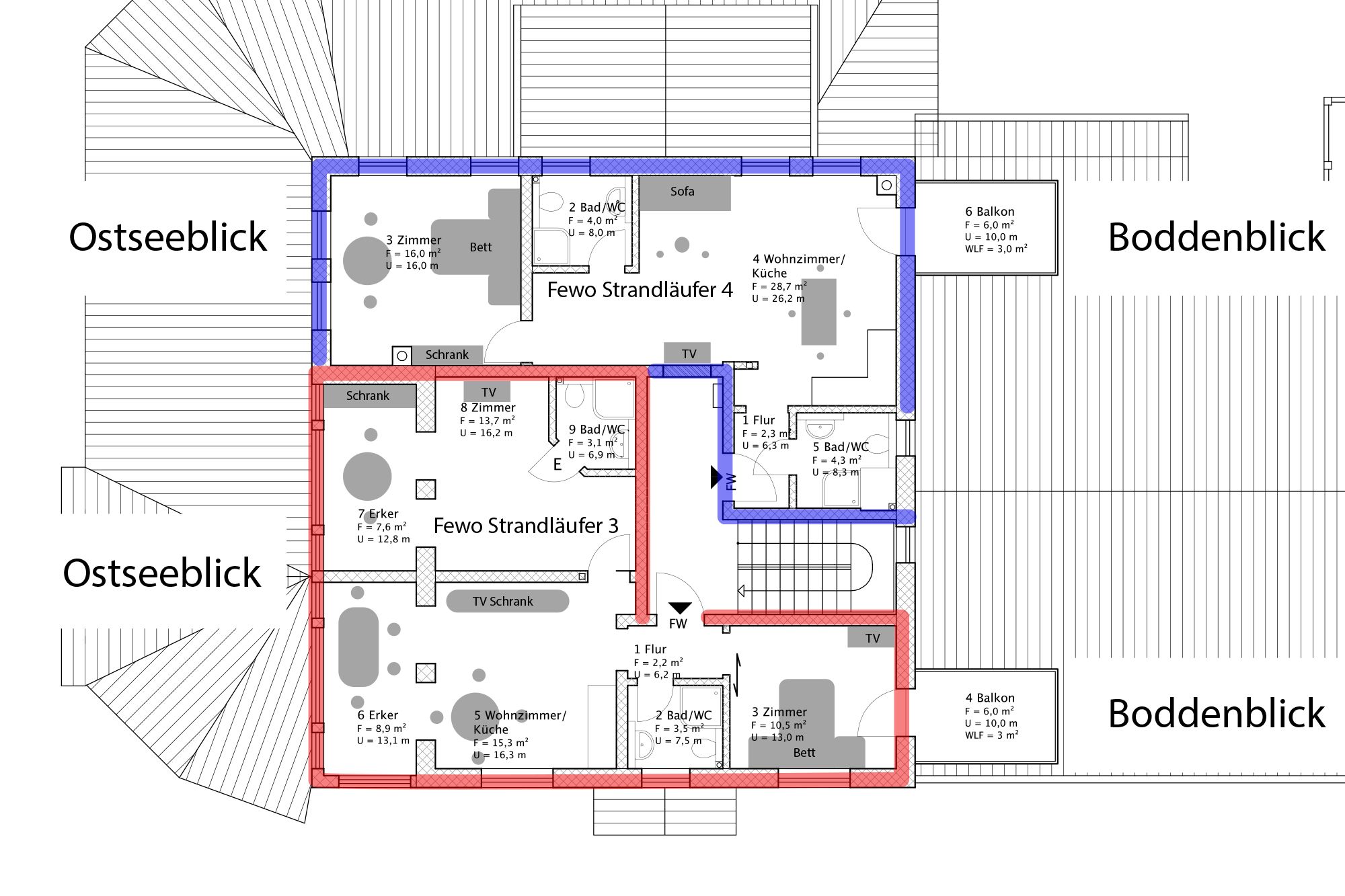 Die Unterkunft „Strandläufer 4“ befindet sich im zweiten Obergeschoss des Haupthauses Strandläufer und ist über den Seiteneingang zu erreichen. Großzügige Räume, helle Farben und ein Mix aus modernem Mobiliar und Möbeln im Stil der Gründerzeit machen diese Ferienwohnung zu einem besonderen Urlaubsdomizil. Vom Flur mit Garderobe gelangst du direkt in den offen gestalteten Wohn-und Küchenbereich mit Austritt auf den Balkon. Ob mit Familie oder Freunden, es gibt genügend Platz zum gemeinsamen Kochen und Klönen. Die gemütliche Couch im Wohnraum kann ausgezogen werden und dient als Aufbettung für bis zu zwei Personen. Ein weiteres Highlight bietet das Schlafzimmer in Richtung Ostsee. Hier genießt du einen traumhaften Blick auf das Meer mit seinen spektakulären Sonnenuntergängen. Ausgestattet mit einem großem Doppelbett, bekommst du garantiert den erholsamen Schlaf, den du dir im Urlaub wünschst. Für noch mehr Wohnkomfort sorgen die beiden Badezimmer mit Dusche und WC.