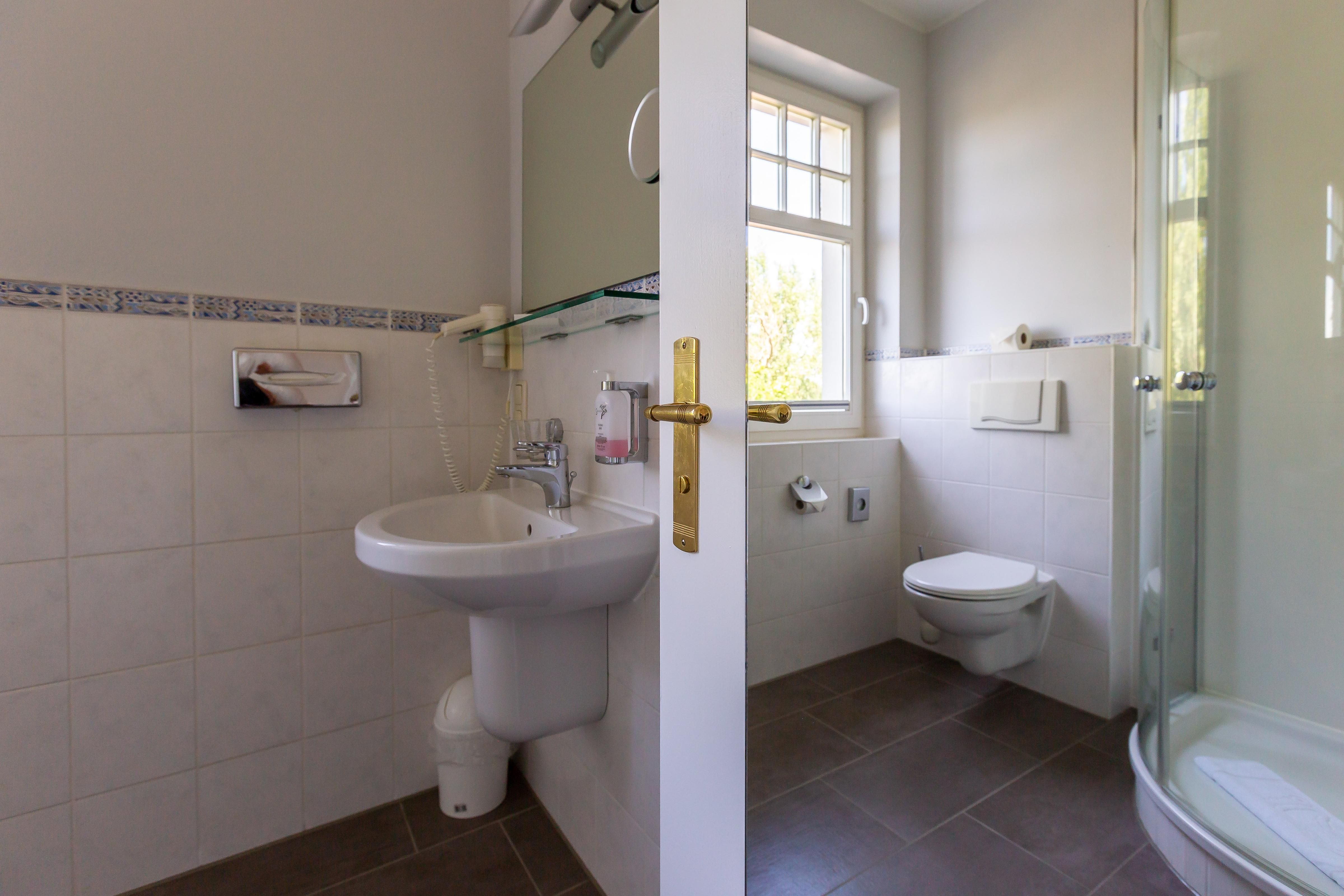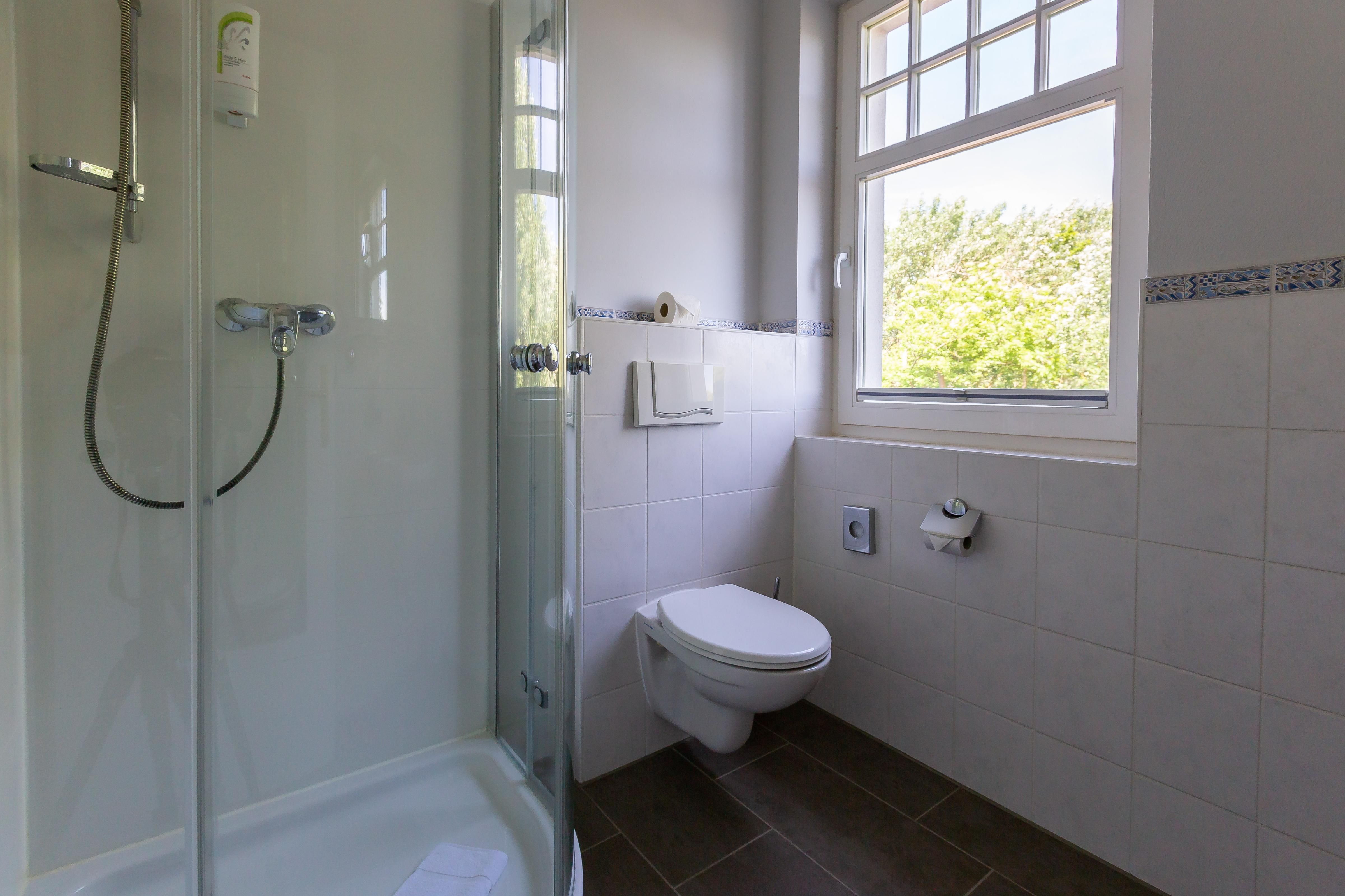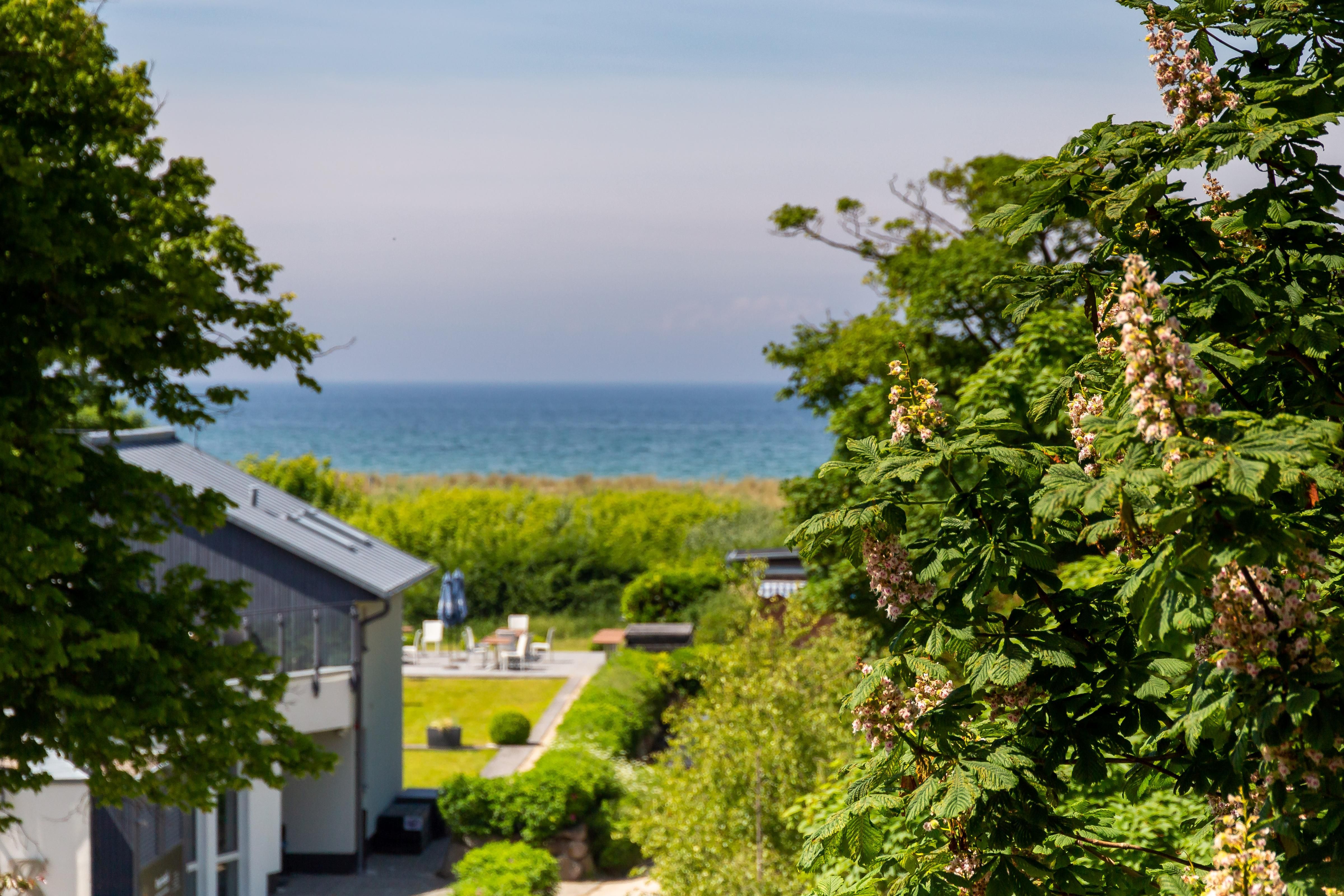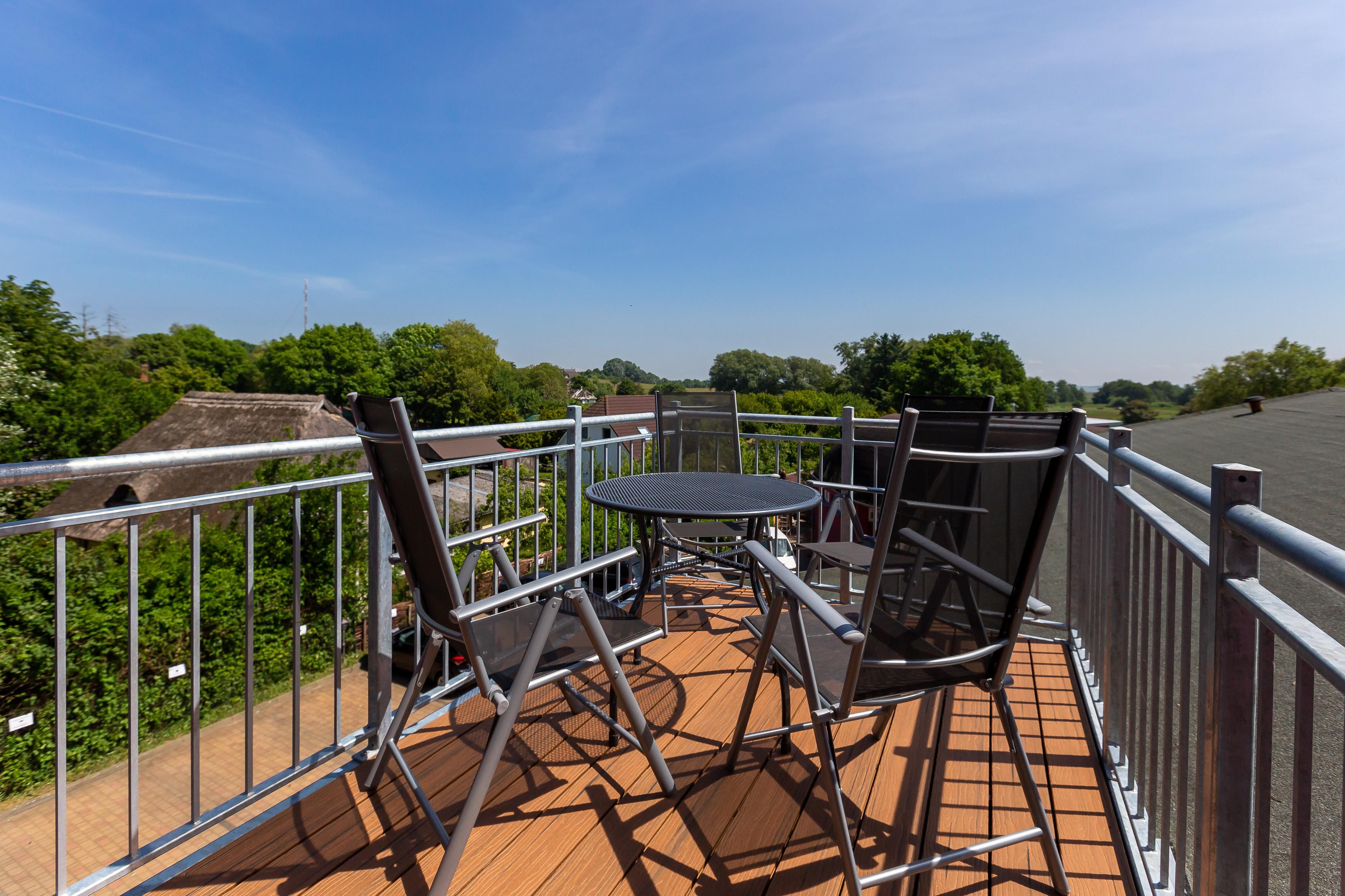 Im Außenbereich steht dir ein Balkon mit Tisch und Stühlen zur Verfügung. Der herrliche Ausblick wird dich begeistern. Denn hier kann dein Blick über die Reetdächer bis zum Bodden schweifen. Es ist der perfekte Platz, um einen der berühmten und lichtdurchtränkten Sonnenaufgänge zu beobachten, die so einmalig auf der Halbinsel sind.