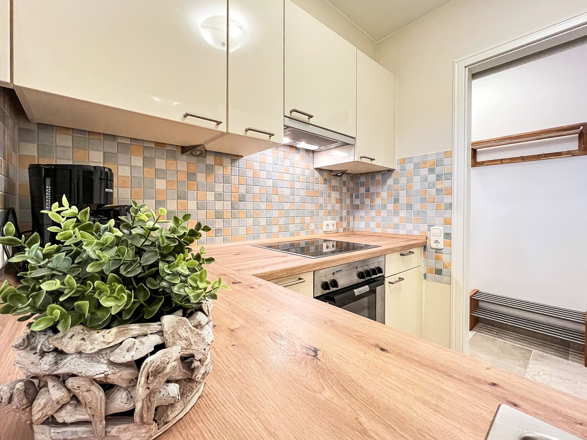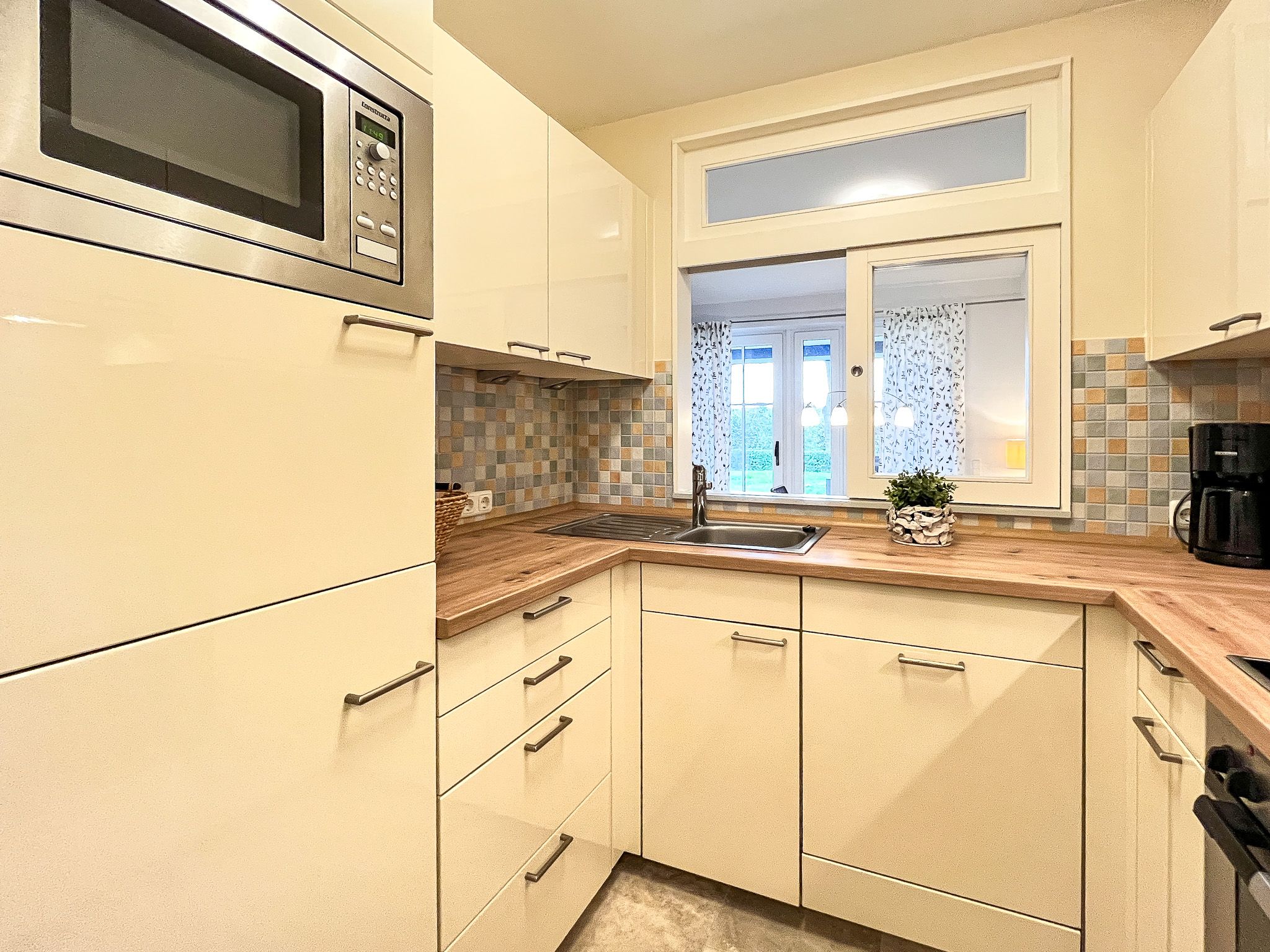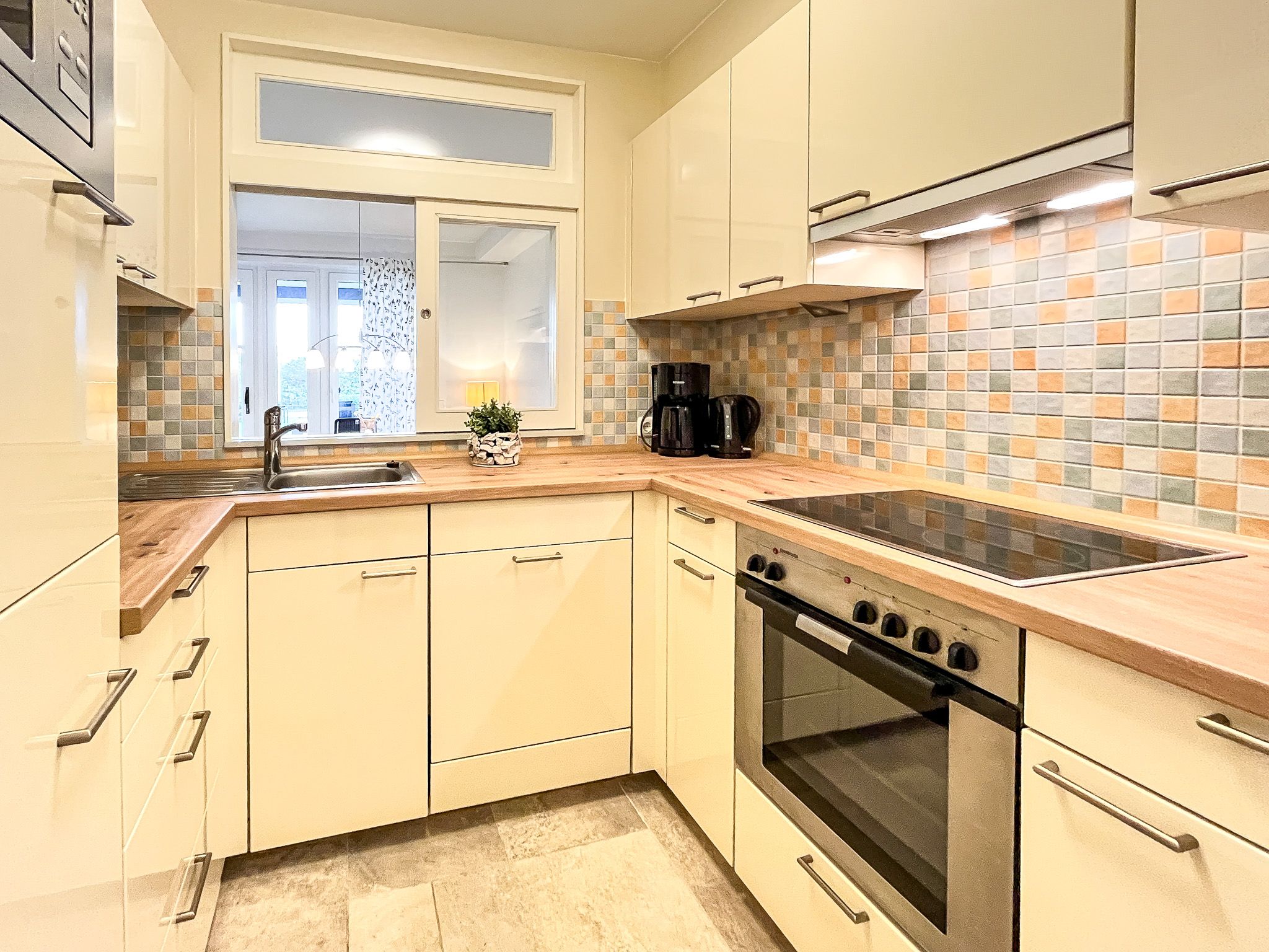 Die gut ausgestattete Küchenzeile der Ferienwohnung verfügt über einen Geschirrspüler, ein 4-Platten-Cerankochfeld, eine Dunstabzugshaube, einen Kühlschrank mit Gefrierfach und eine Mikrowelle.