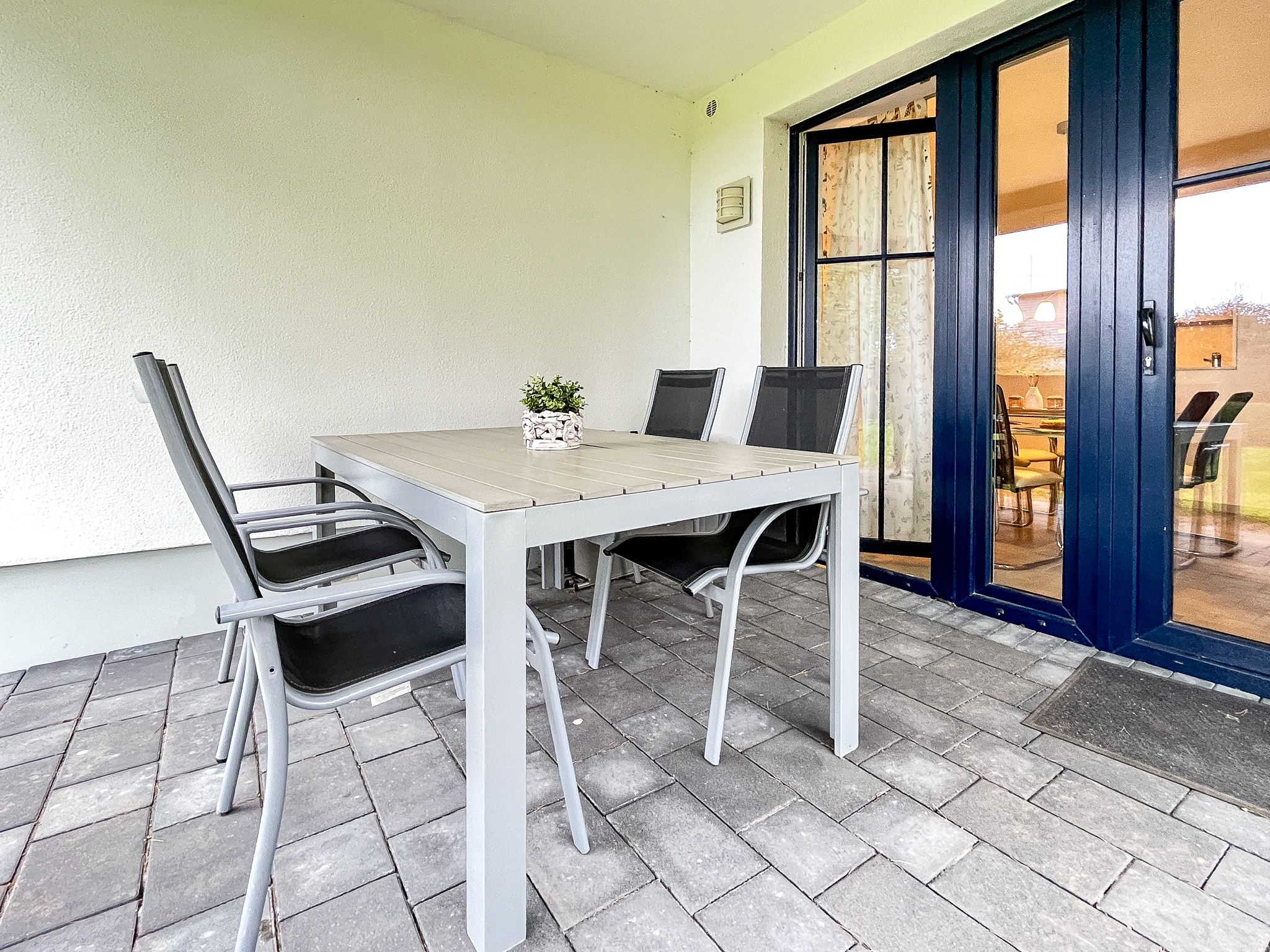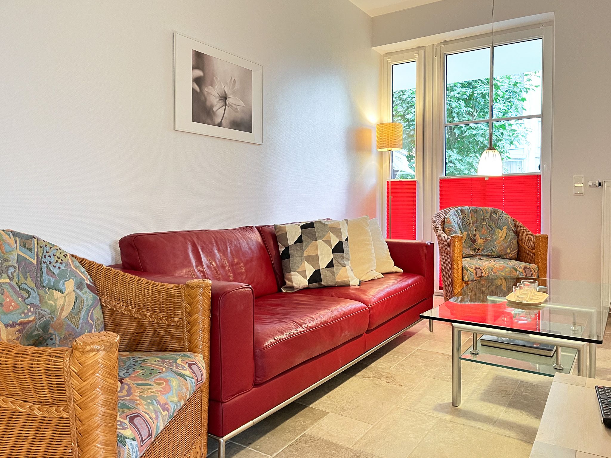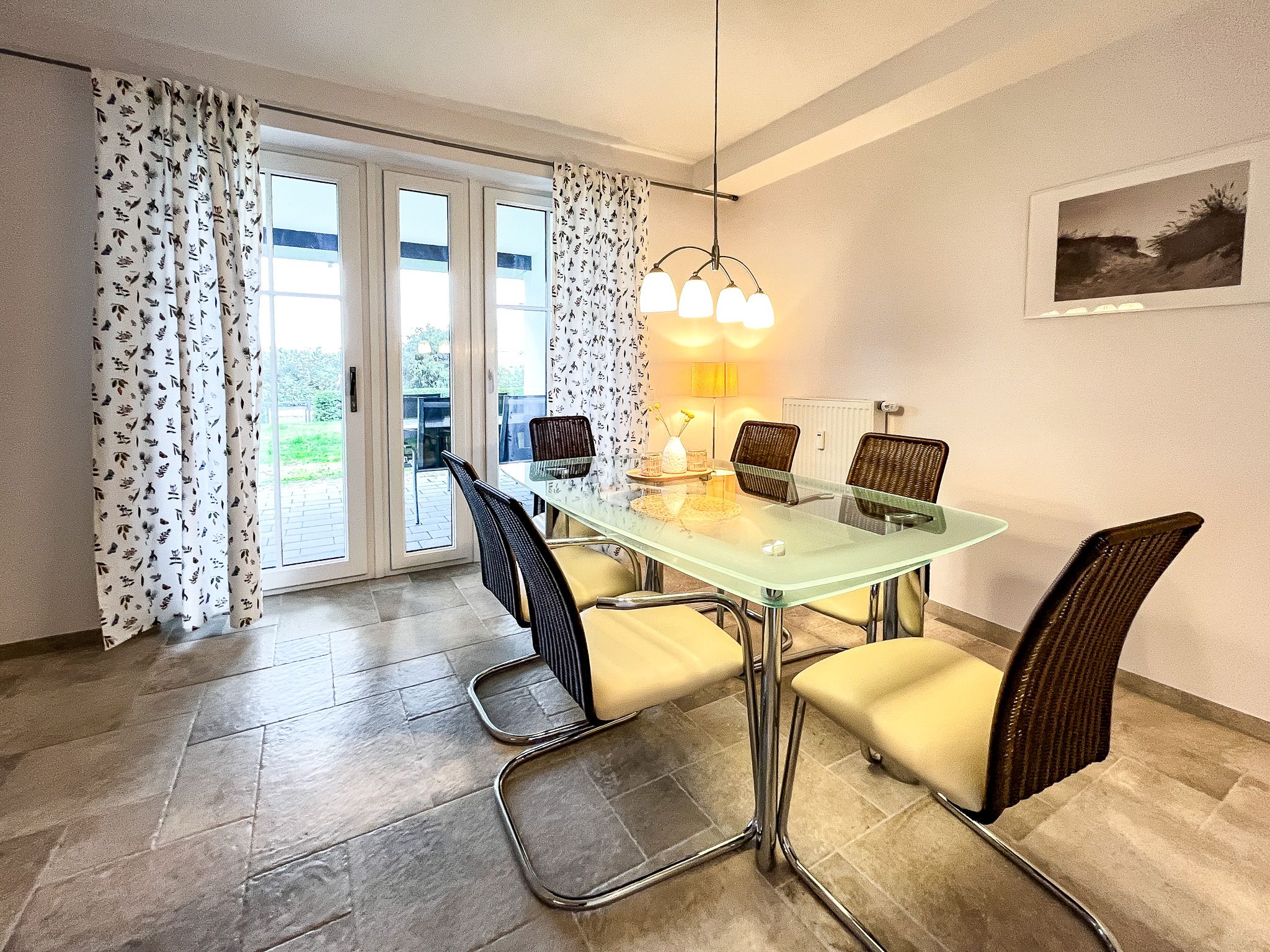Im modern eingerichteten Wohnzimmer sorgt ein Bullerjan für Gemütlichkeit - somit ist auch ein Urlaub in der kalten Jahreszeit empfehlenswert. Zur Unterhaltung stehen dir ein Flatscreen-TV und eine Stereoanlage zur Verfügung. Der gemütliche Essbereich bietet Platz für kulinarische Genüsse. Vom Wohnzimmer aus gelangst du auf die nord-westlich ausgerichtete Terrasse. Bequeme Terrassenmöbel, eine Liege und ein Strandkorb laden zum Ausspannen ein.