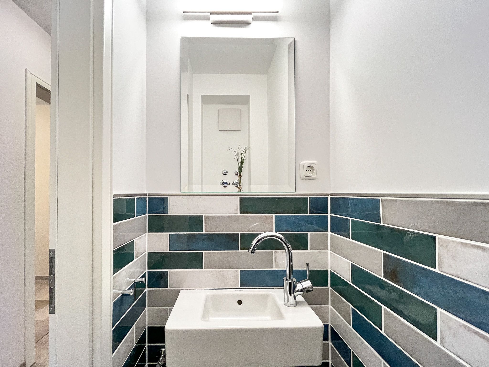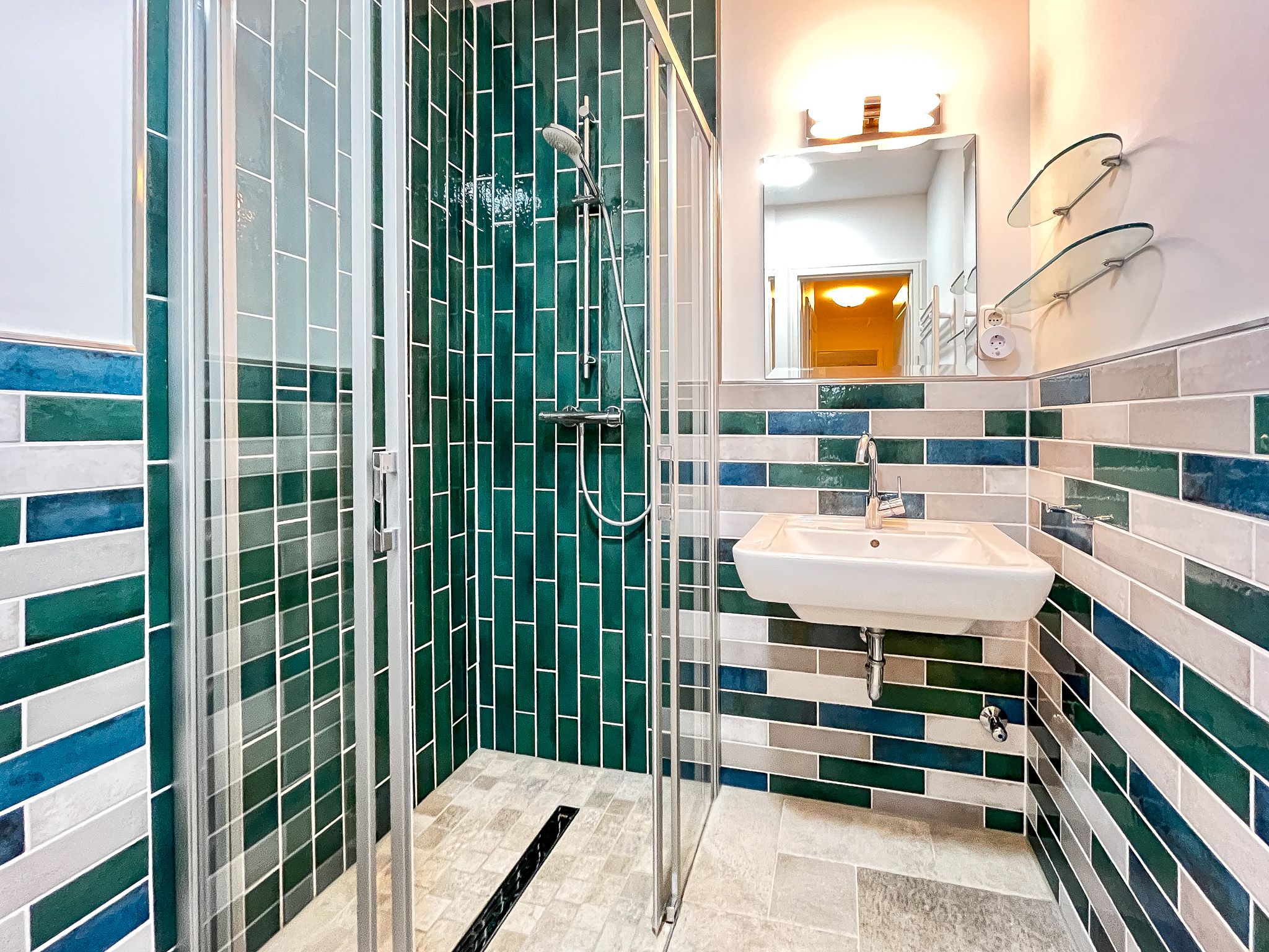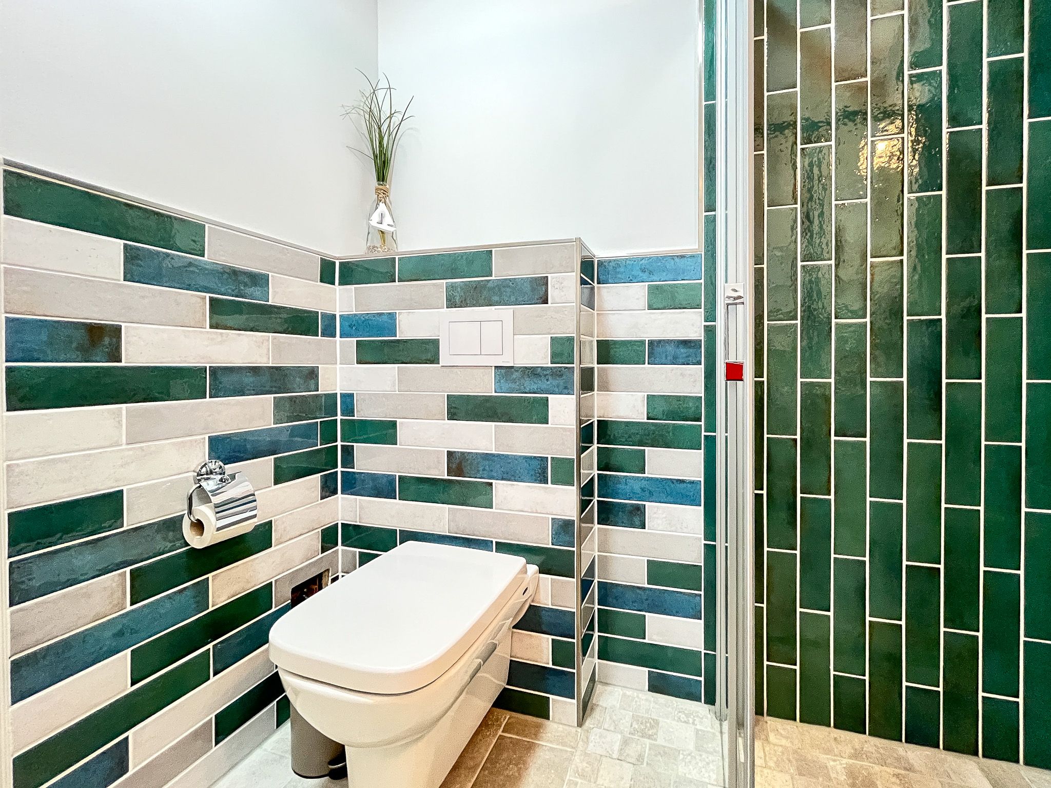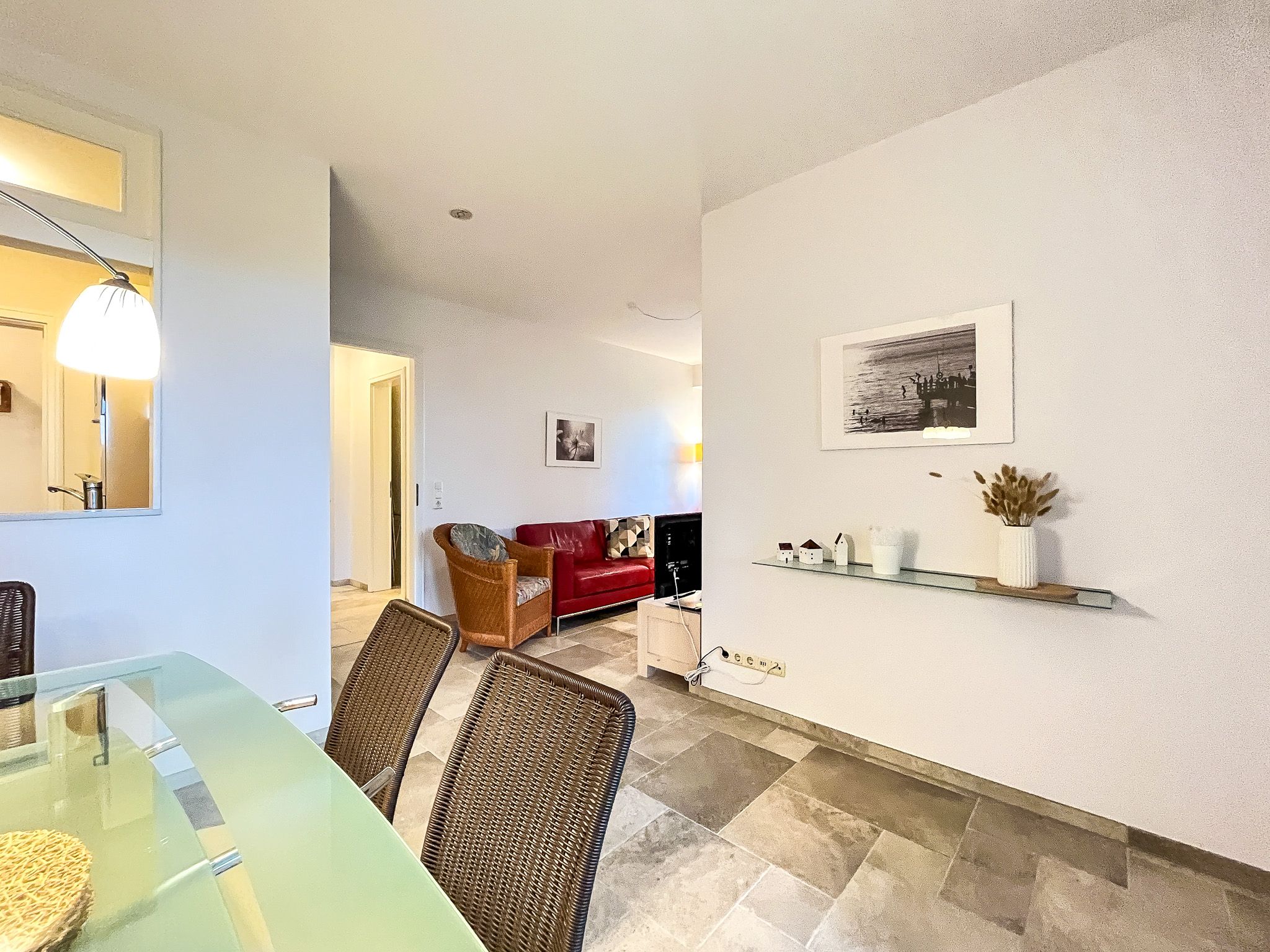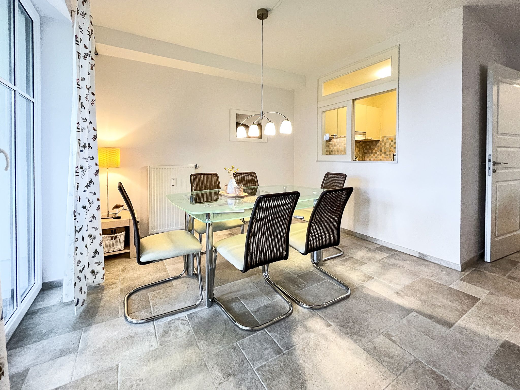 Das Duschbad dieser Ferienwohnung bietet angenehmen Duschkomfort. Außerdem verfügt diese Ferienwohnung über ein Gäste-WC. Ein durchgehender Fliesenboden befindet sich in allen Räumen. An den Fenstern sind Plissees und Vorhänge angebracht.