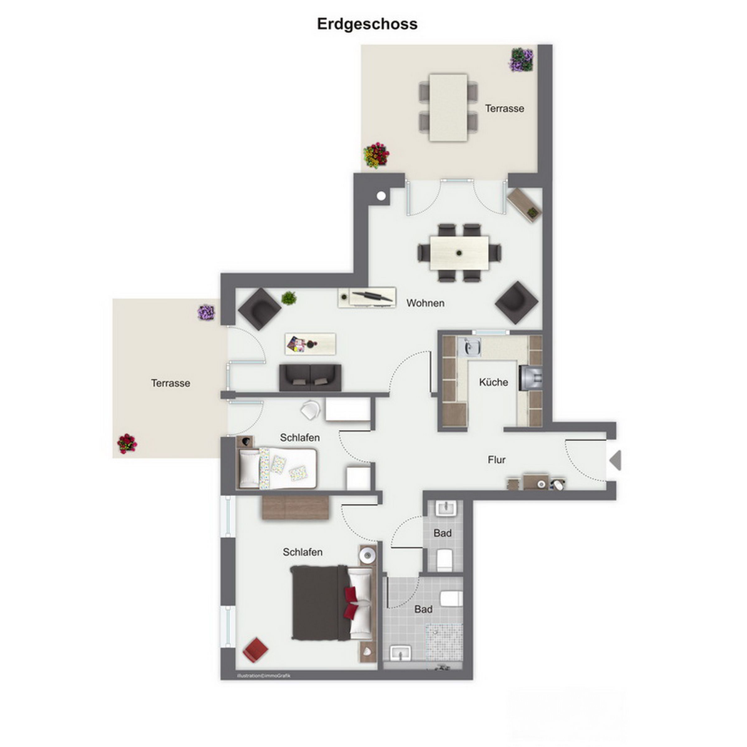 Zwei bequeme Schlafzimmer mit modernen Betten stehen dir zur Verfügung. Im ersten Schlafzimmer befinden sich ein großes Doppelbett (2 x 90 x 200 cm) sowie ein geräumiger Kleiderschrank für deine Garderobe. Im zweiten Schlafzimmer stehen dir ein Einzelbett (90 x 200 cm) und ein Kleiderschrank zur Verfügung. In beiden Schlafzimmern dienen Vorhänge als Verdunklung.