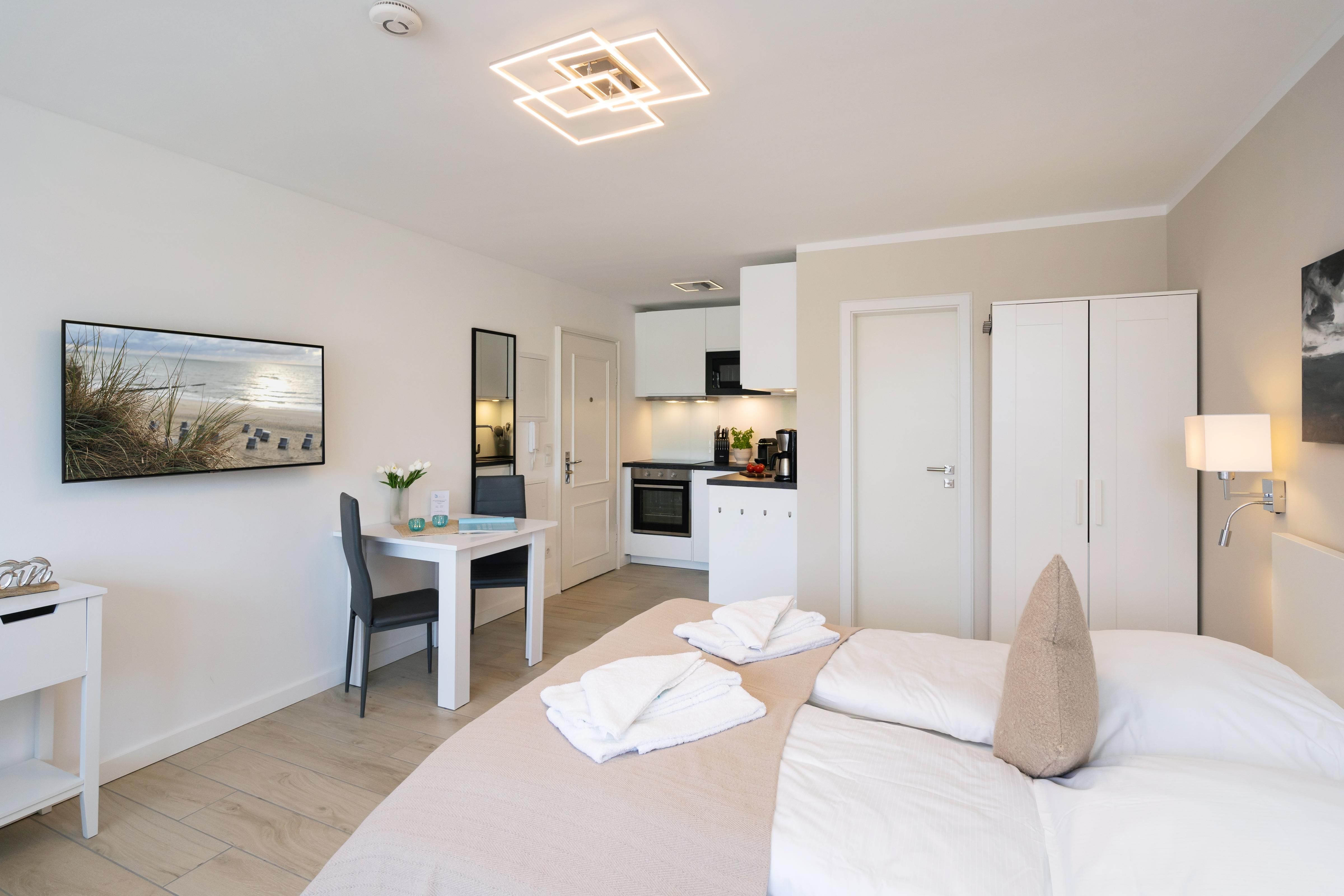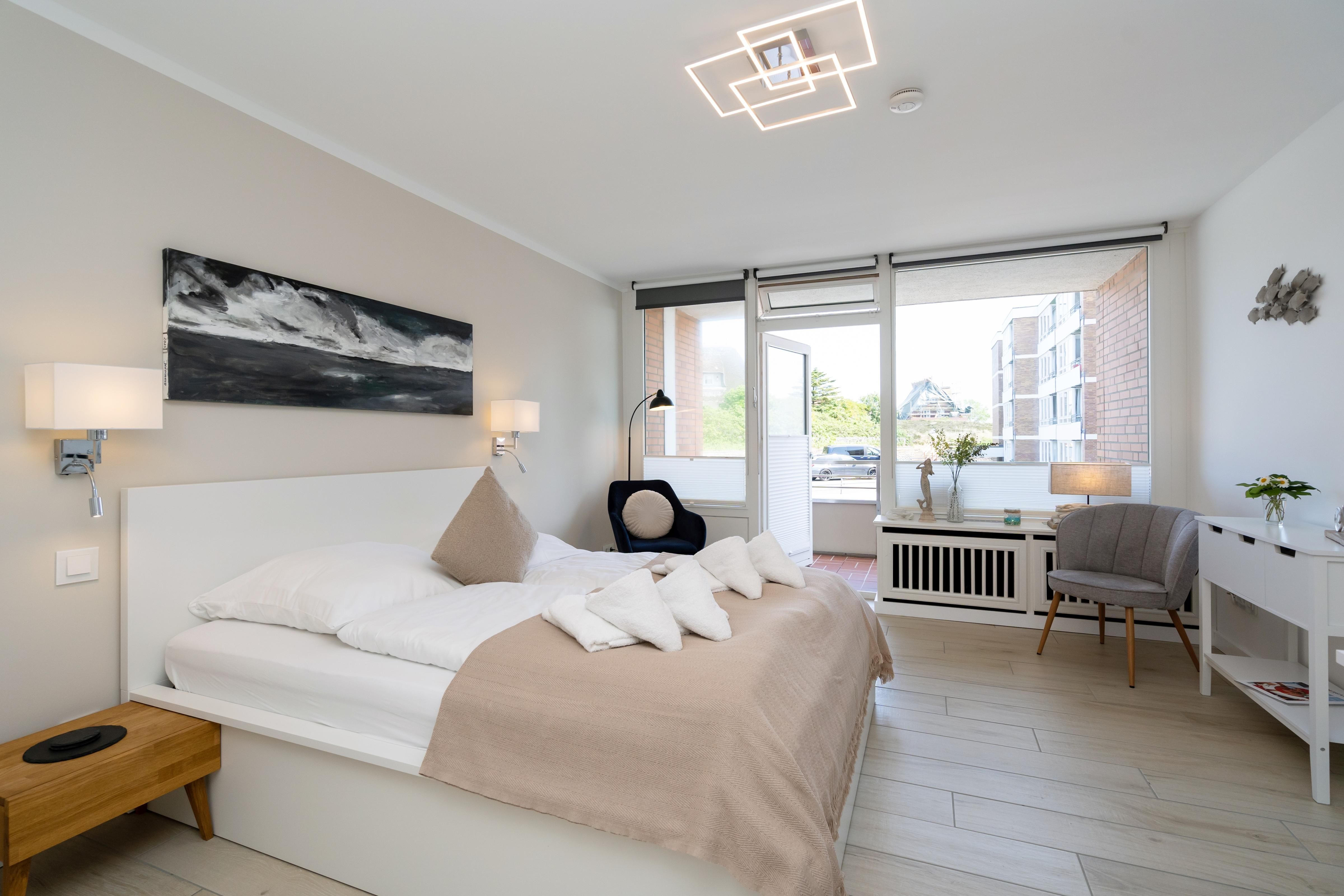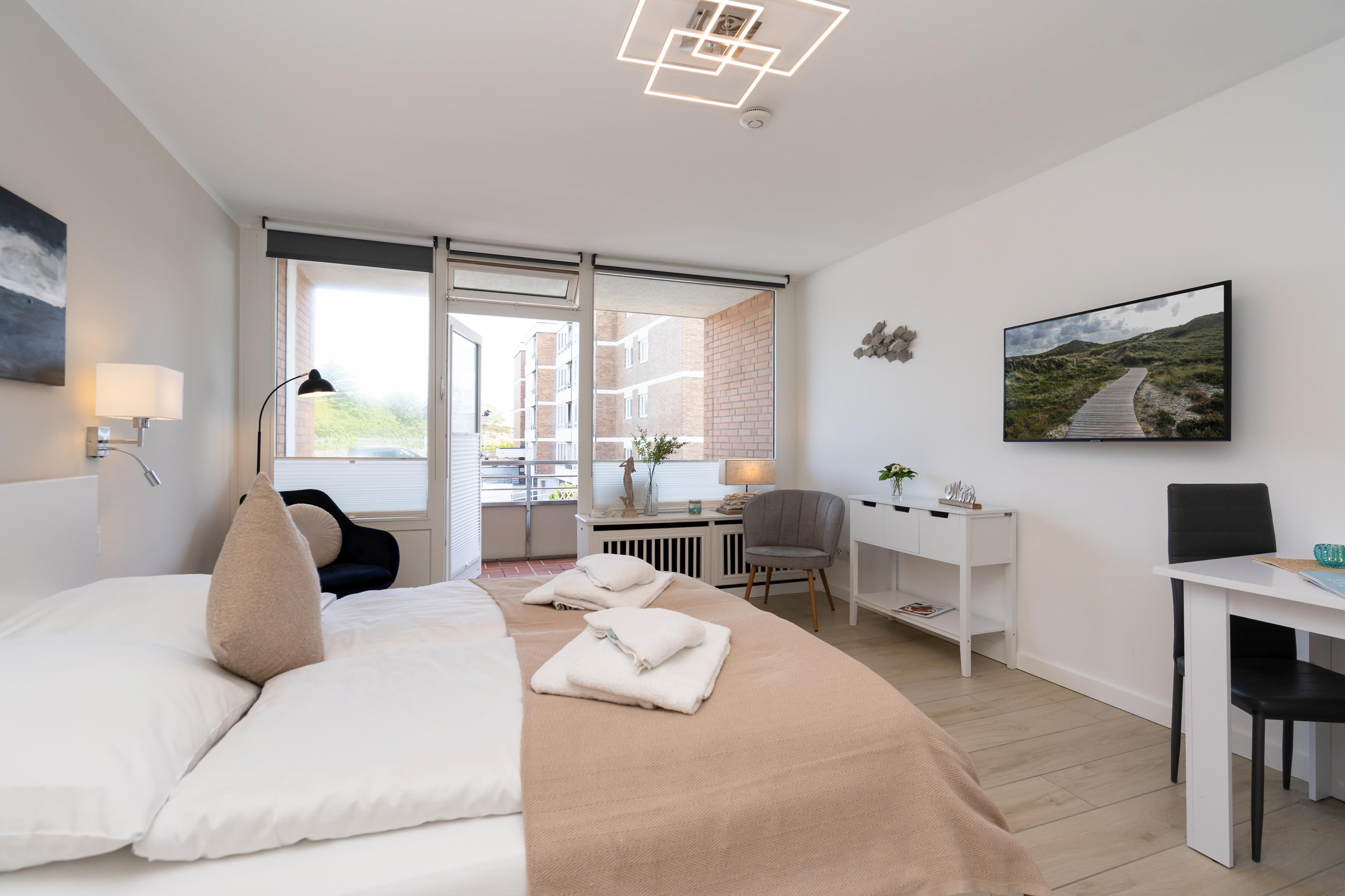 Das moderne 1-Zimmer App. "Strandwärts" für bis zu 2 Personen befindet sich im Hochparterre und zeichnet sich durch seine direkte Strandlage am Lister Watt aus. Der Wohn- und Schlafbereich inkl. Essecke bietet Ihnen eine Kombination aus hochwertiger Ausstattung und höchstem Komfort. Genießen Sie die Ruhe sowie den schönen Blick aufs Meer vom angrenzenden Balkon. Die Küchenzeile samt Geschirrspüler ist voll ausgestattet. Das Badezimmer verfügt über eine Dusche. Ein PKW-Stellplatz (maximale Fahrzeughöhe beträgt 190 cm) sowie WLAN stehen Ihnen kostenfrei zur Verfügung. Haustiere sind erlaubt. Der Fahrstuhl des Apartmenthauses ist über wenige Treppenstufen erreichbar.