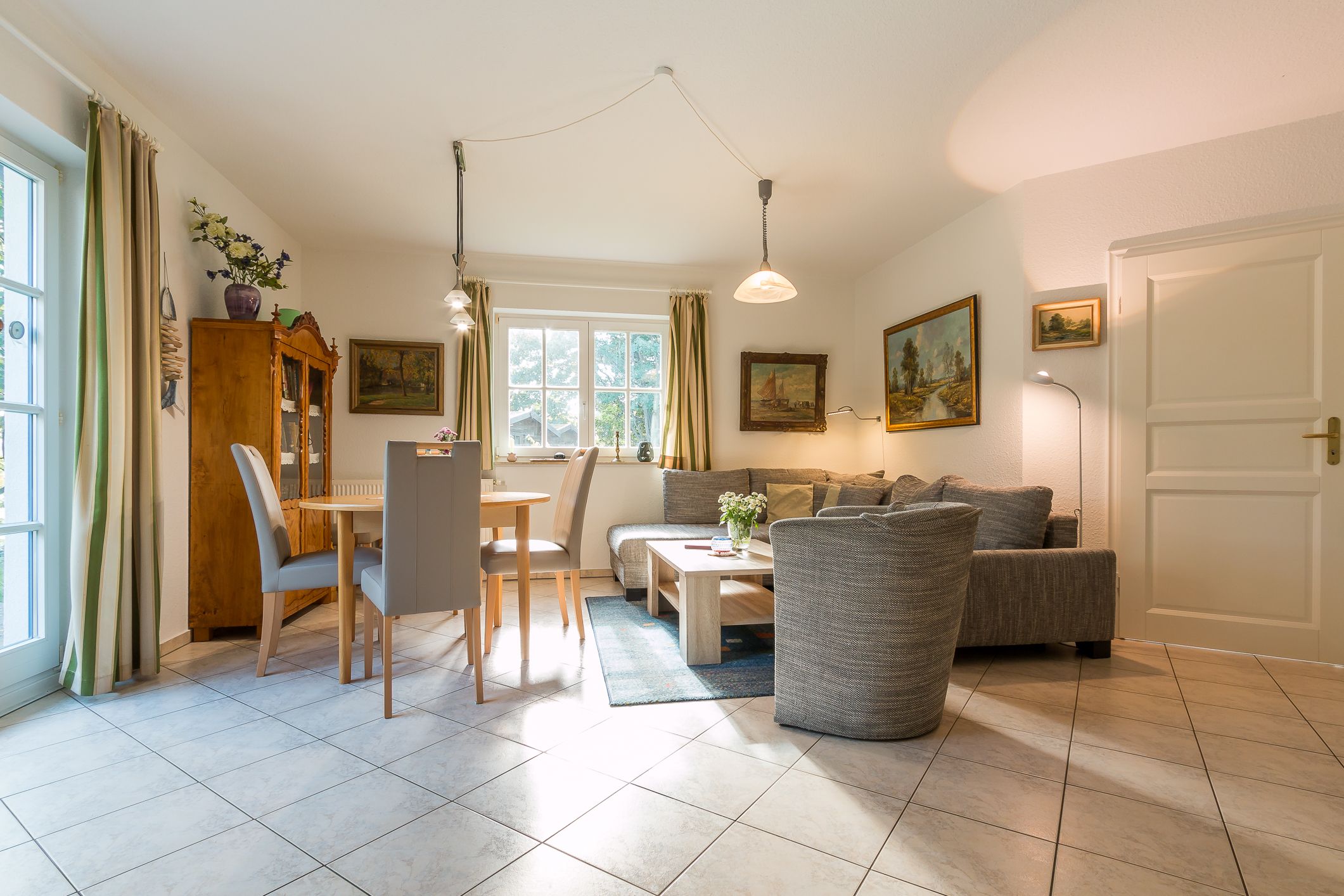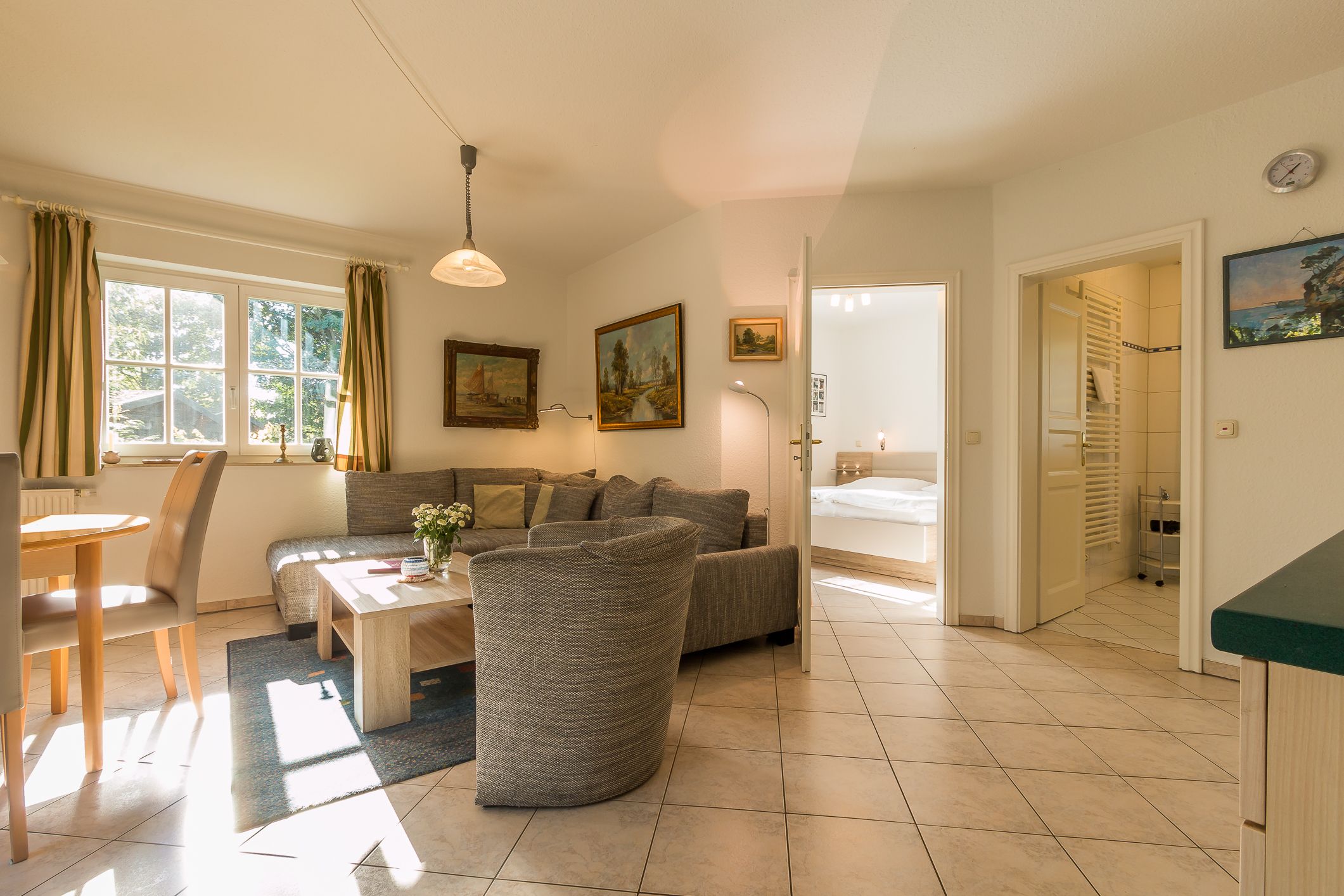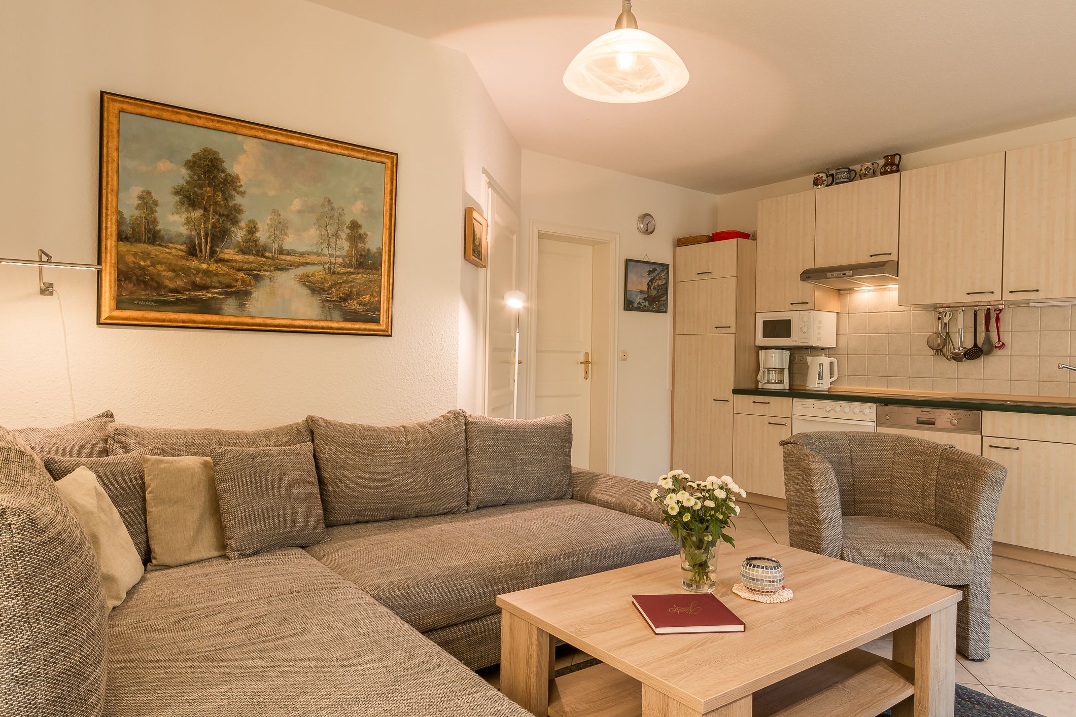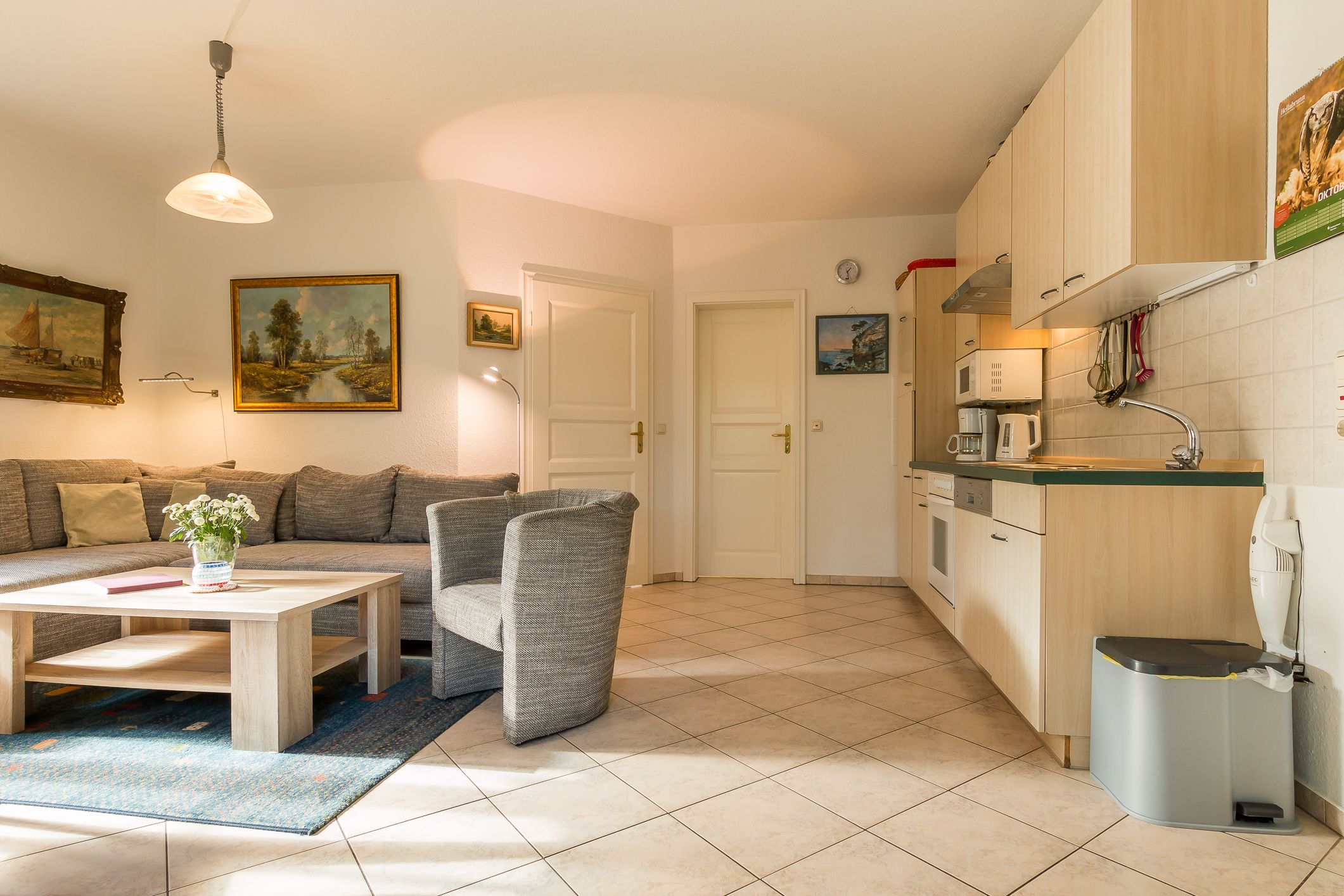 Die Wohnung befindet sich im Erdgeschoss. Über eine eigene, separate Diele gelangt man in den großen hellen Wohnraum mit einer gemütlichen Sitzecke, einem Essplatz und einer integrierten Küchenzeile. Das helle Bad verfügt über Dusche / WC. Das Schlafzimmer ist mit einem Doppelbett und einem zweiten TV ausgestattet. Die Couch im Wohnbereich ist ausziehbar und bietet eine zusätzliche Aufbettung für eine Person.