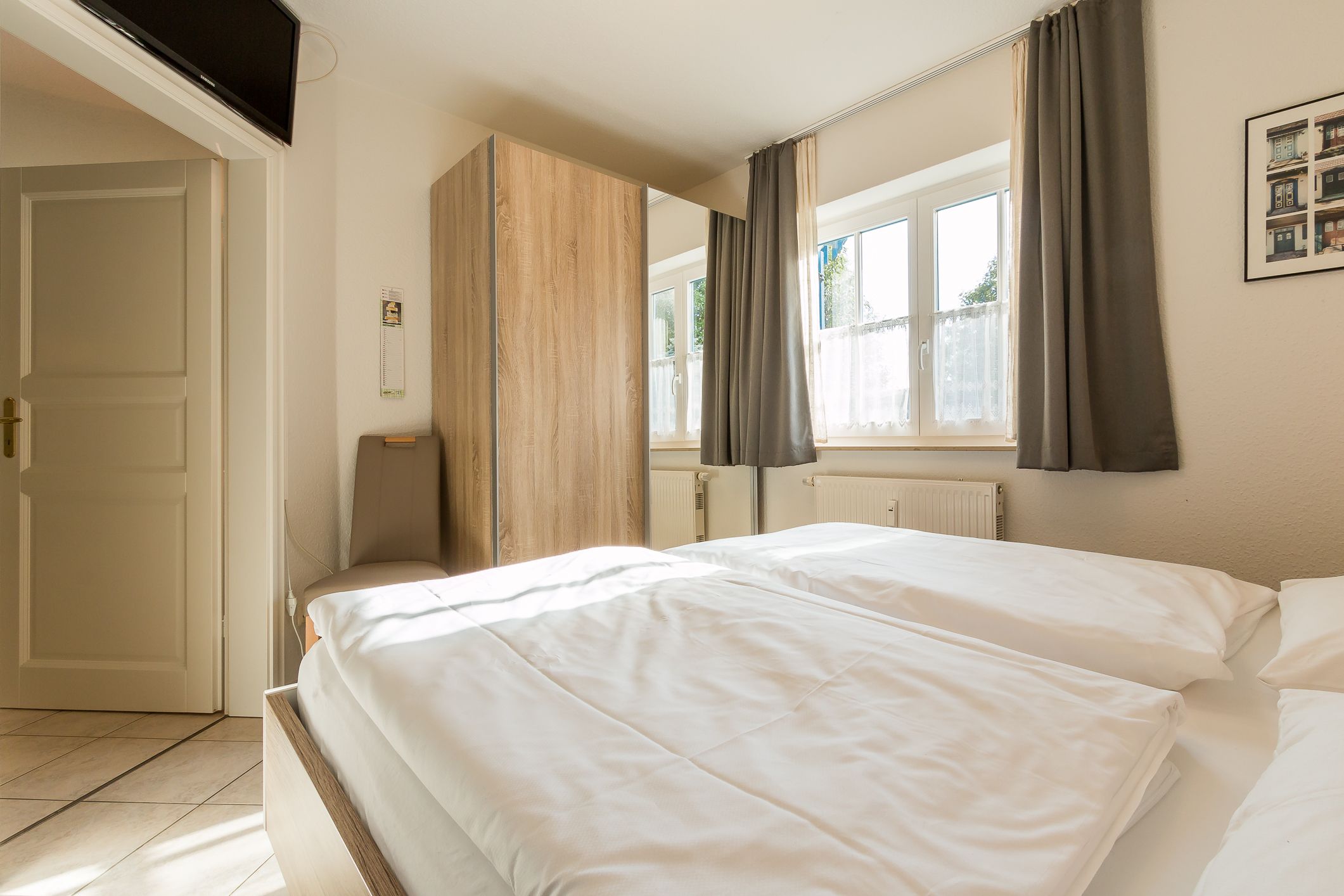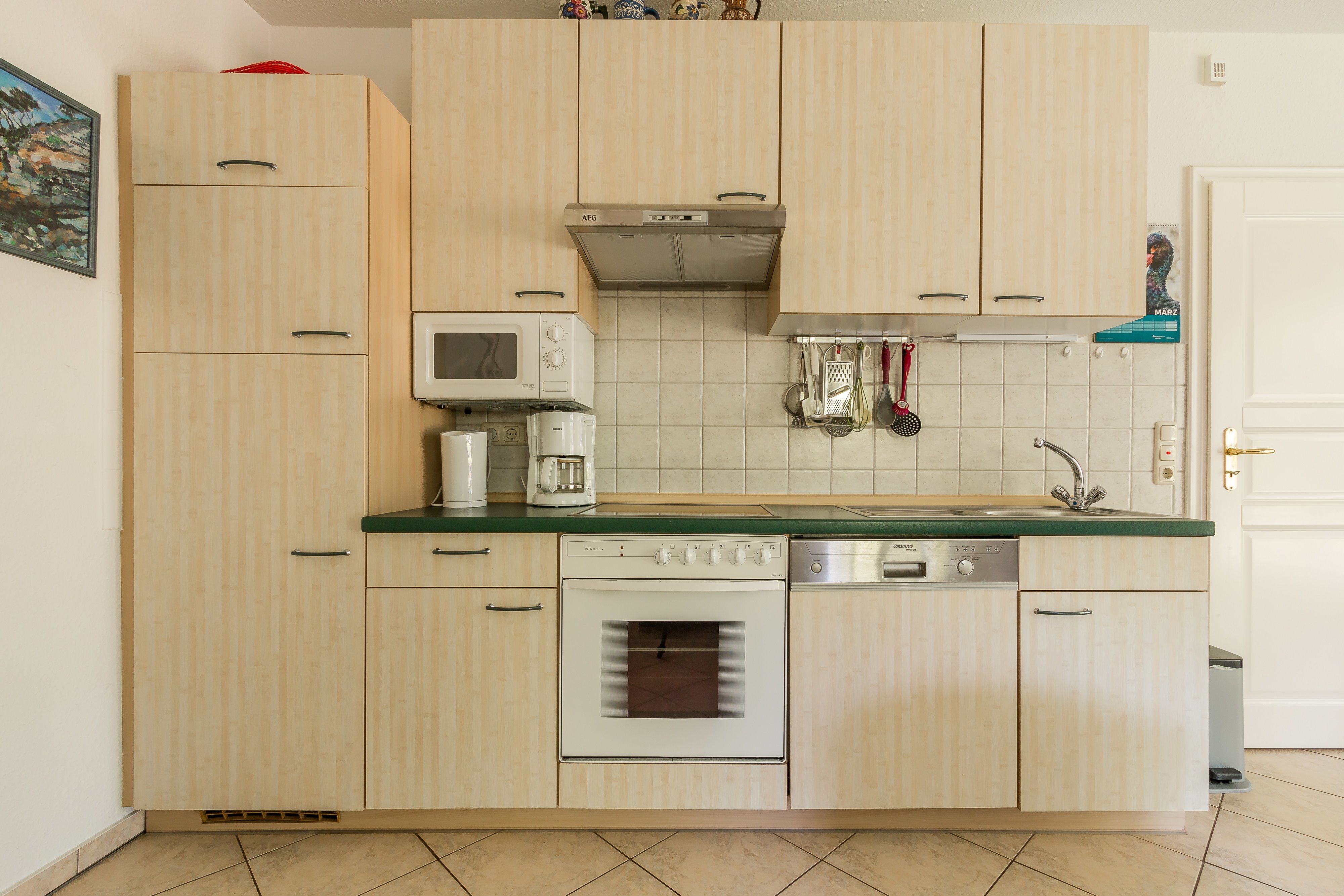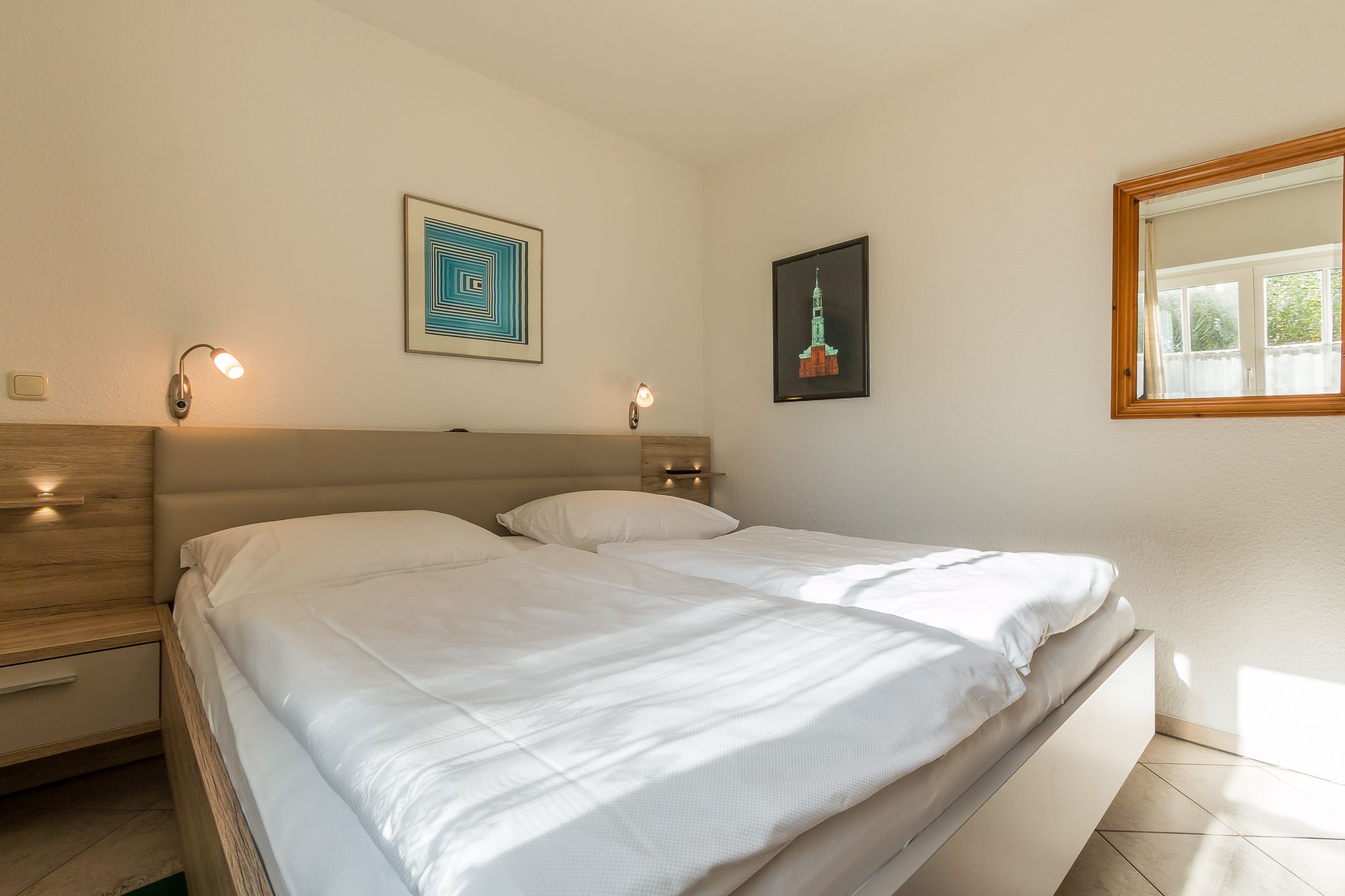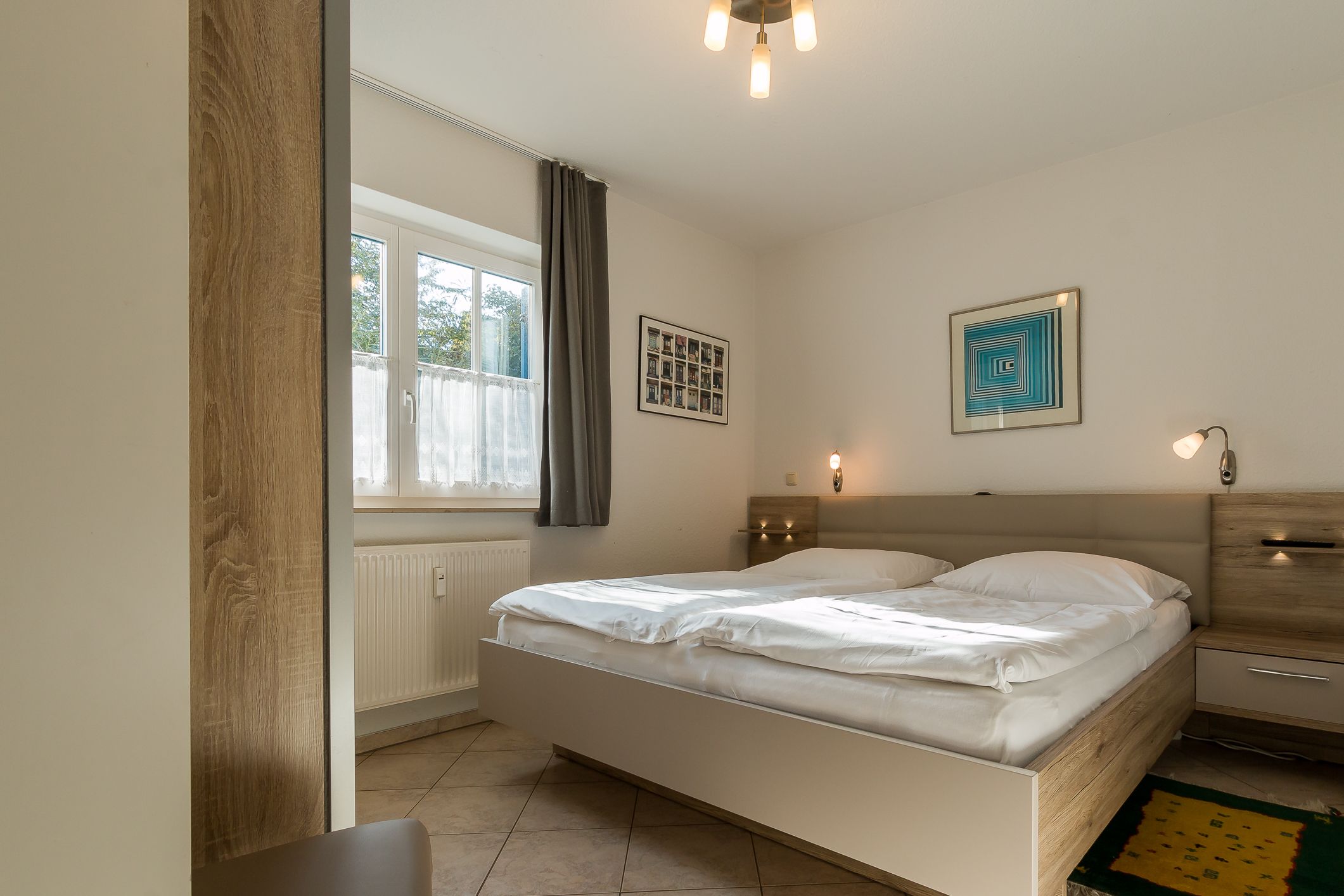 Die Wohnung befindet sich im Erdgeschoss. Über eine eigene, separate Diele gelangt man in den großen hellen Wohnraum mit einer gemütlichen Sitzecke, einem Essplatz und einer integrierten Küchenzeile. Das helle Bad verfügt über Dusche / WC. Das Schlafzimmer ist mit einem Doppelbett und einem zweiten TV ausgestattet. Die Couch im Wohnbereich ist ausziehbar und bietet eine zusätzliche Aufbettung für eine Person.
