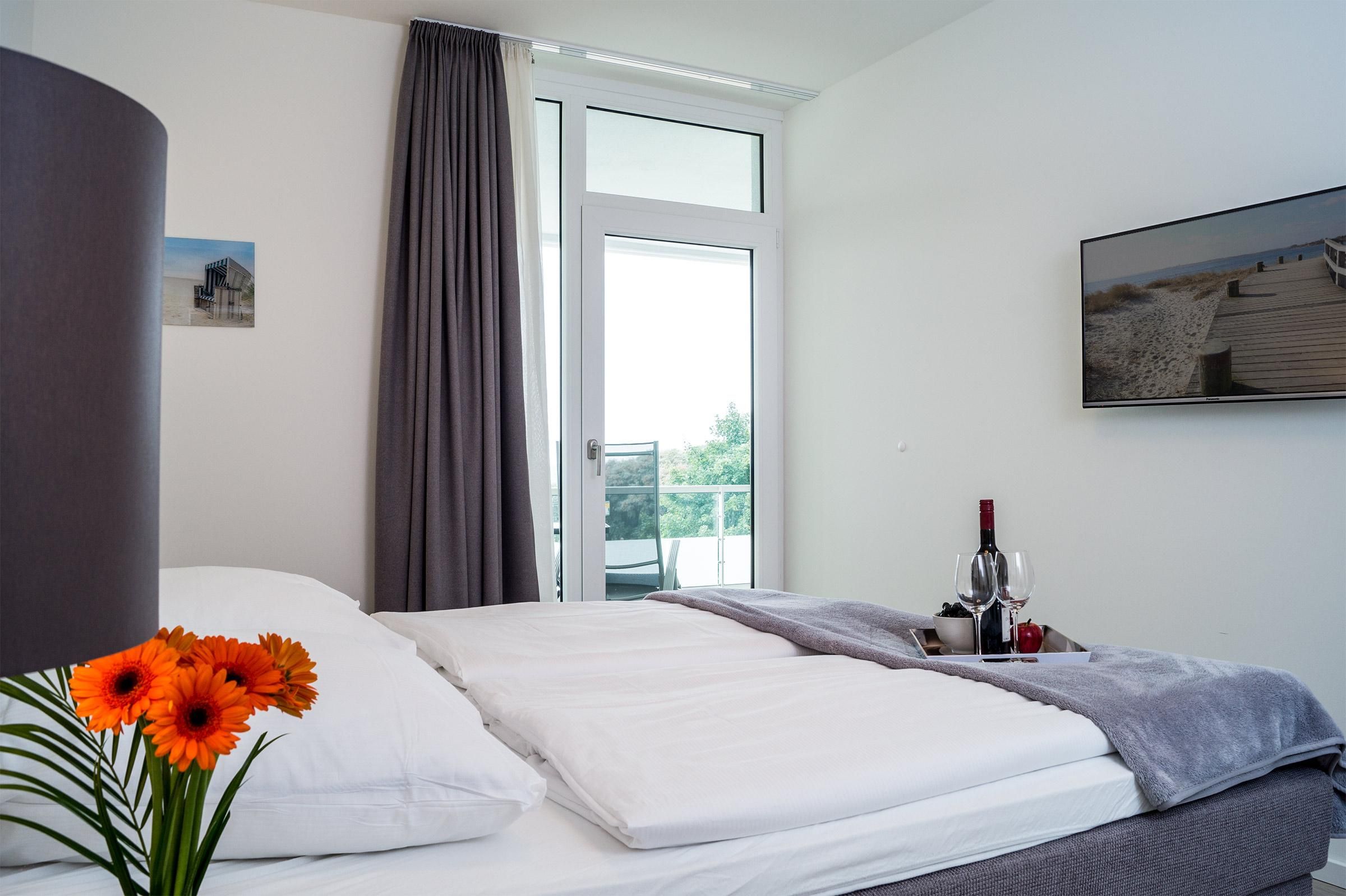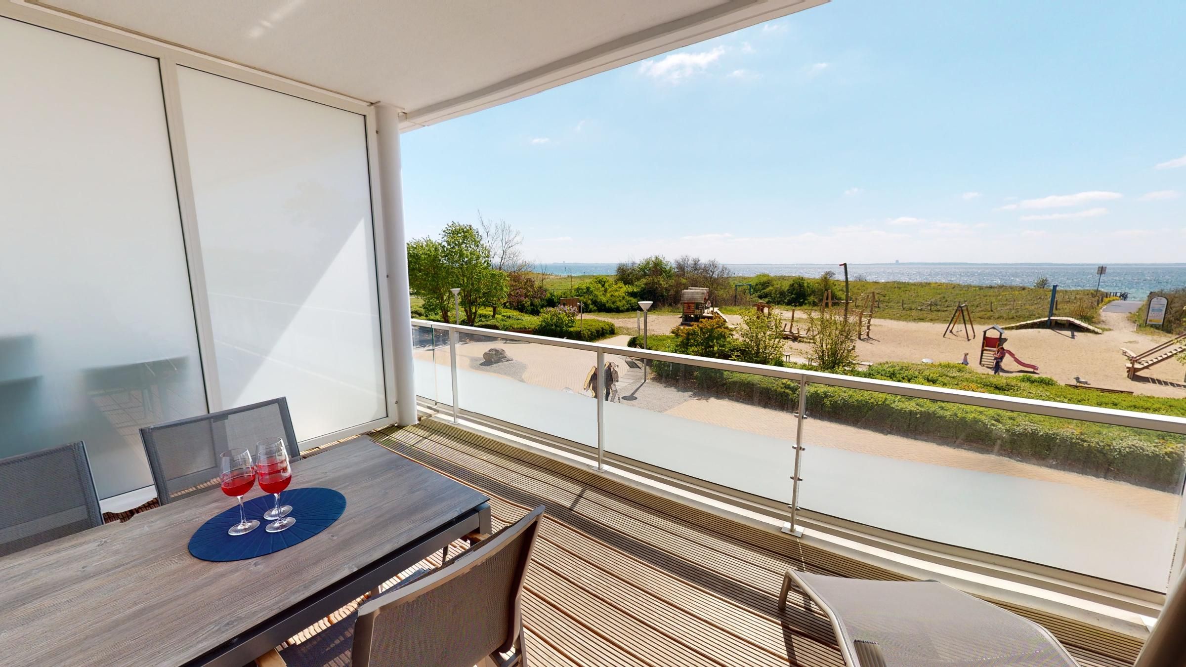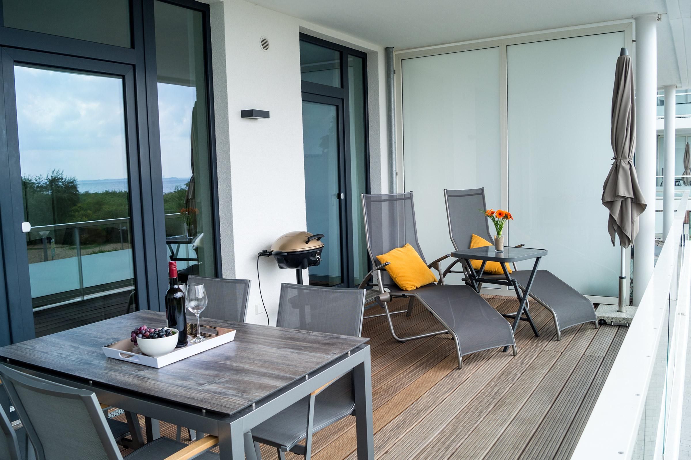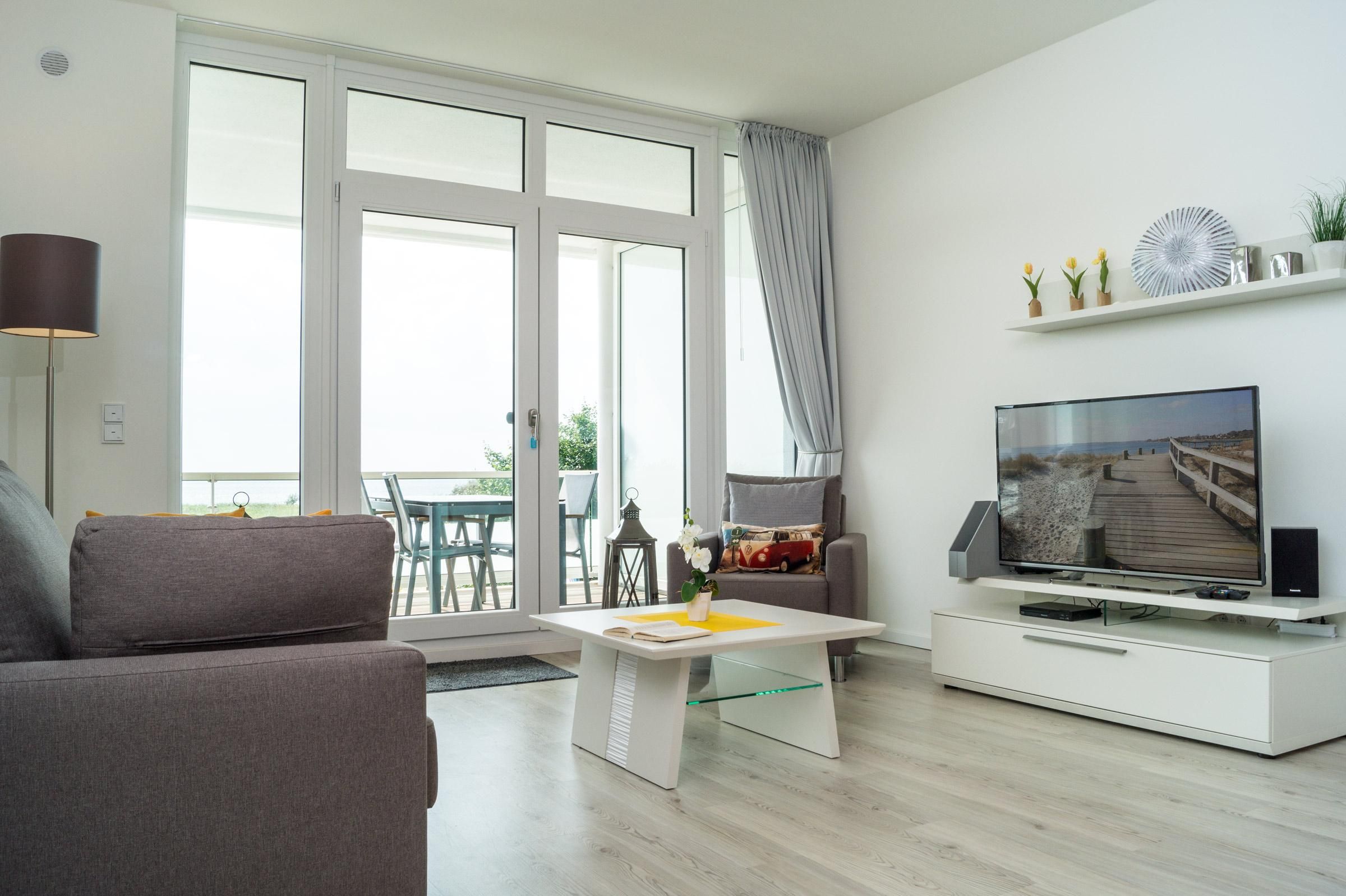 Der einladende Flur mit großem Spiegel und Garderobe führt Sie linkerhand in das schöne Badezimmer. Hier erwarten Sie eine Badewanne und eine Dusche, das Urlaubsgefühl stellt sich somit sofort ein! Zurück auf dem Flur führt Sie ihr Weg direkt in das Herzstück des Apartments, in den Wohnbereich. Eine offene Einbauküche, ein einladender Essbereich sowie eine gemütliche Sofaecke laden zum Verweilen ein! Genießen Sie den Blick aus dem Fenster, denn die Ostsee lacht Ihnen entgegen! Das Sofa bietet eine Schlaffunktion für zwei Personen. Über das Wohnzimmer gelangen Sie in den letzten Raum des Apartments, das Schlafzimmer. Hier stehen ein komfortables Boxspring-Doppelbett, ein geräumiger Kleiderschrank und ein Flachbildfernseher für Sie bereit. Auf den schönen Balkon gelangen Sie sowohl über das Wohnzimmer, als auch über das Schlafzimmer. Zur Ausstattung gehören zwei Sonnenliegen sowie ein Balkontisch mit vier Stühlen. Der einmalige Meerblick wird Sie begeistern!