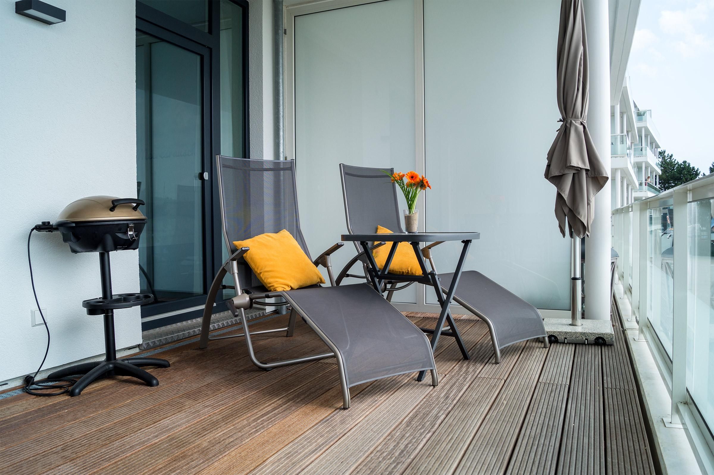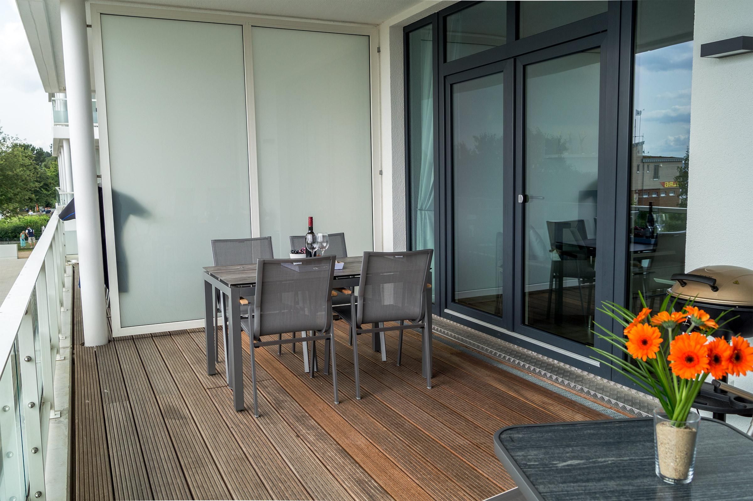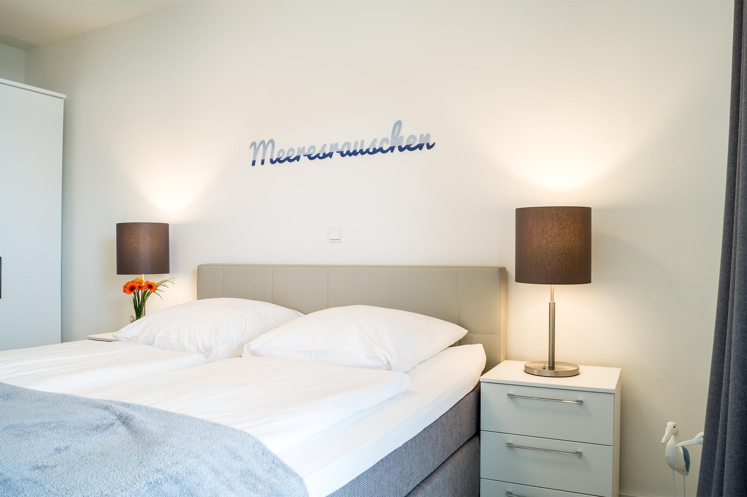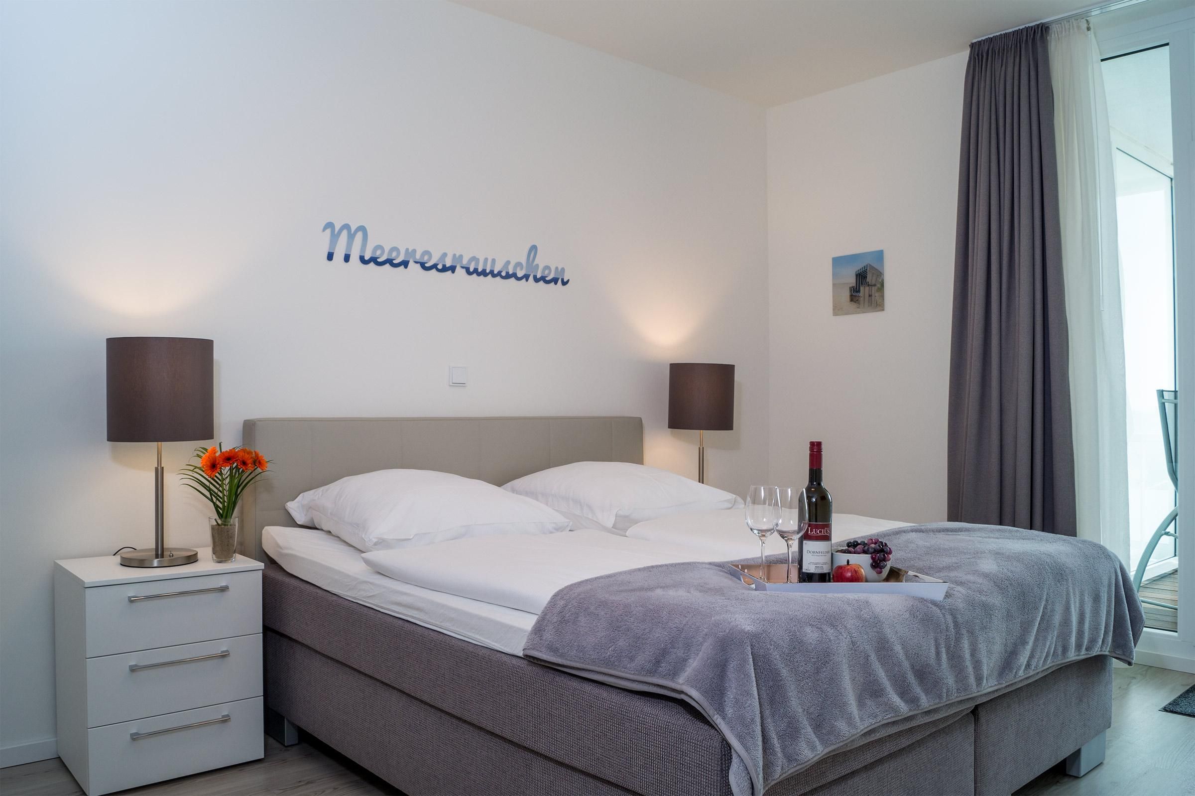 Der einladende Flur mit großem Spiegel und Garderobe führt Sie linkerhand in das schöne Badezimmer. Hier erwarten Sie eine Badewanne und eine Dusche, das Urlaubsgefühl stellt sich somit sofort ein! Zurück auf dem Flur führt Sie ihr Weg direkt in das Herzstück des Apartments, in den Wohnbereich. Eine offene Einbauküche, ein einladender Essbereich sowie eine gemütliche Sofaecke laden zum Verweilen ein! Genießen Sie den Blick aus dem Fenster, denn die Ostsee lacht Ihnen entgegen! Das Sofa bietet eine Schlaffunktion für zwei Personen. Über das Wohnzimmer gelangen Sie in den letzten Raum des Apartments, das Schlafzimmer. Hier stehen ein komfortables Boxspring-Doppelbett, ein geräumiger Kleiderschrank und ein Flachbildfernseher für Sie bereit. Auf den schönen Balkon gelangen Sie sowohl über das Wohnzimmer, als auch über das Schlafzimmer. Zur Ausstattung gehören zwei Sonnenliegen sowie ein Balkontisch mit vier Stühlen. Der einmalige Meerblick wird Sie begeistern!
