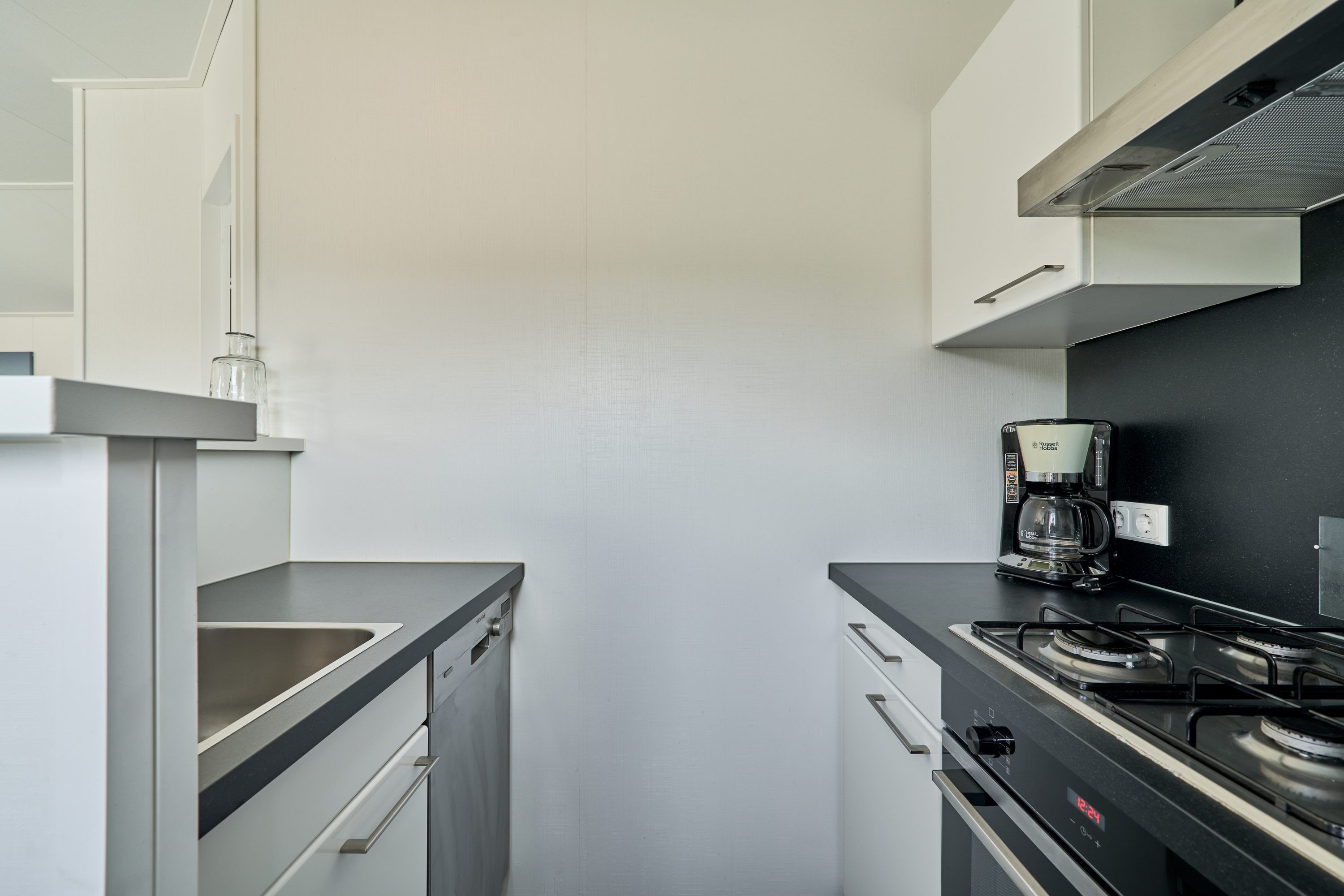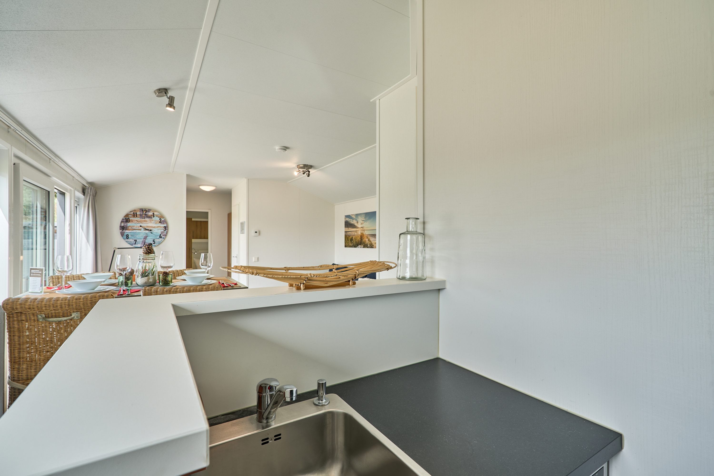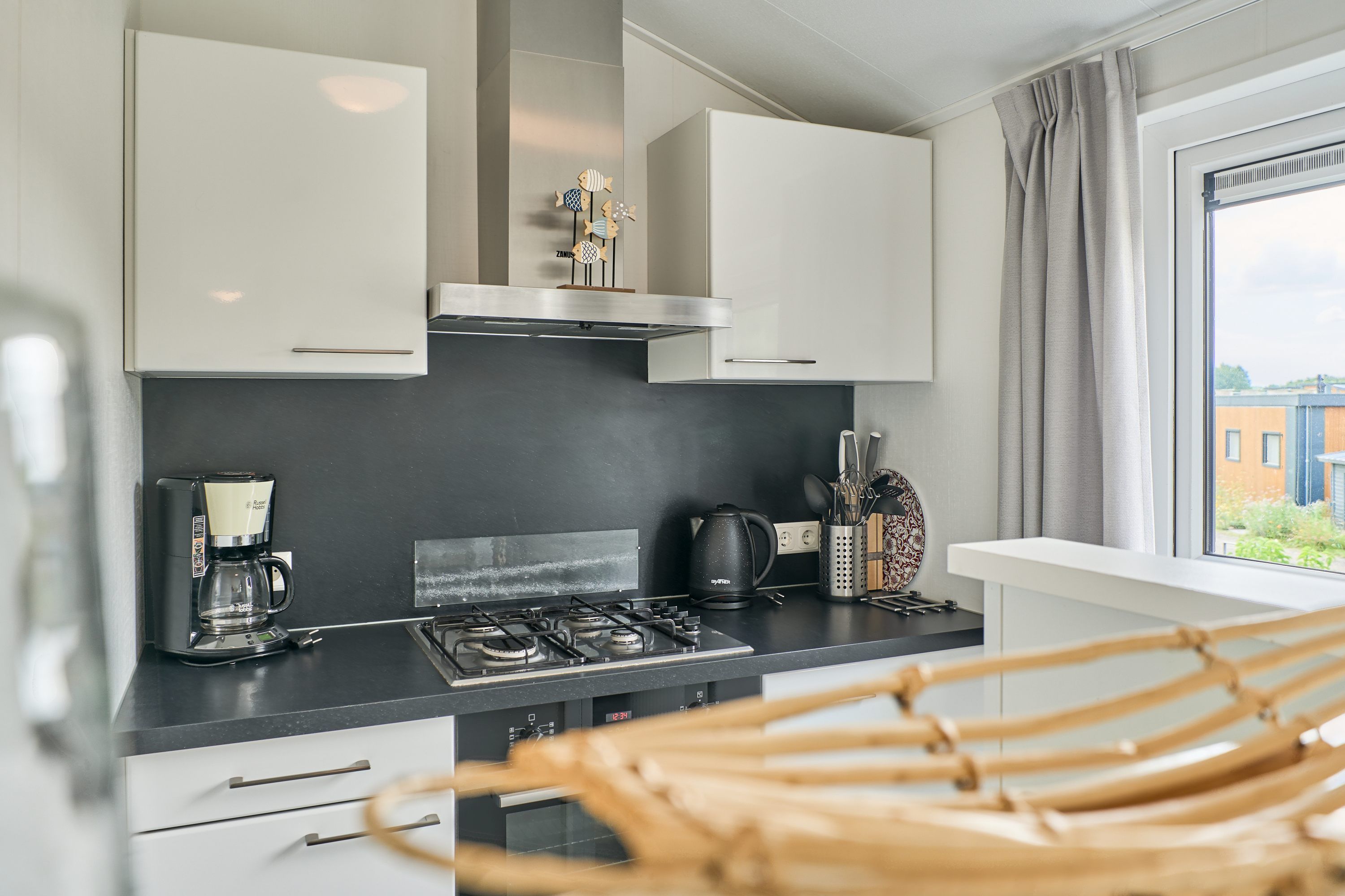 Das Haus bietet Platz für bis zu vier Personen und verfügt über zwei separate Schlafzimmer. Die offene Küche ist mit modernen Geräten und sämtlichen Küchenutensilien ausgestattet und grenzt direkt an den Wohnbereich mit gemütlichem Sofa und Esstisch. Für Ihren Komfort finden Sie einen Herd, Backofen, Kühlschrank mit Gefrierfach, eine Spülmaschine, Kaffeemaschine, Wasserkocher, Toaster und ausreichend Geschirr sowie Besteck vor. Staubsauger und Abfalleimer gehören ebenfalls zur Ausstattung, sodass Sie auch während des Aufenthalts auf keine Annehmlichkeit verzichten müssen.