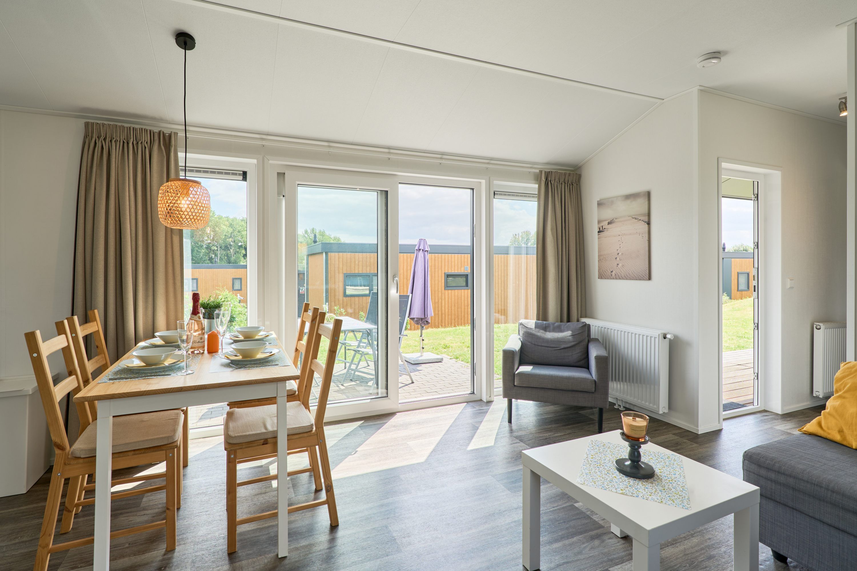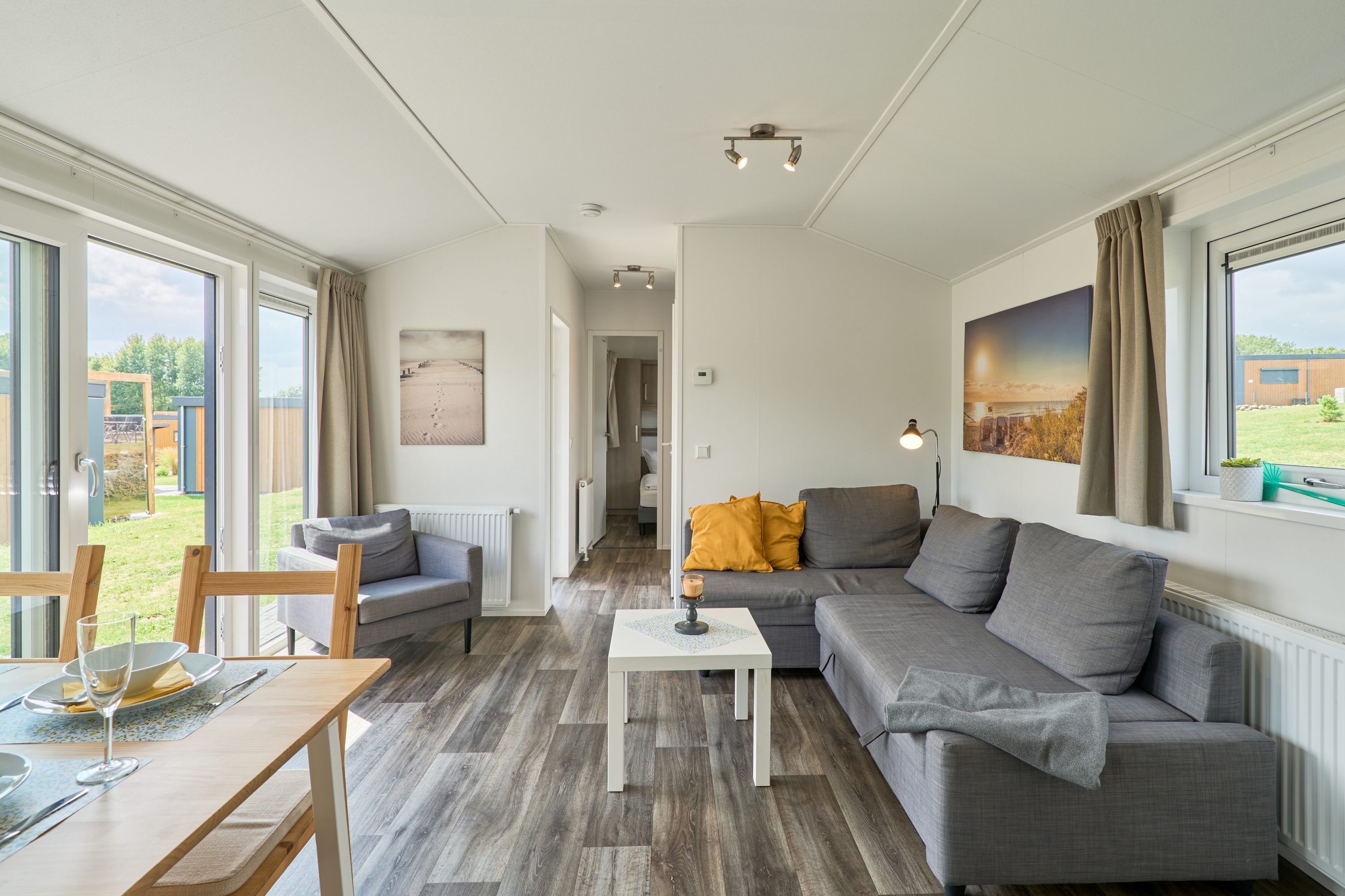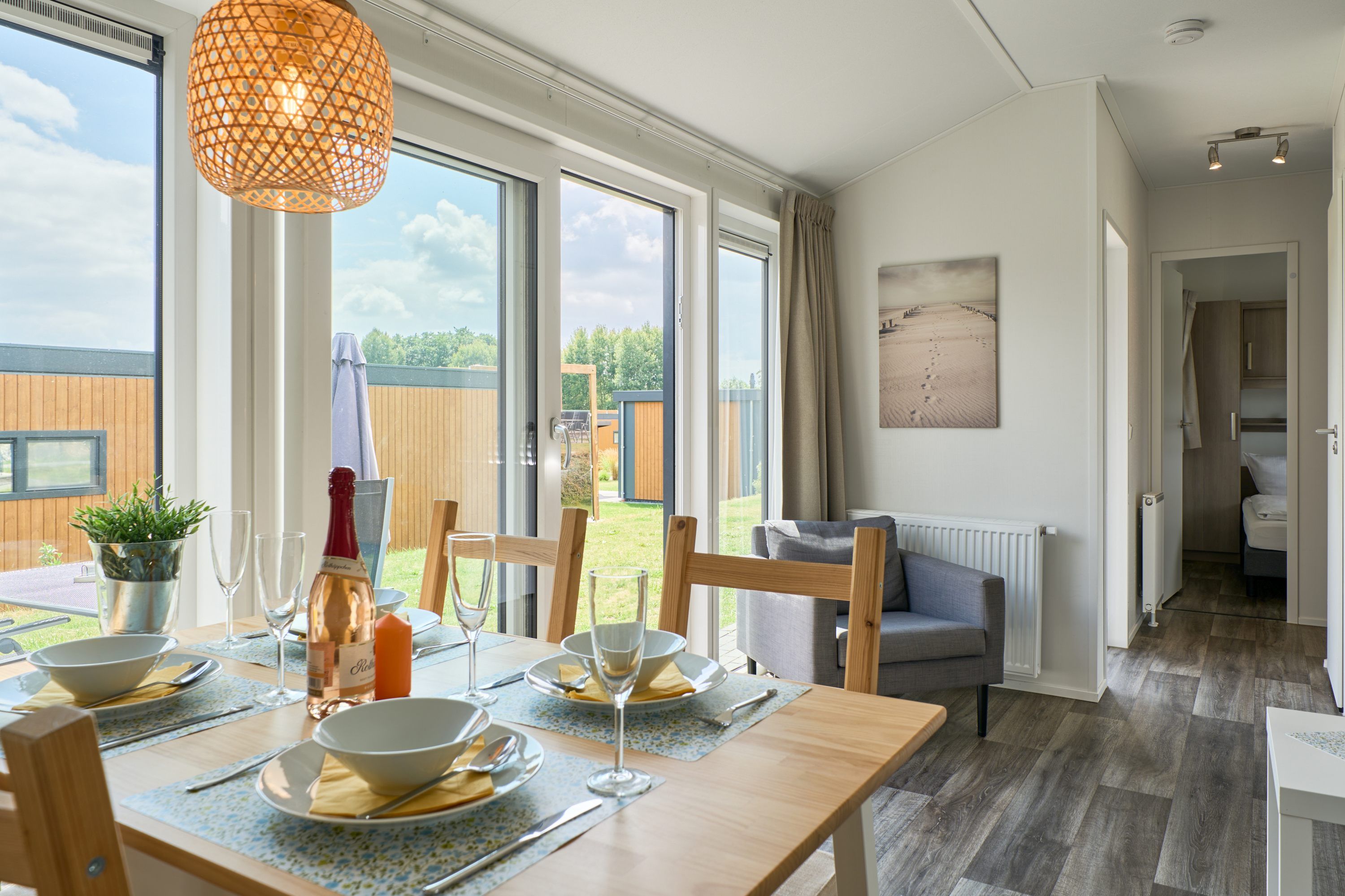 Die Umgebung ist von einer guten Landschaftsaussicht geprägt und eignet sich hervorragend für Erholungsuchende und Naturliebhaber. Ein Sandstrand ist etwa 7 Kilometer entfernt, Restaurants sind bereits nach rund 500 Metern erreichbar, und Einkaufsmöglichkeiten finden Sie in einer Entfernung von etwa 4 Kilometern. Für den morgendlichen Genuss bietet die Anlage zudem einen Brötchenservice.