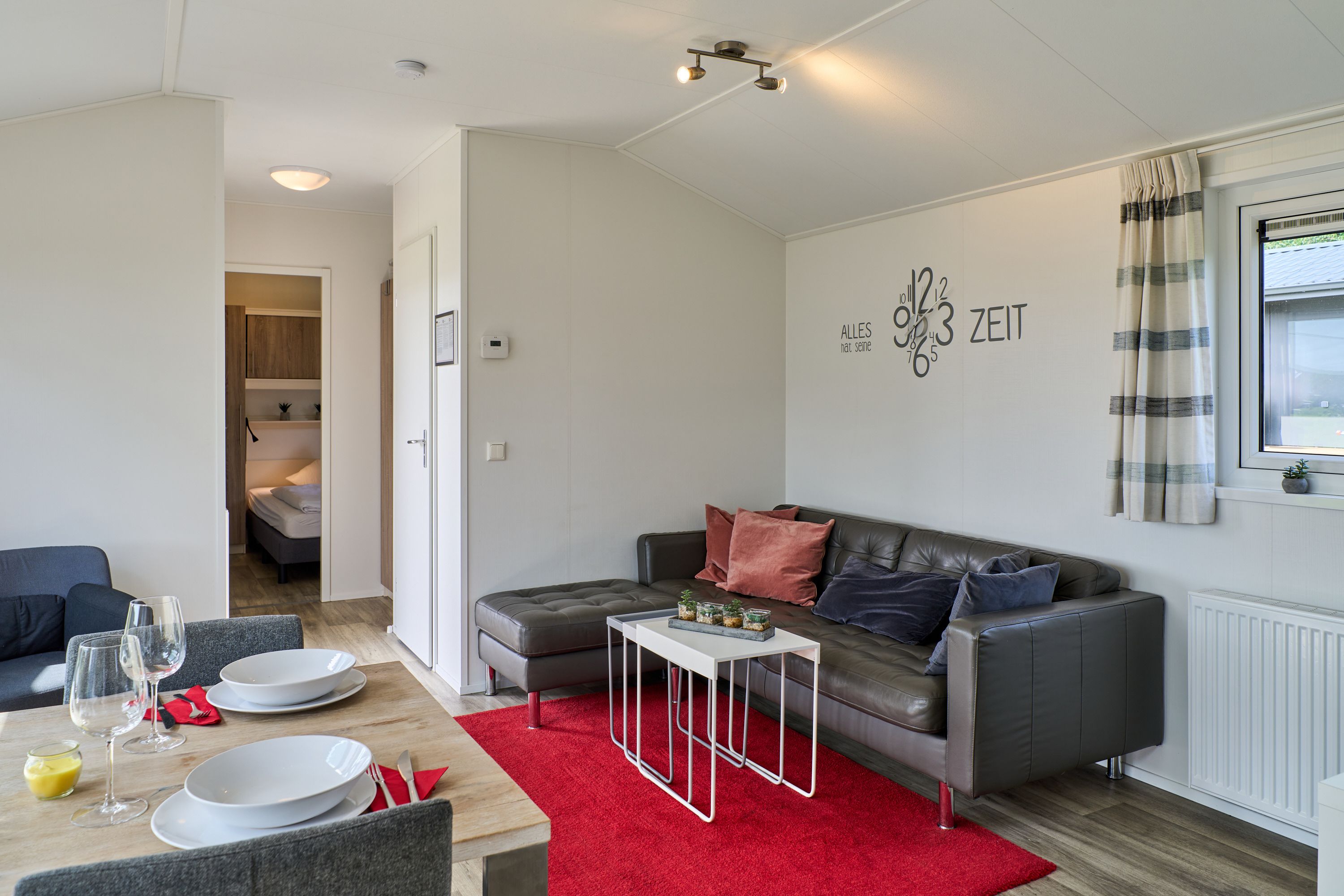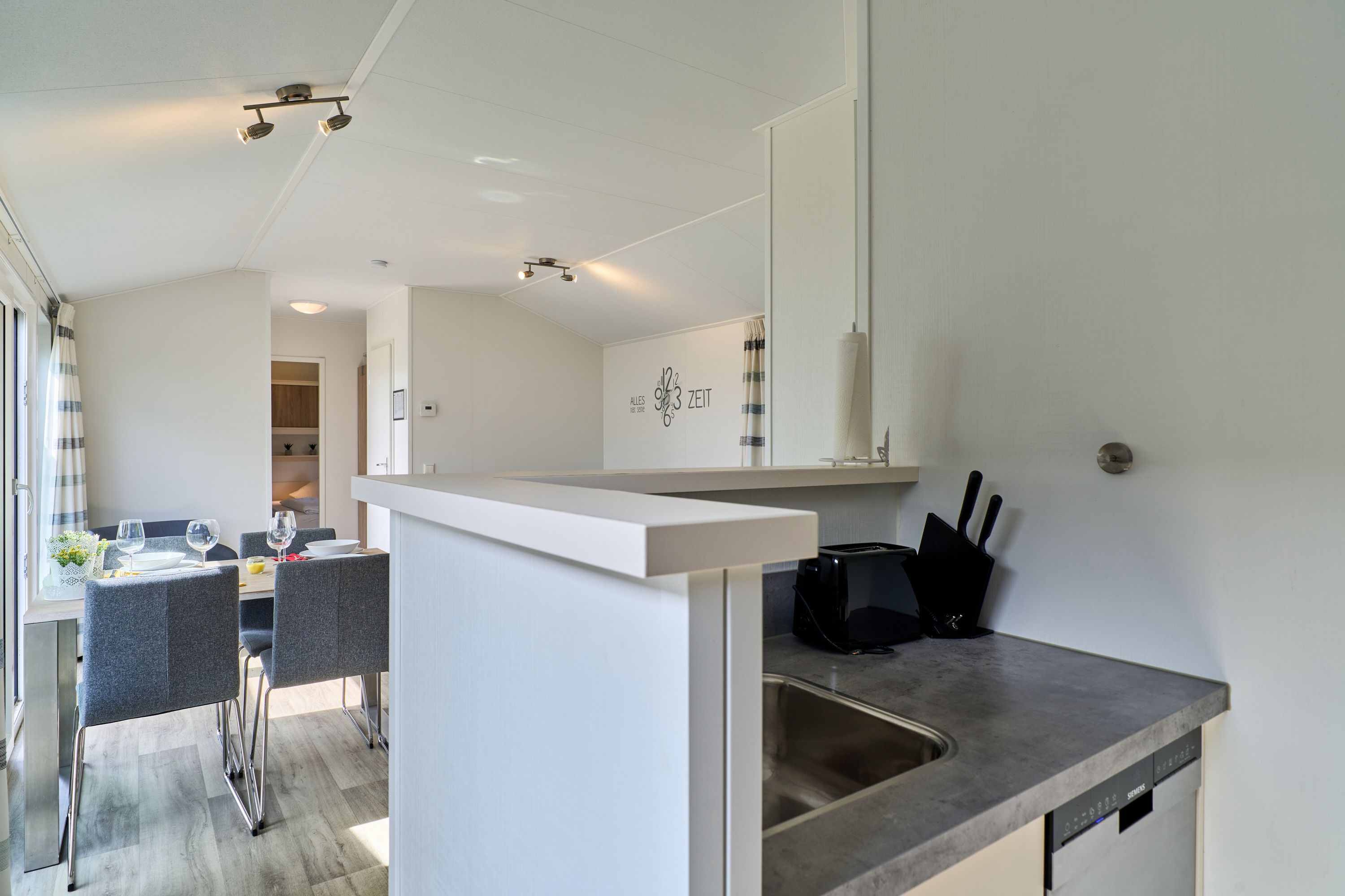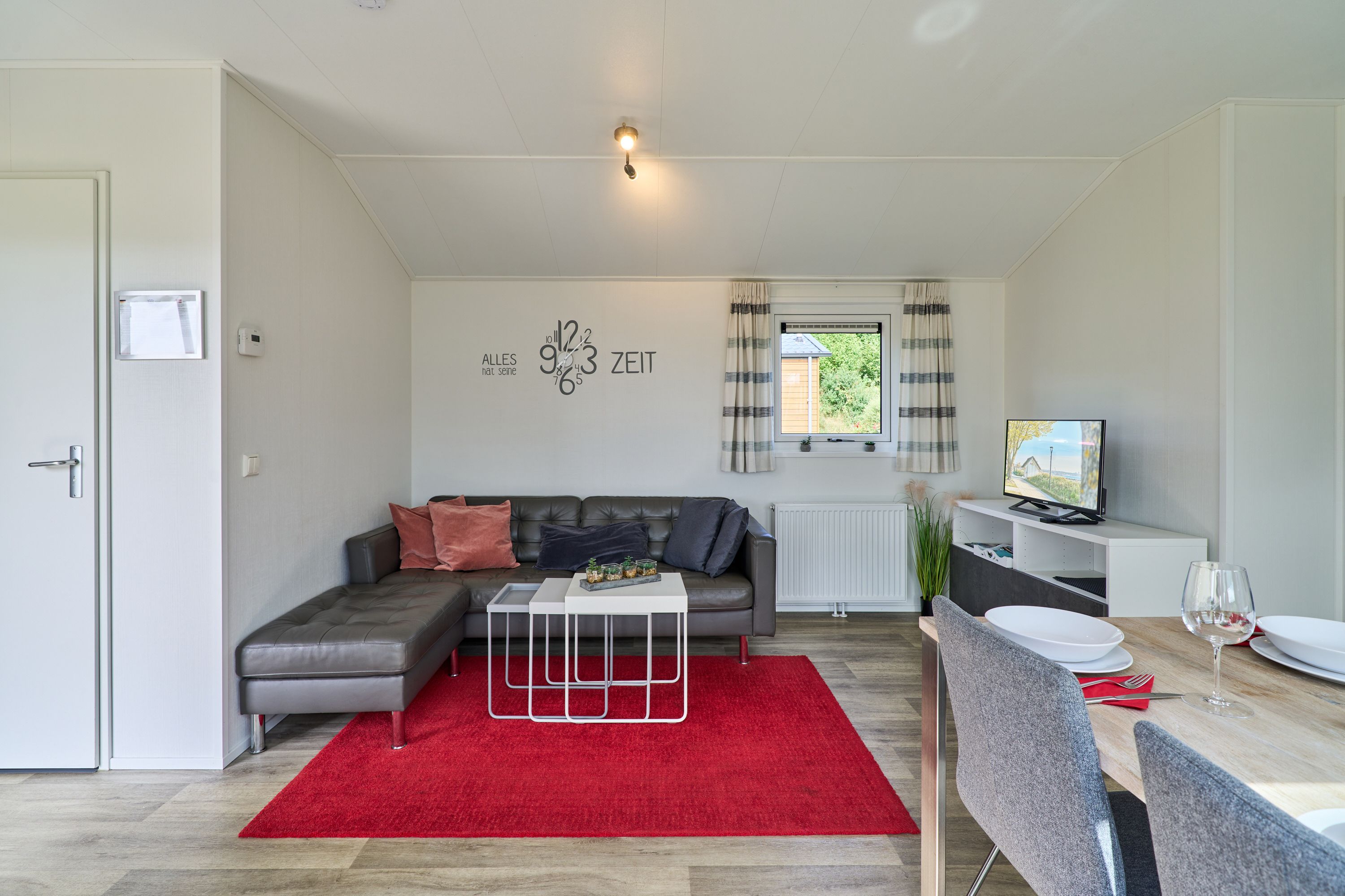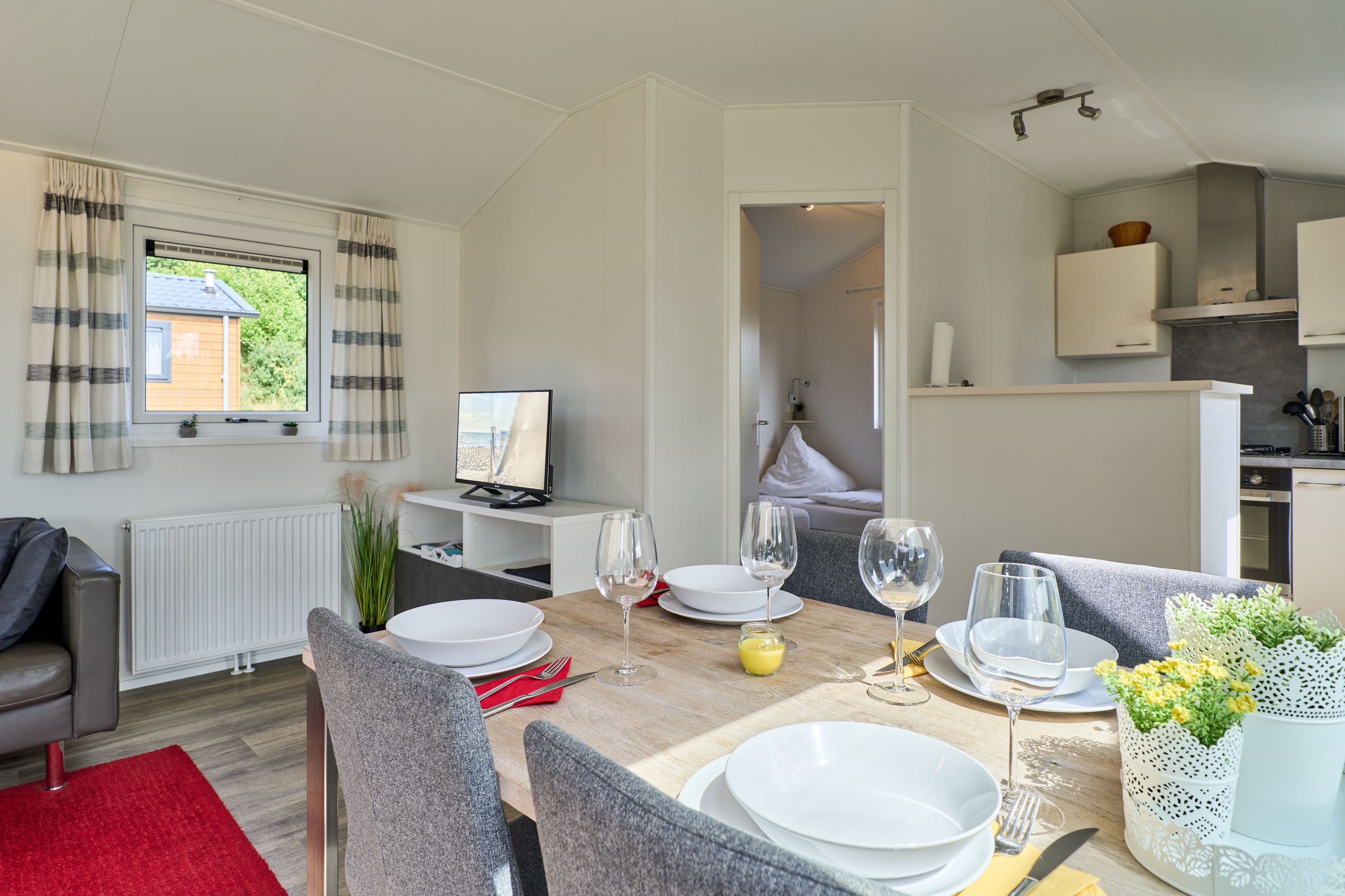 Im Inneren finden Sie eine modern gestaltete, offene Küche, die direkt in den Wohnbereich übergeht. Ausgestattet mit einem Herd, Backofen, Kühlschrank, Gefrierfach, Geschirrspüler, Kaffeemaschine, Wasserkocher, Toaster und vollständigen Küchenutensilien sowie Geschirr und Besteck, bietet die Küche beste Voraussetzungen für gemeinsame Kochabende. Am Esstisch können Sie in geselliger Runde Ihre Mahlzeiten genießen; anschließend lädt das wohnliche Sofa zum Entspannen ein. Für Unterhaltung stehen Ihnen ein TV und ein Radio zur Verfügung.