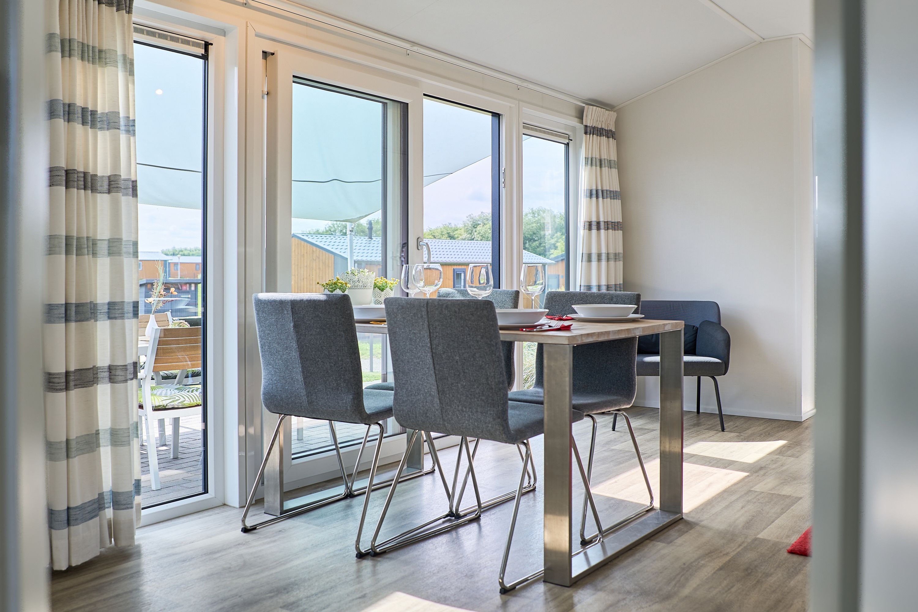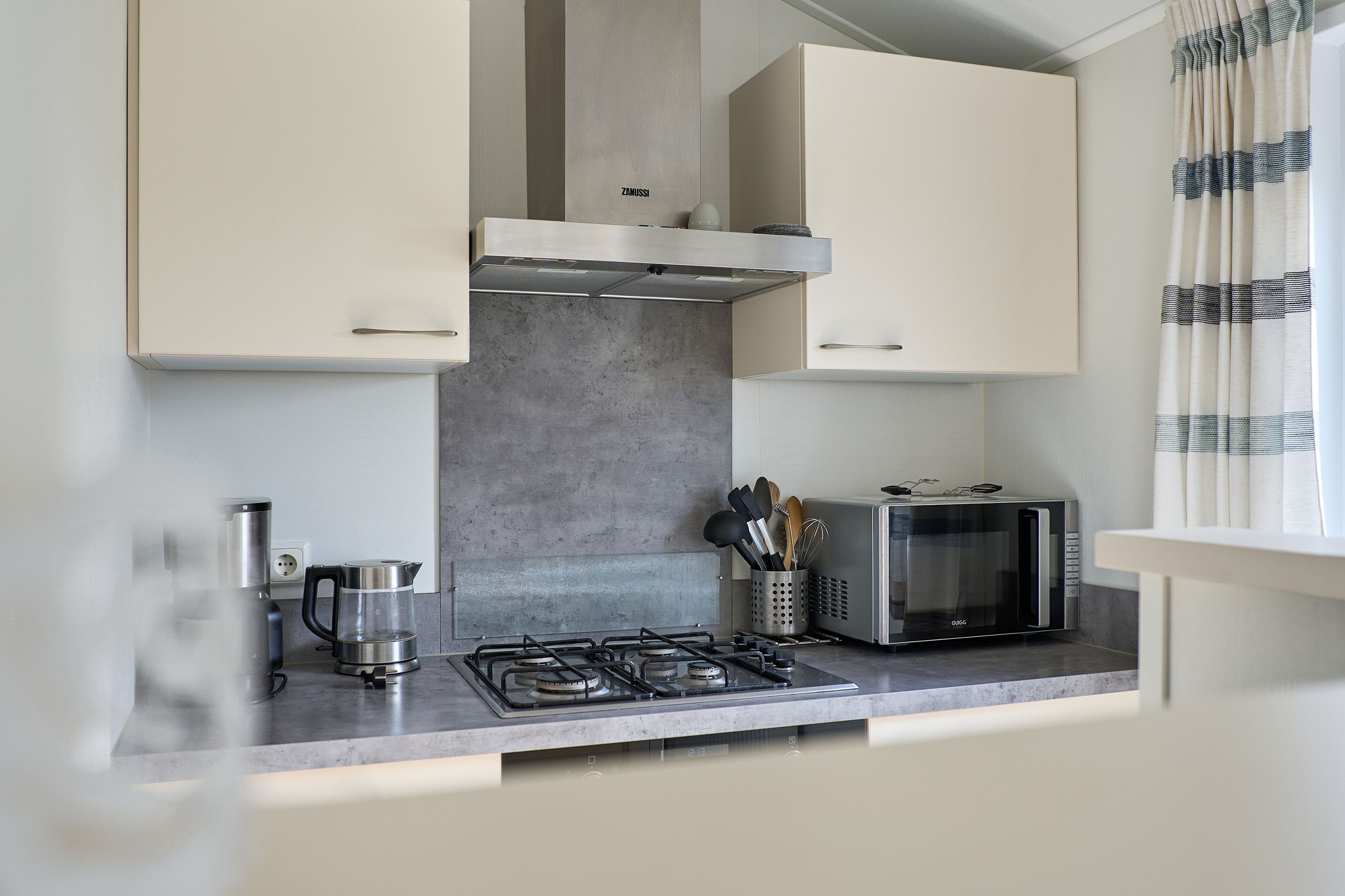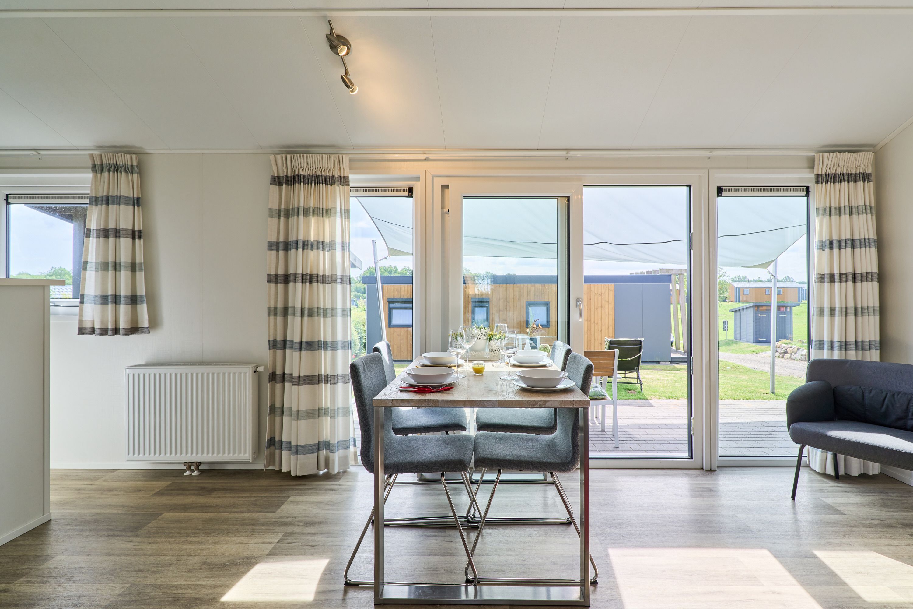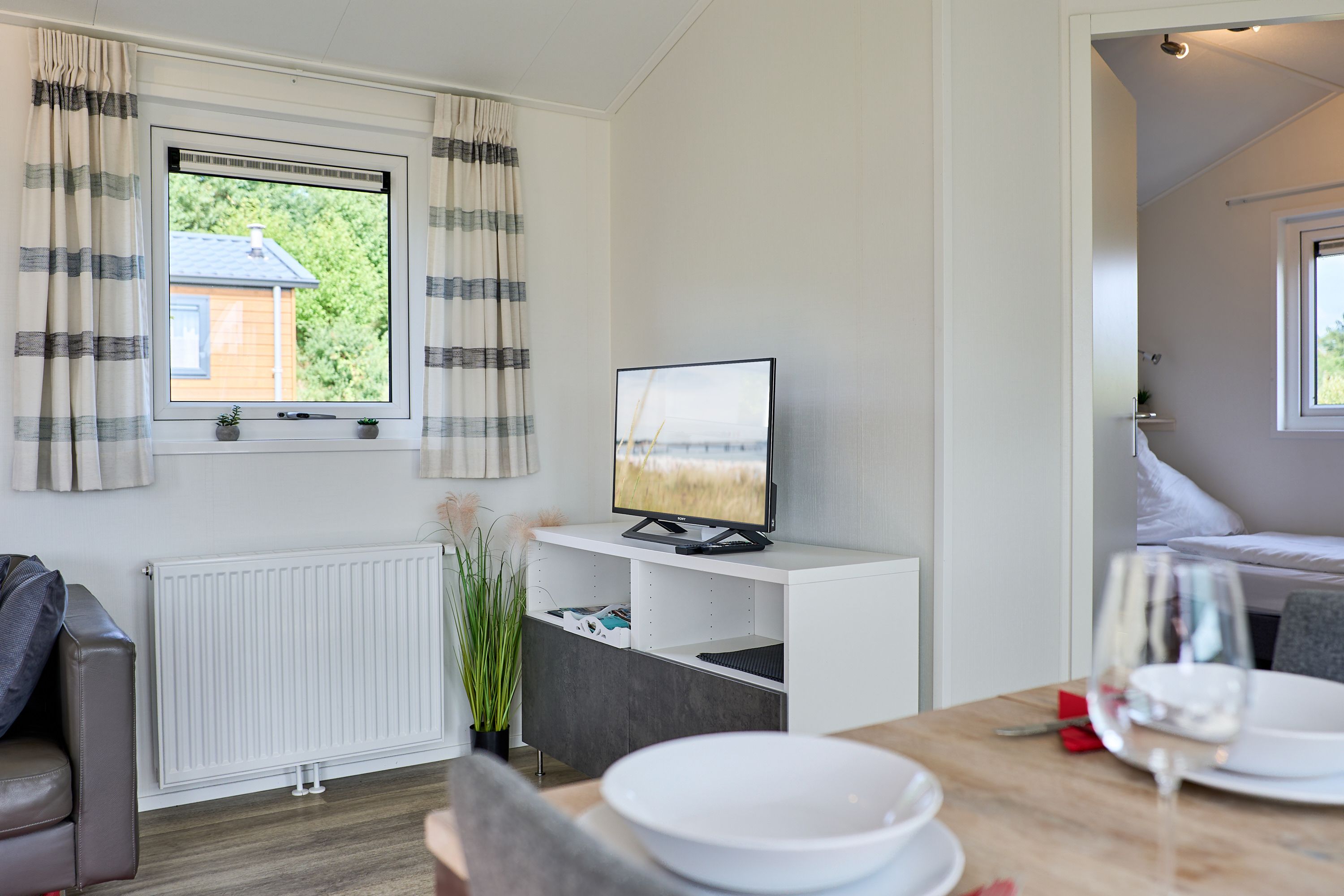 Im Inneren finden Sie eine modern gestaltete, offene Küche, die direkt in den Wohnbereich übergeht. Ausgestattet mit einem Herd, Backofen, Kühlschrank, Gefrierfach, Geschirrspüler, Kaffeemaschine, Wasserkocher, Toaster und vollständigen Küchenutensilien sowie Geschirr und Besteck, bietet die Küche beste Voraussetzungen für gemeinsame Kochabende. Am Esstisch können Sie in geselliger Runde Ihre Mahlzeiten genießen; anschließend lädt das wohnliche Sofa zum Entspannen ein. Für Unterhaltung stehen Ihnen ein TV und ein Radio zur Verfügung.