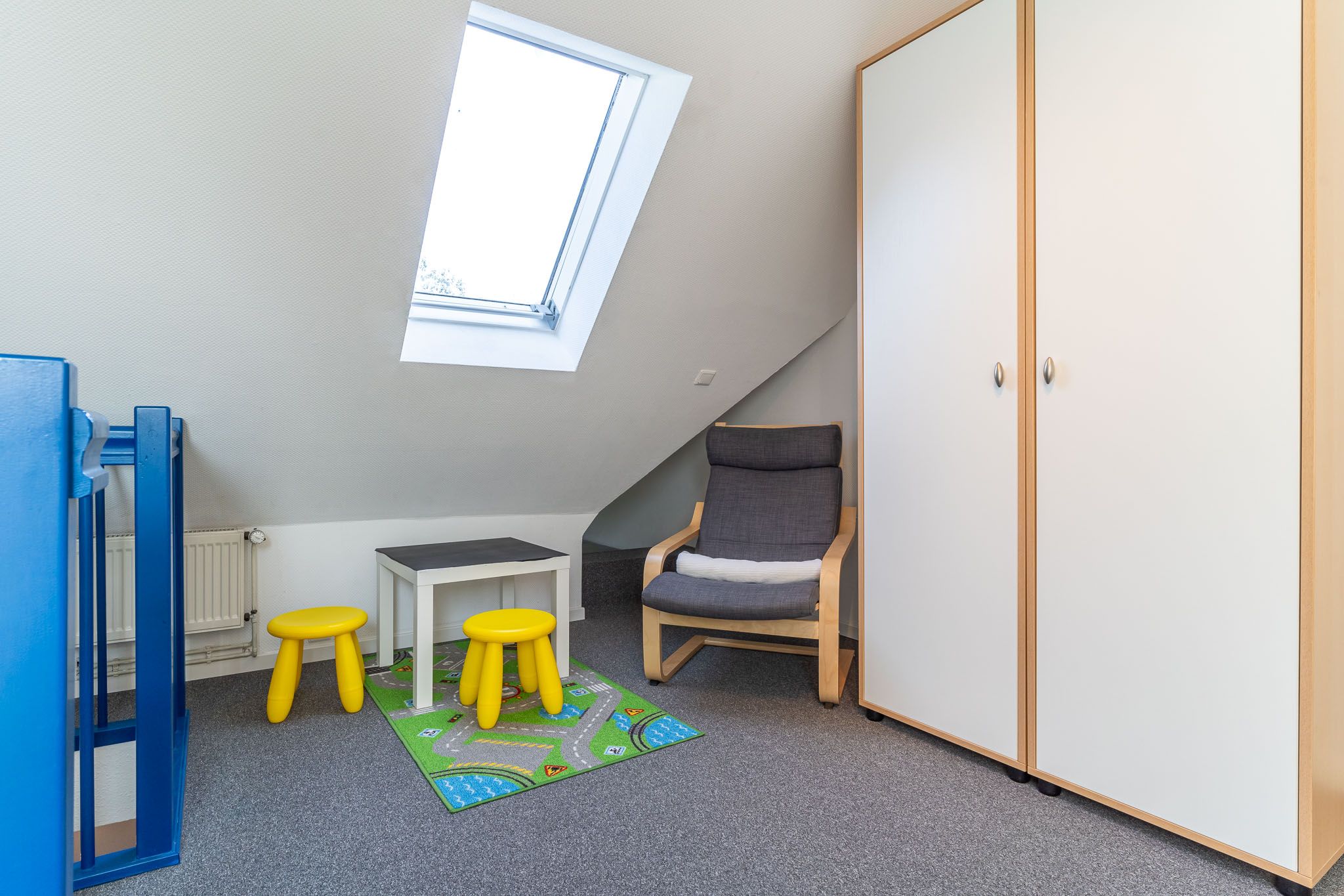 Über eine Treppe gelangen Sie in den offenen Schlafraum mit einem bequemen Boxspringbett (160x200), wo Sie sich nach einem erlebnisreichen Tag wunderbar erholen können. Genießen Sie die frische Nordseeluft auf dem Balkon, der sich im ersten Stockwerk befindet.