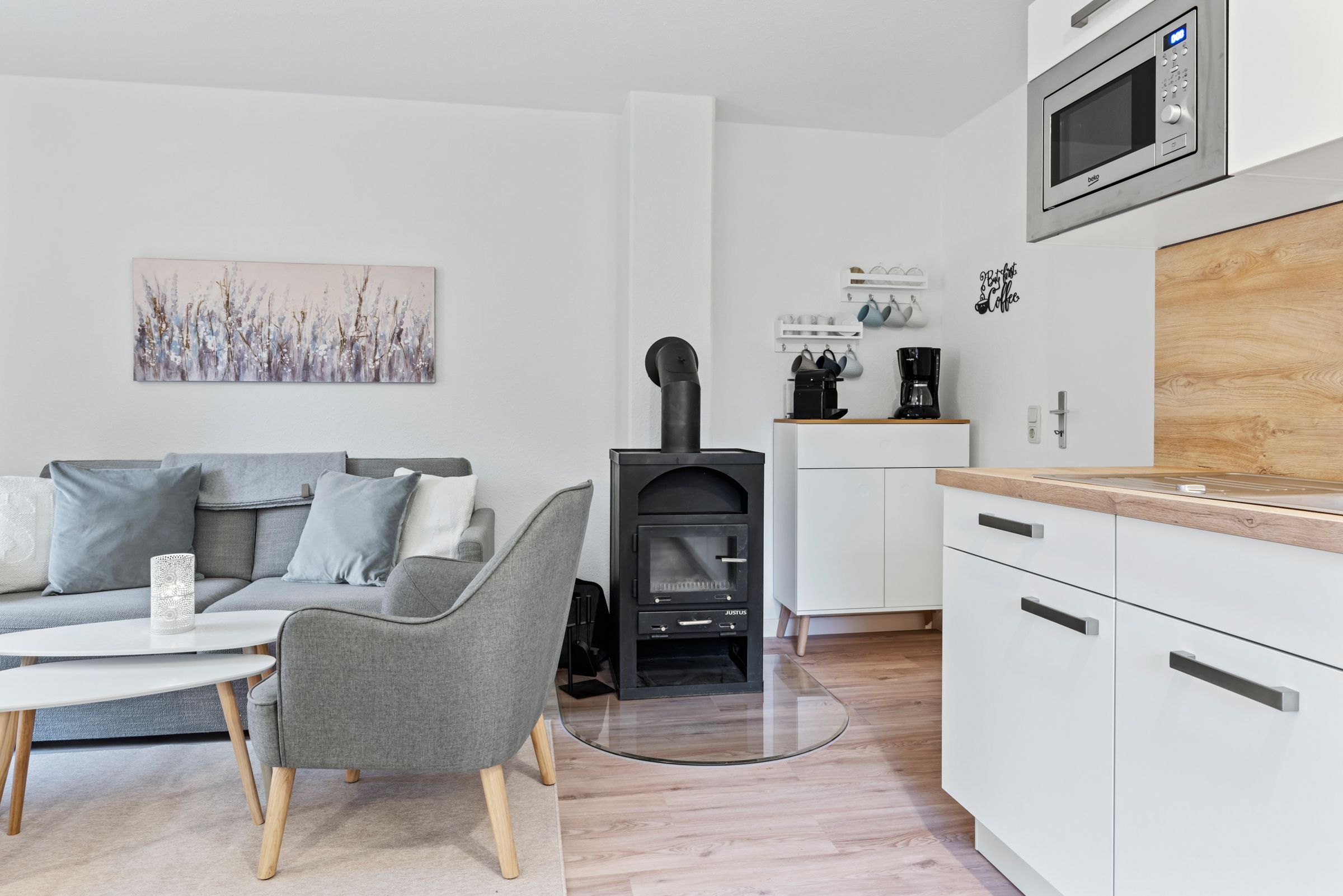 Eine voll ausgestattete offene Küche mit 4-Felder Ceranherd mit Backofen, Geschirrspüler, Mikrowelle, Wasserkocher, Kaffeefilter- und Kaffeepadmaschine (Nespresso) und Toaster sowie eine Waschmaschine, Wäscheständer, Föhn, TV, Radio, CD-Player, Bücher und Gesellschaftsspiele runden das Interieur des schönen Ferienhauses ab.