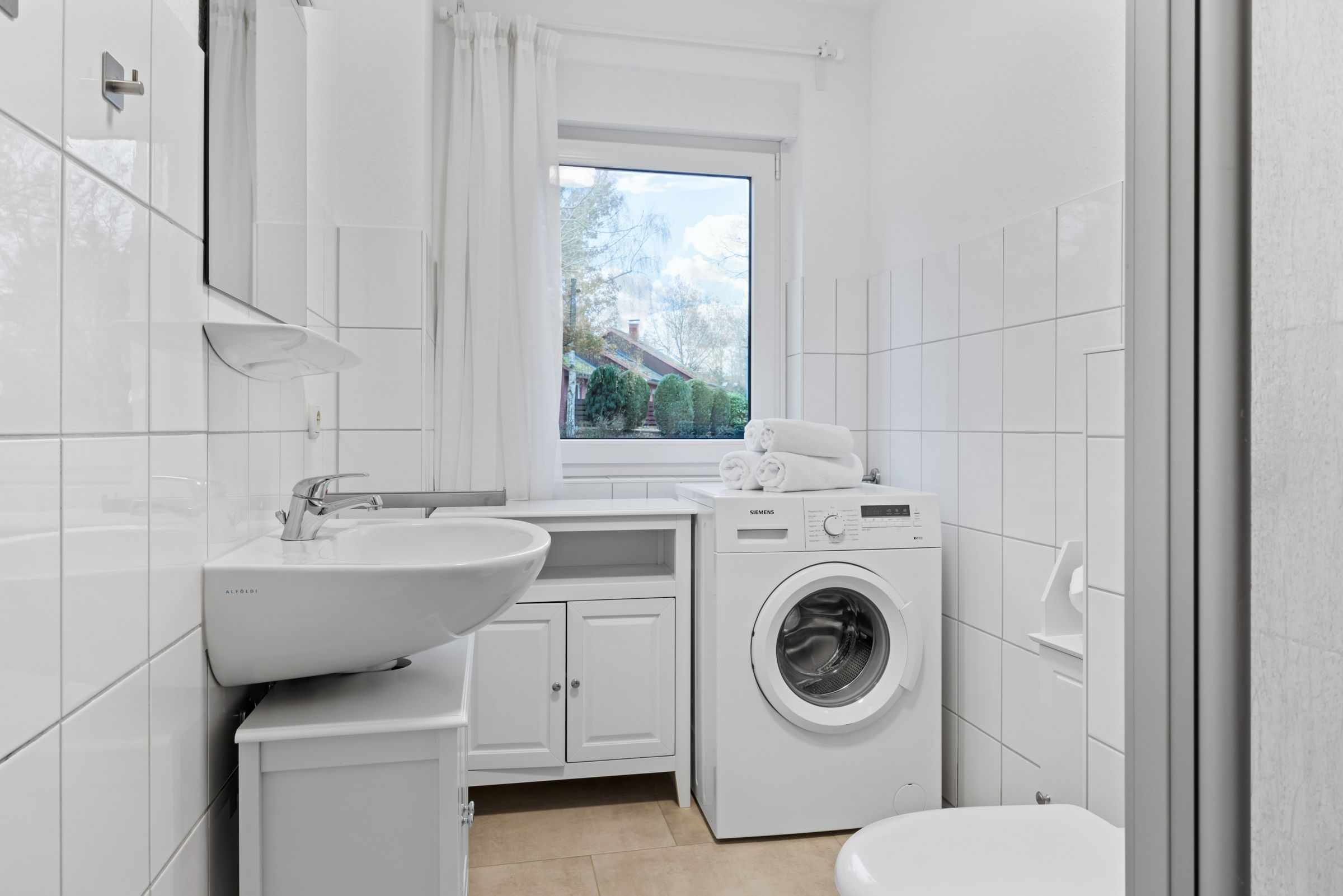 Das Badezimmer mit Badewanne befindet sich im Obergeschoss, das Duschbad im Erdgeschoss. Beide Badezimmer verfügen über Fenster und Tageslicht.