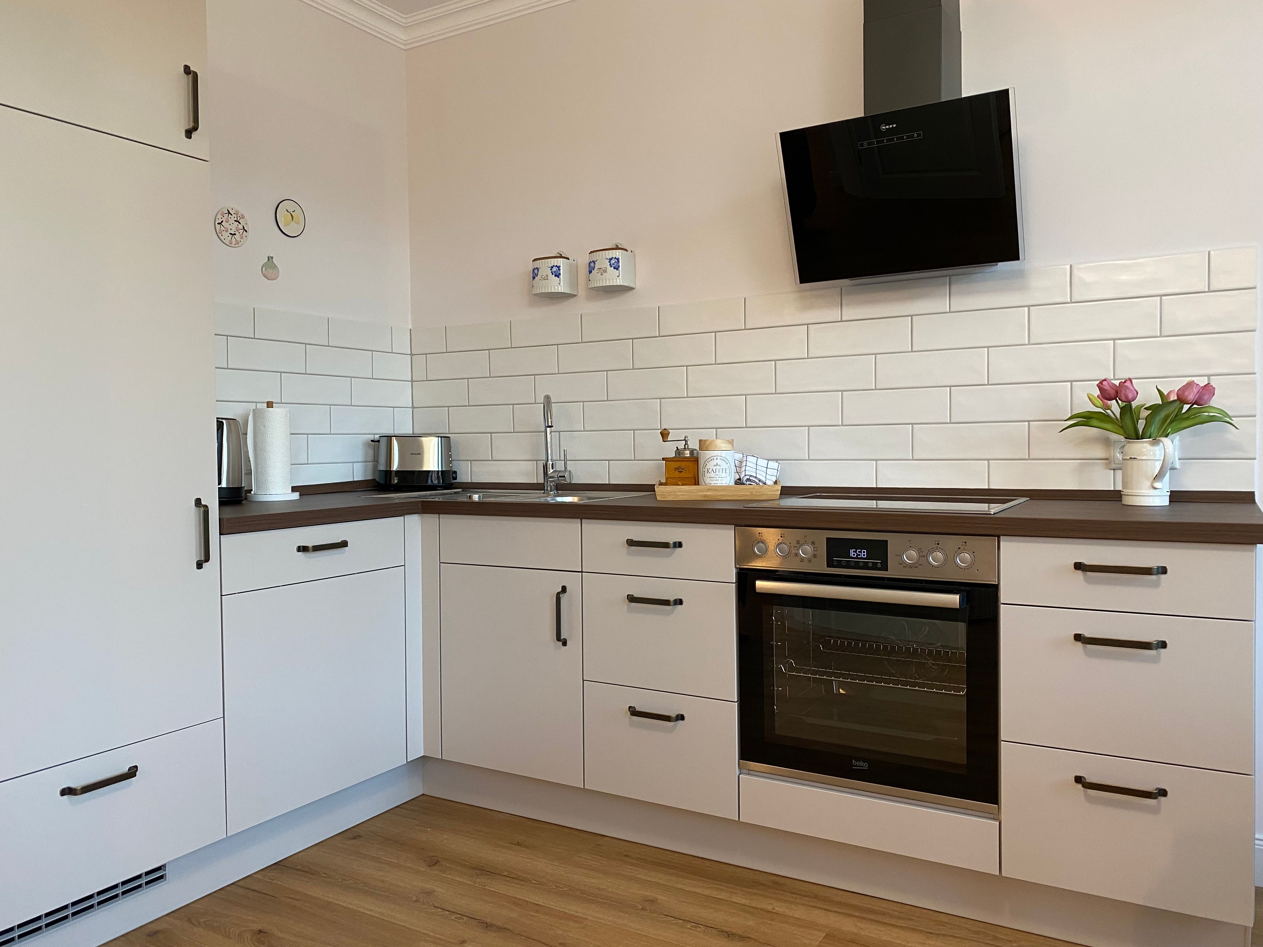 Die offene Landhausküche mit Esstisch und Stühlen, Ceranherd, Geschirrspüler, Backofen und Kühlschrank bietet alles um gemeinsam leckere Mahlzeiten zuzubereiten und zu genießen.