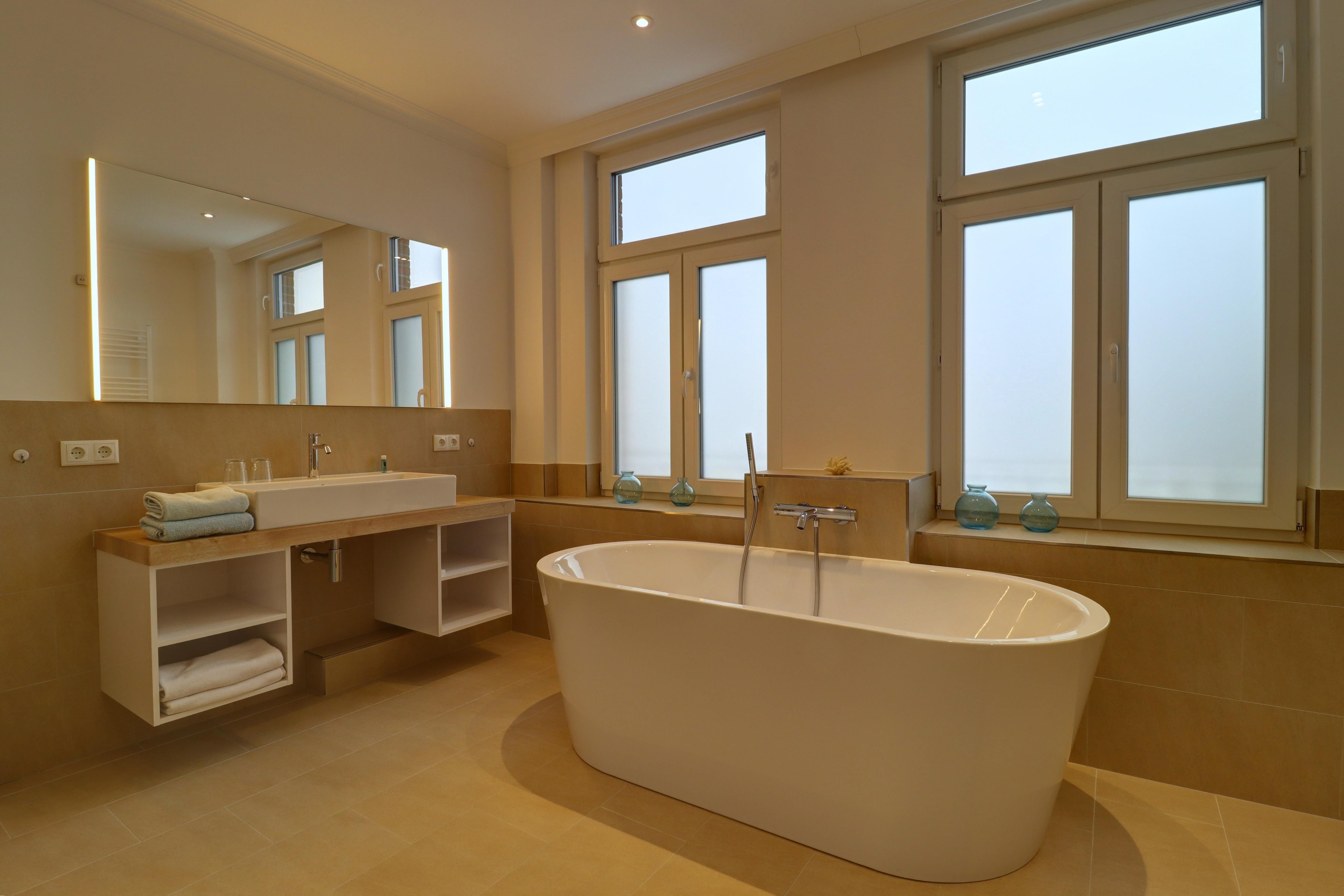 Das große, exklusive Badzimmer mit Walk-in Regendusche, einer freistehenden Badewanne, WC, Föhn und Kosmetikspiegel lässt keine Wünsche offen.