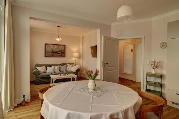 Der offenen Wohn- und Essbereich lädt zum Verweilen ein. Hier finden Sie ein einladende Couch und einen Sessel, einen Flachbild-TV und kostenfreies WLAN - perfekt für gemütliche Abende.