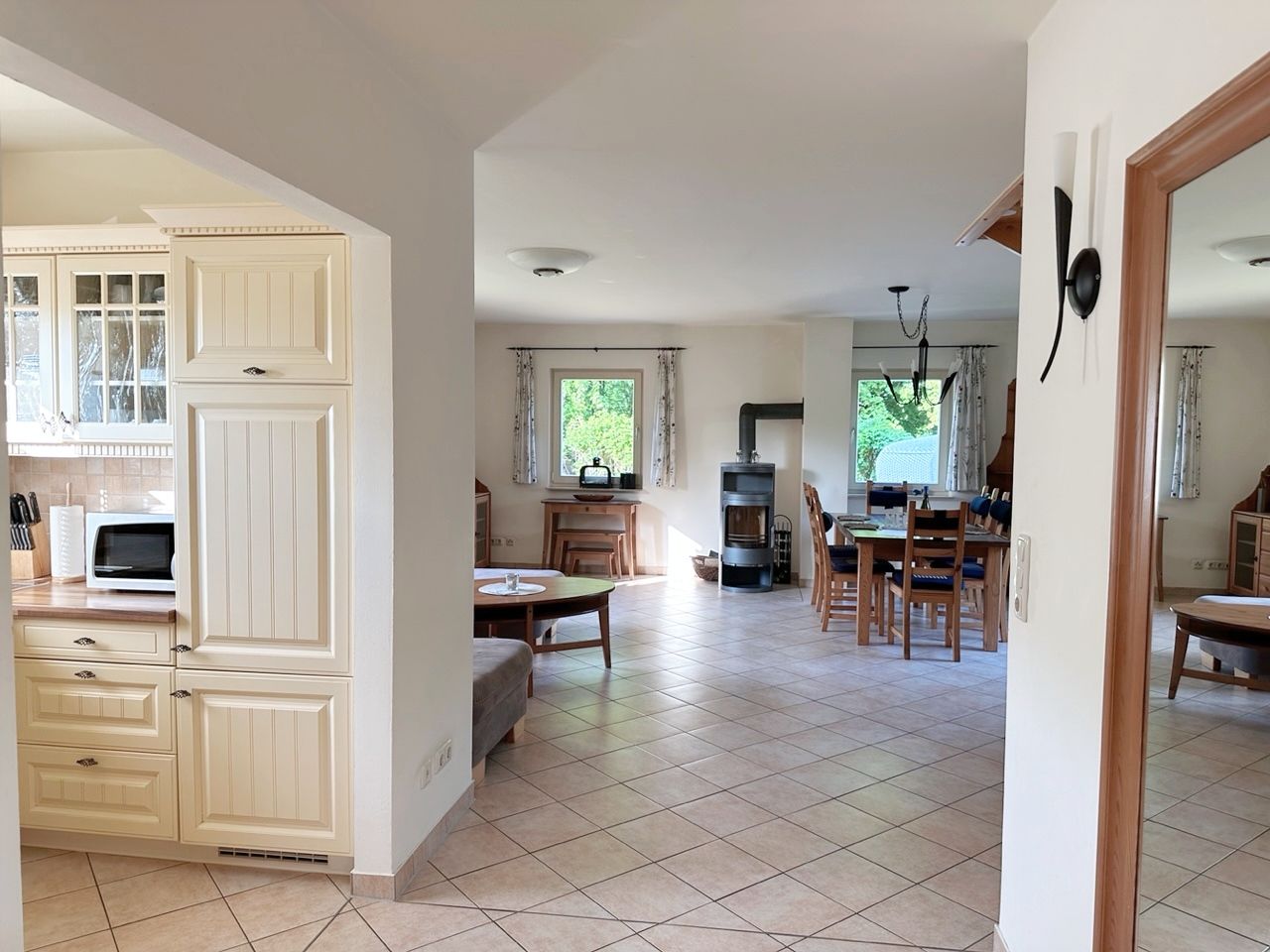 Heller, großzügiger Wohnraum mit komfortabler Sofaecke, TV, Kamin und Fußbodenheizung