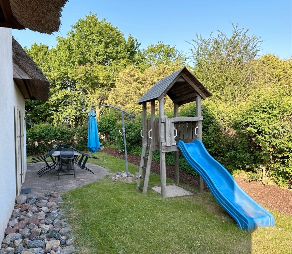 Eigener Garten mit Rutsche, Sandkasten, Gartenmöbeln und Holzkohlegrill.